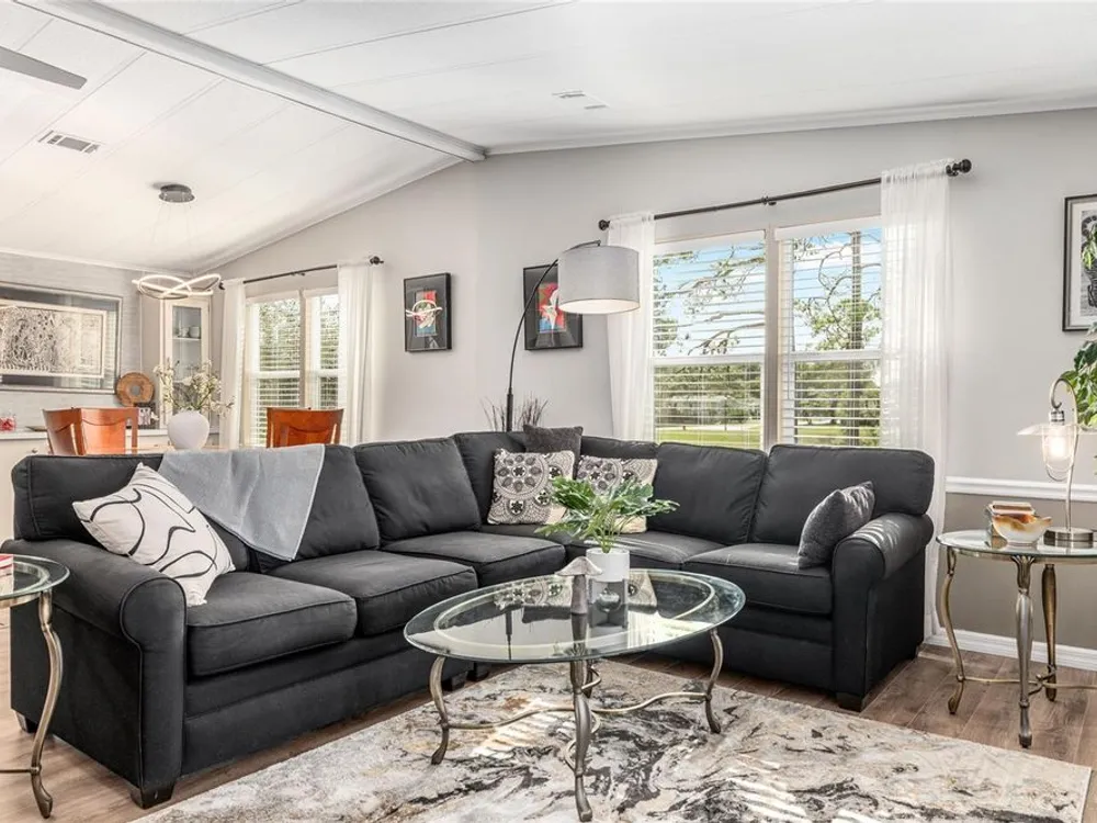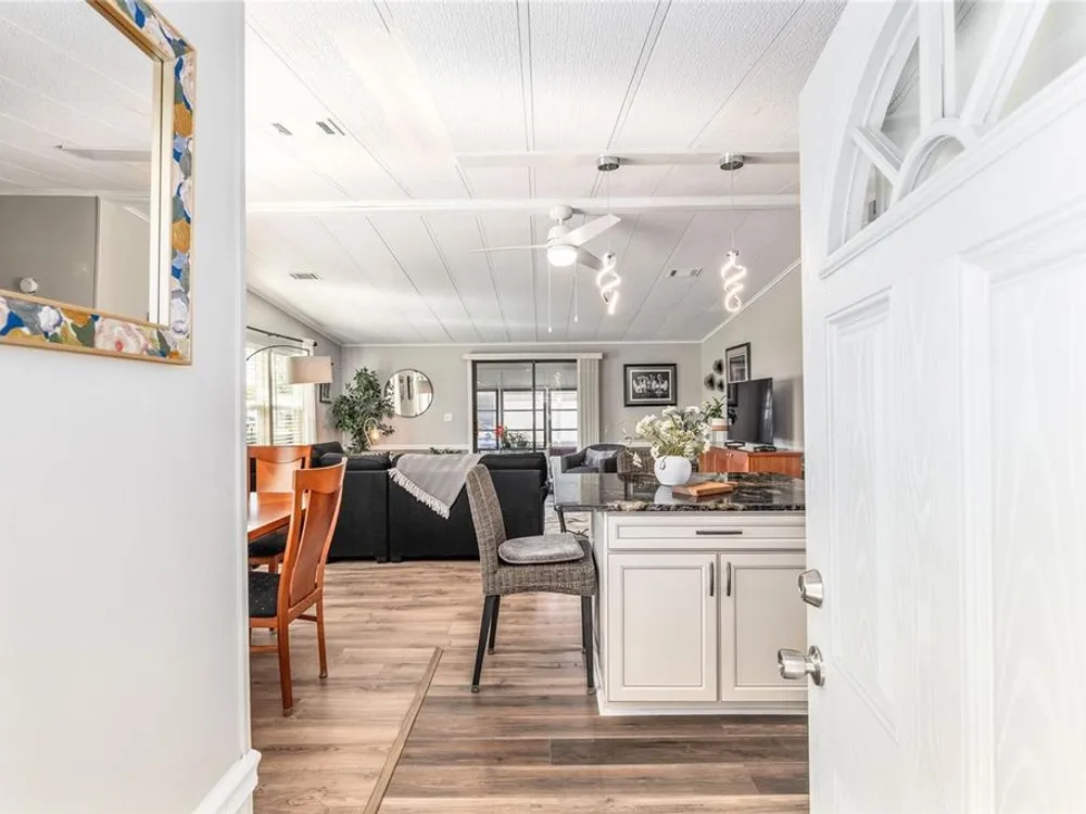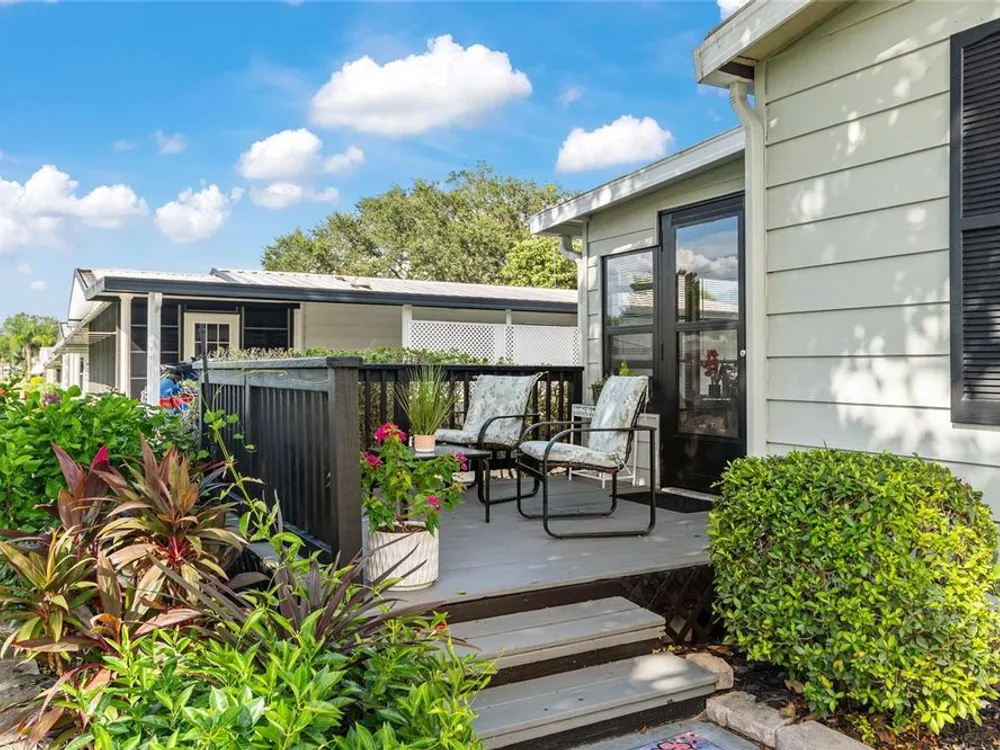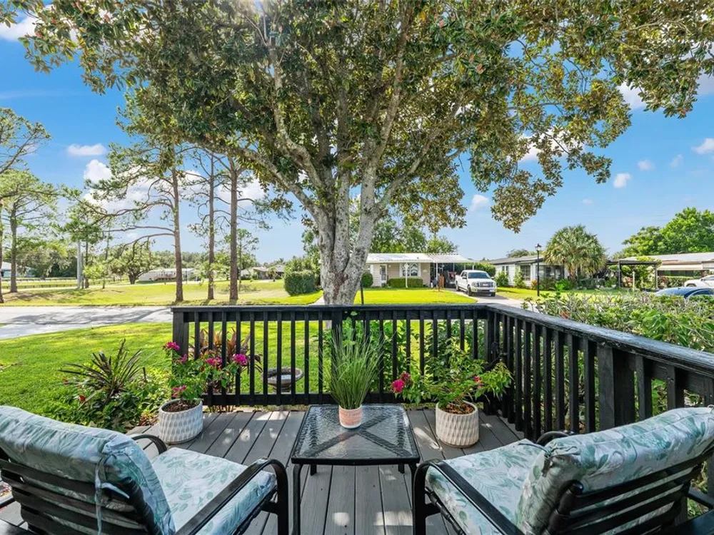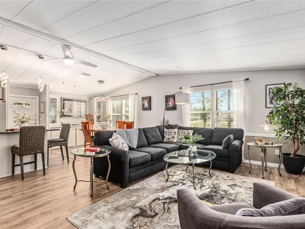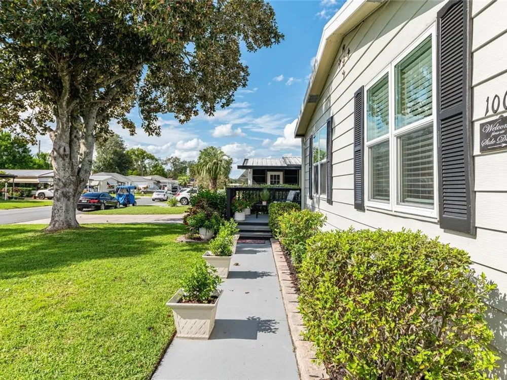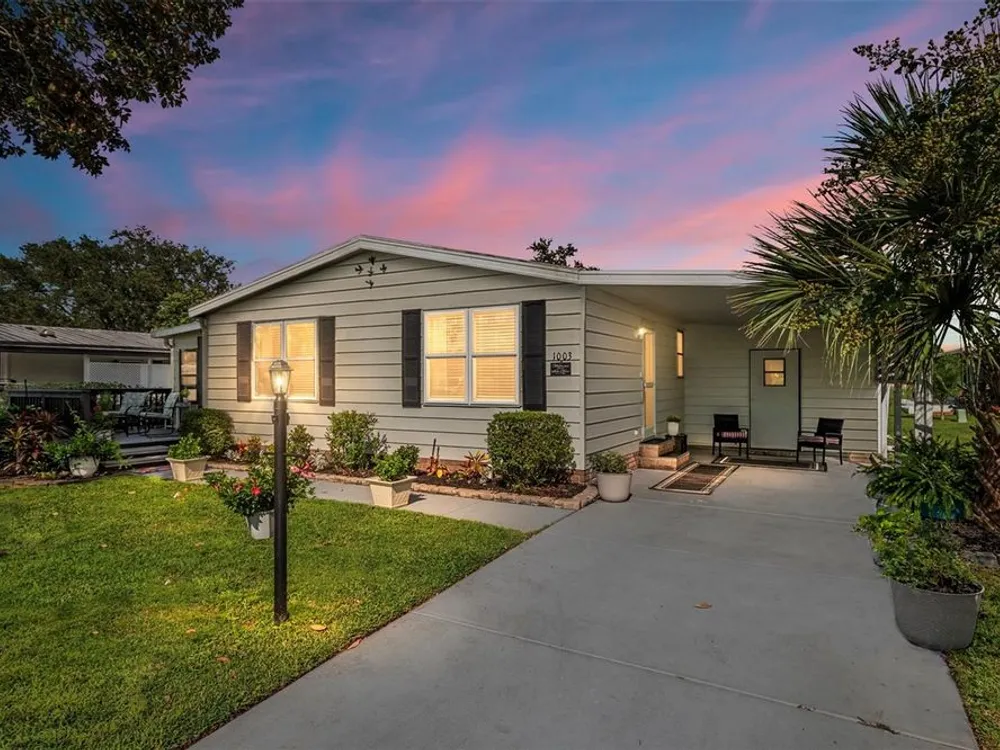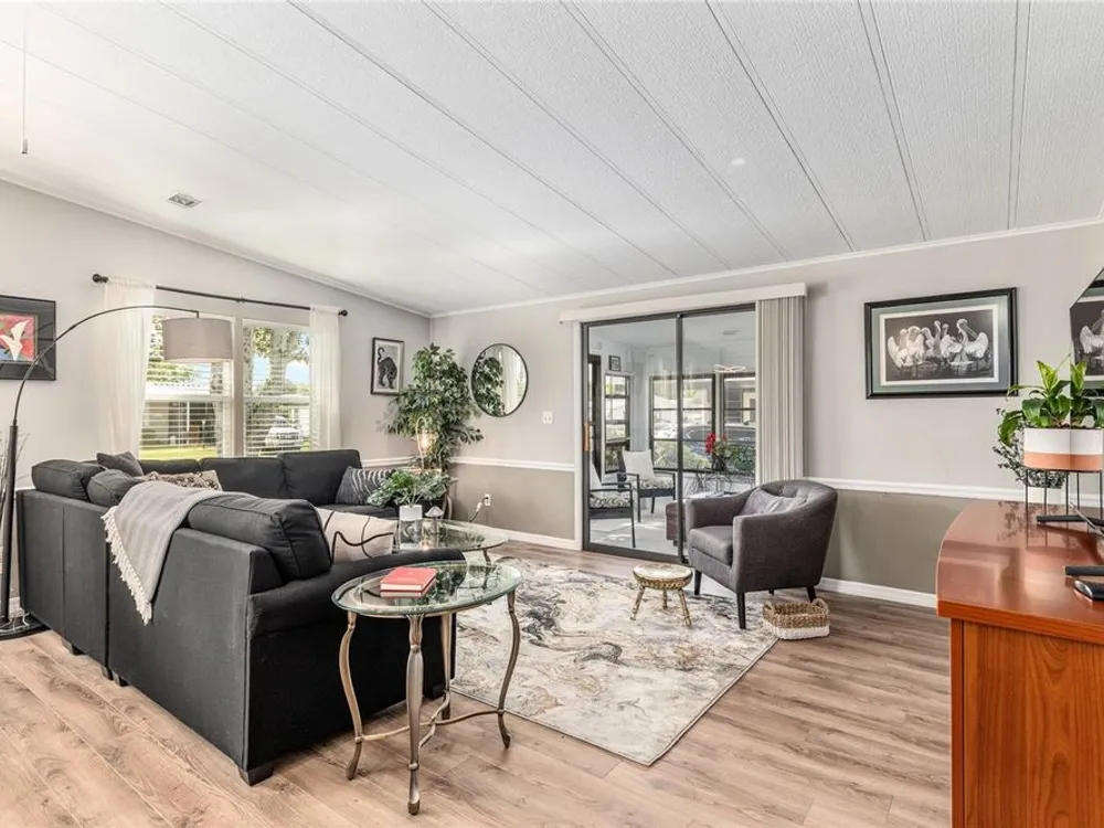 Welcome to this beautifully remodeled 2-bedroom, 2-bath manufactured home located in the desirable Village of Silver Lake, nestled within the historic side of The Villages. Every detail of this home has been thoughtfully updated to fresh, clean, and modern living. Step inside and immediately notice the stylish luxury vinyl plank (LVP) flooring (installed in 2021), paired with a sleek, modern kitchen featuring stainless steel appliances (2022), granite countertops, and contemporary sinks. A freshly painted interior (2023) creates a bright, inviting atmosphere, while new front windows (2025) bring in abundant natural light. The open-concept kitchen includes a large island perfect for casual meals, along with a separate dining area ideal for entertaining. The spacious living room and primary bedroom provide comfort and functionality, while the versatile guest bedroom includes a built-in Murphy bed—perfect for hosting or use as a home office. Enjoy your morning coffee or unwind in the evening on the lanai or front deck, which overlook a peaceful, park-like setting across the street, offering rare privacy and tranquil views.