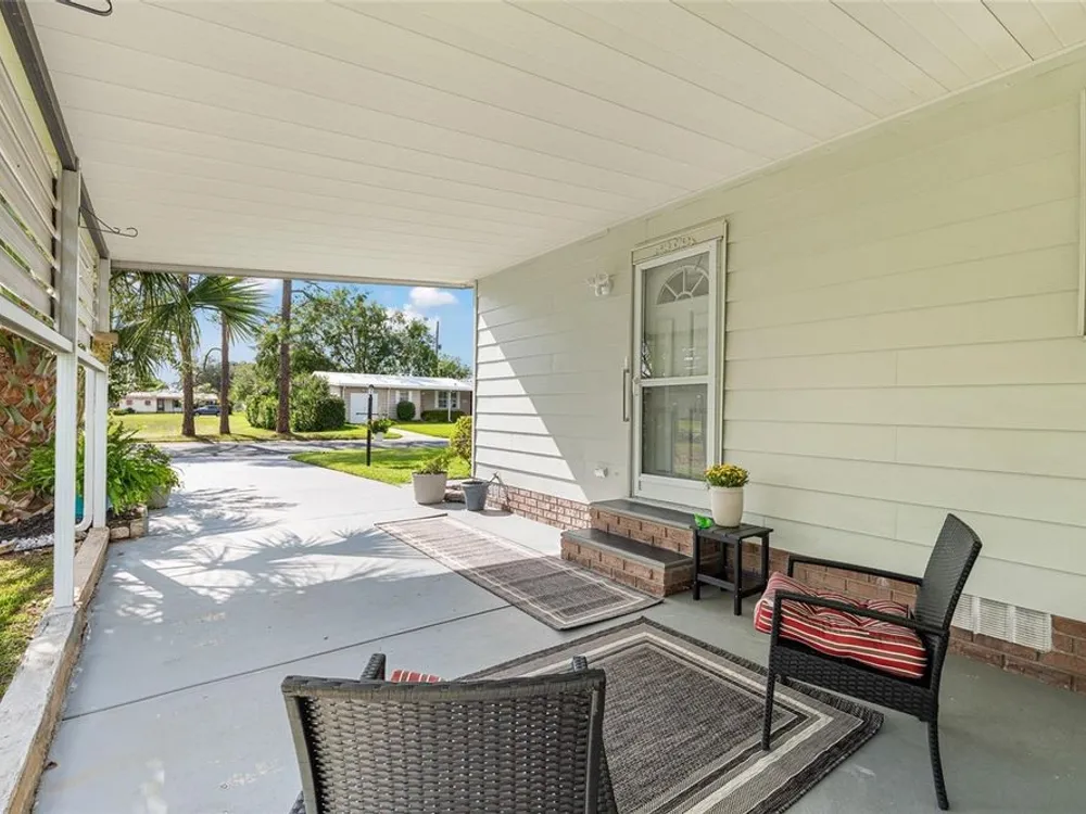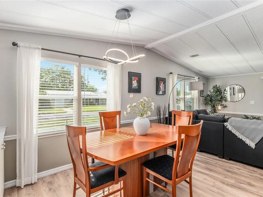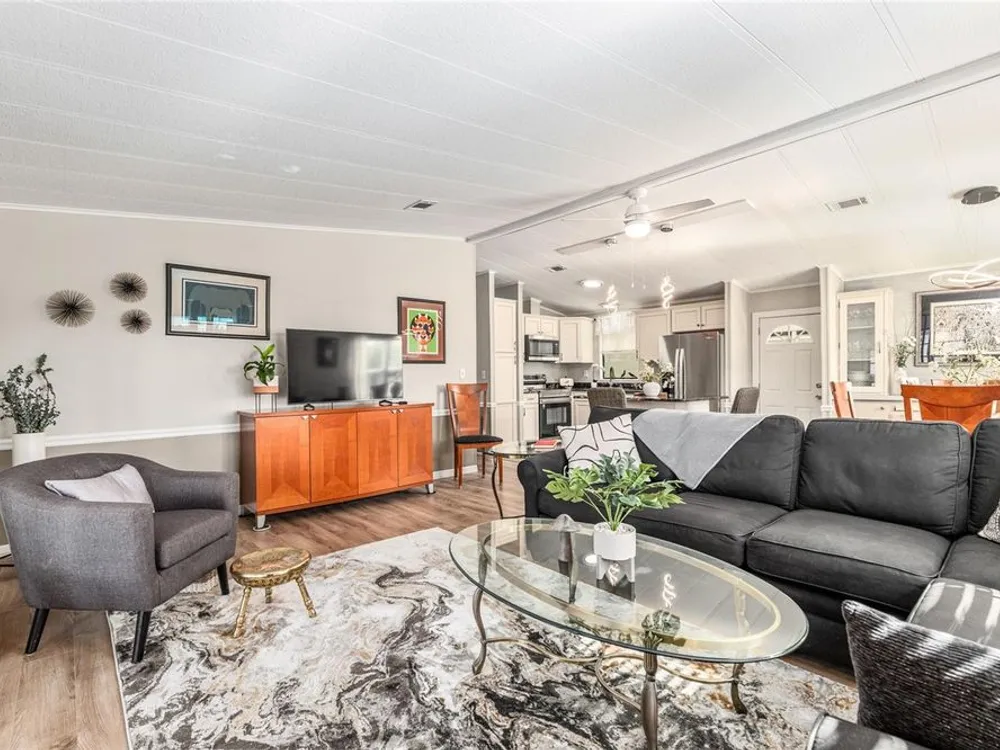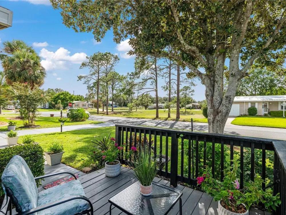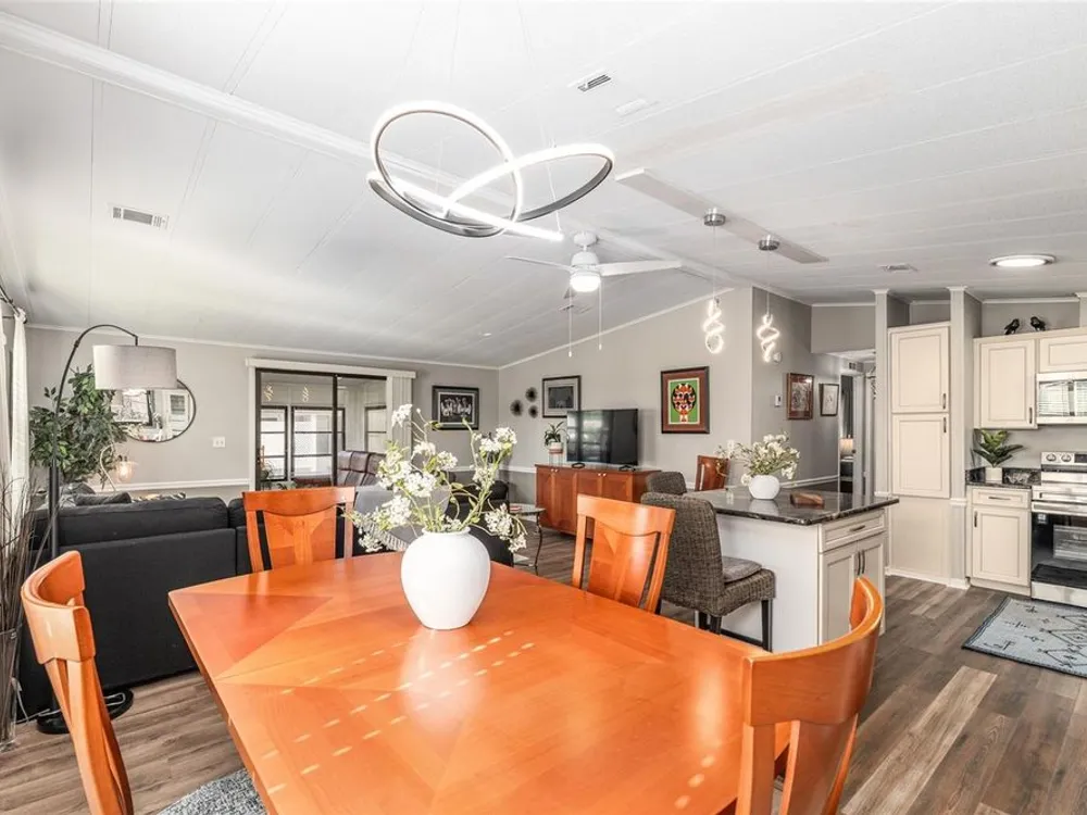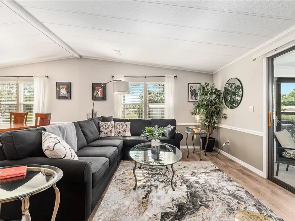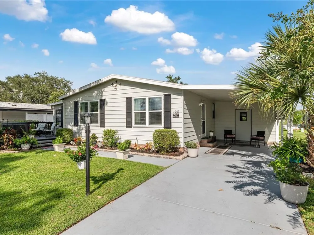 Welcome to this beautifully remodeled 2-bedroom, 2-bath manufactured home located in the desirable Village of Silver Lake, nestled within the historic side of The Villages. Every detail of this home has been thoughtfully updated to fresh, clean, and modern living. Step inside and immediately notice the stylish luxury vinyl plank (LVP) flooring (installed in 2021), paired with a sleek, modern kitchen featuring stainless steel appliances (2022), granite countertops, and contemporary sinks. A freshly painted interior (2023) creates a bright, inviting atmosphere, while new front windows (2025) bring in abundant natural light. The open-concept kitchen includes a large island perfect for casual meals, along with a separate dining area ideal for entertaining. The spacious living room and primary bedroom provide comfort and functionality, while the versatile guest bedroom includes a built-in Murphy bed—perfect for hosting or use as a home office. Enjoy your morning coffee or unwind in the evening on the lanai or front deck, which overlook a peaceful, park-like setting across the street, offering rare privacy and tranquil views.