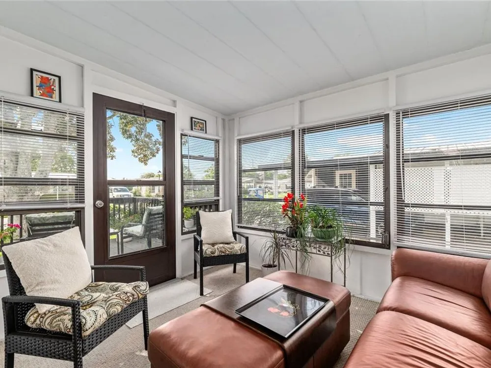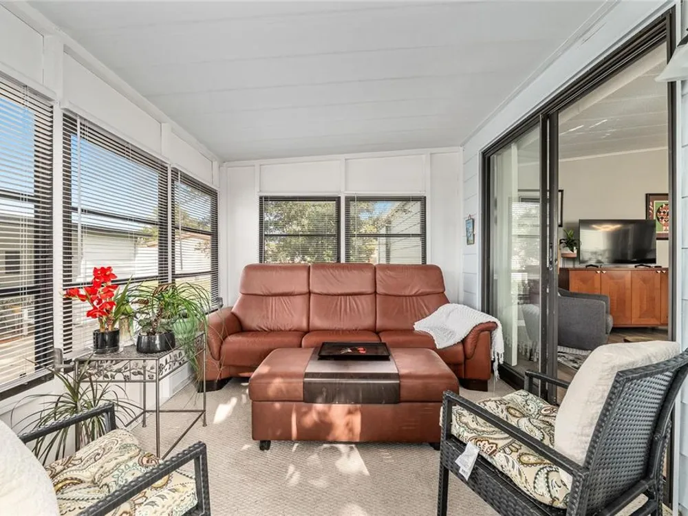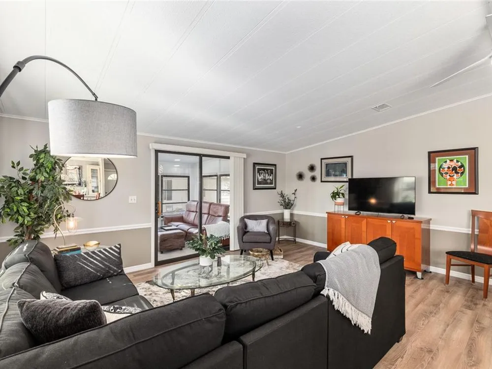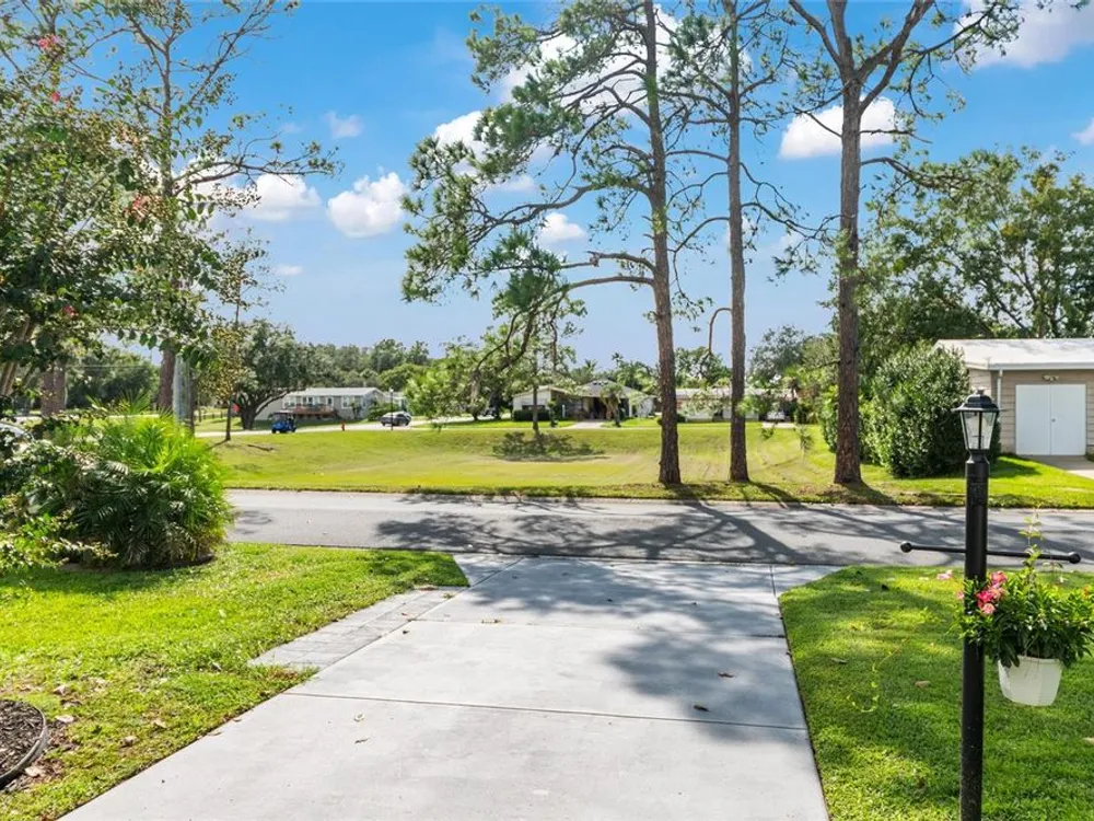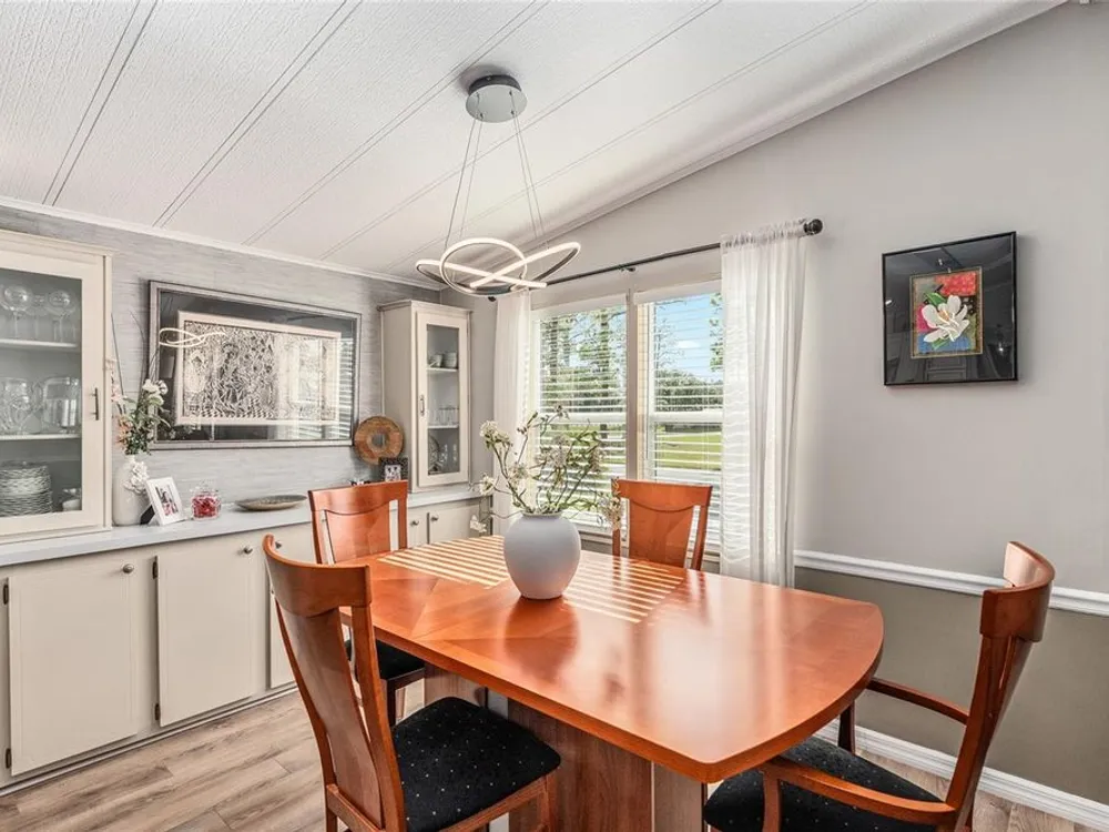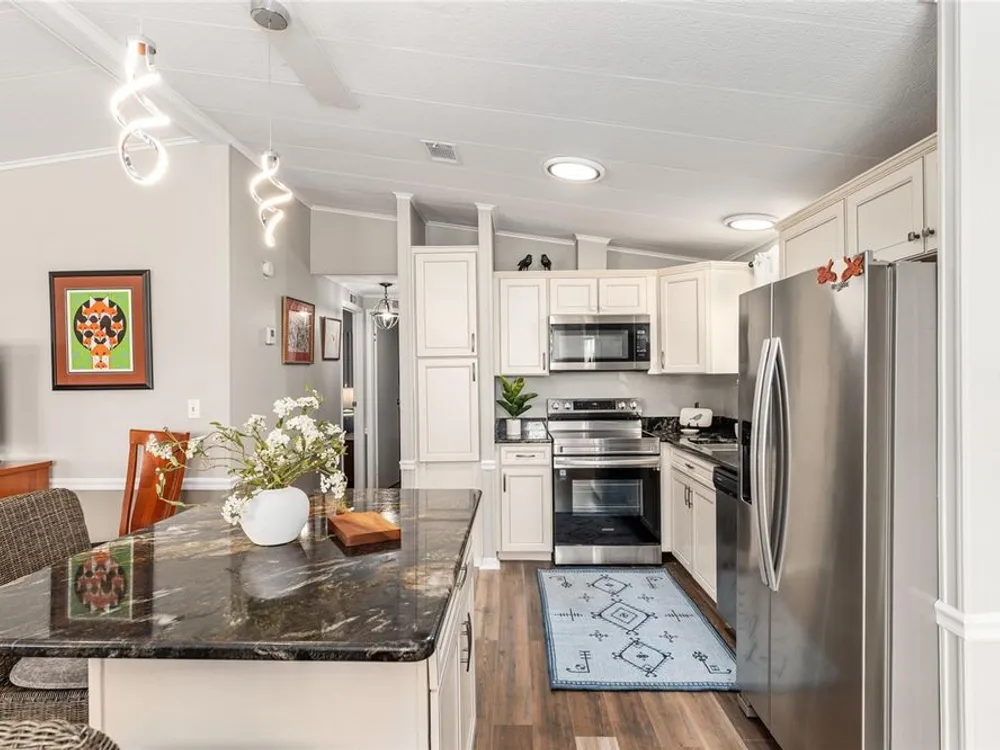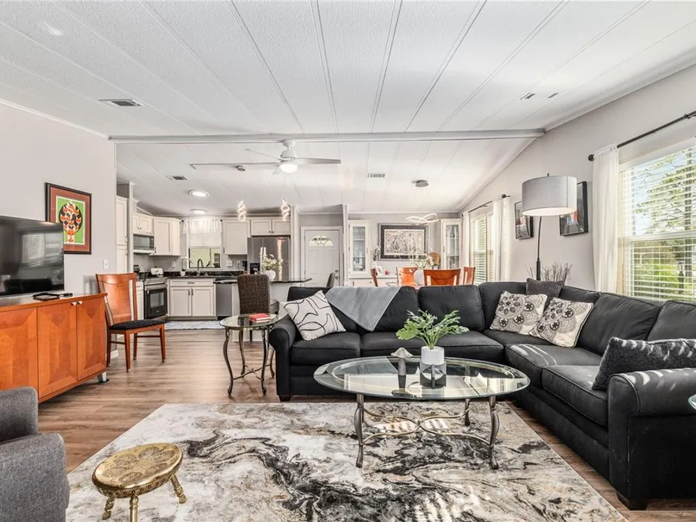 Welcome to this beautifully remodeled 2-bedroom, 2-bath manufactured home located in the desirable Village of Silver Lake, nestled within the historic side of The Villages. Every detail of this home has been thoughtfully updated to fresh, clean, and modern living. Step inside and immediately notice the stylish luxury vinyl plank (LVP) flooring (installed in 2021), paired with a sleek, modern kitchen featuring stainless steel appliances (2022), granite countertops, and contemporary sinks. A freshly painted interior (2023) creates a bright, inviting atmosphere, while new front windows (2025) bring in abundant natural light. The open-concept kitchen includes a large island perfect for casual meals, along with a separate dining area ideal for entertaining. The spacious living room and primary bedroom provide comfort and functionality, while the versatile guest bedroom includes a built-in Murphy bed—perfect for hosting or use as a home office. Enjoy your morning coffee or unwind in the evening on the lanai or front deck, which overlook a peaceful, park-like setting across the street, offering rare privacy and tranquil views.