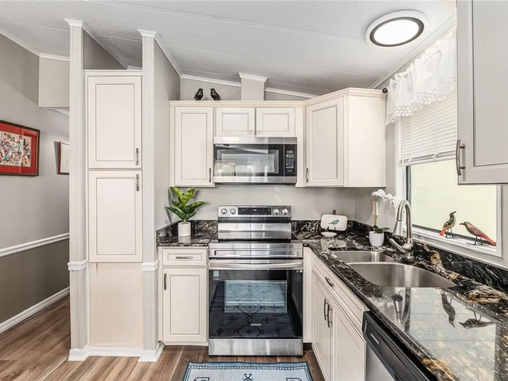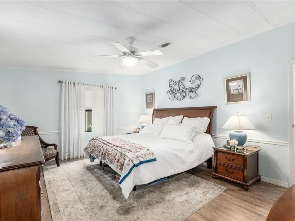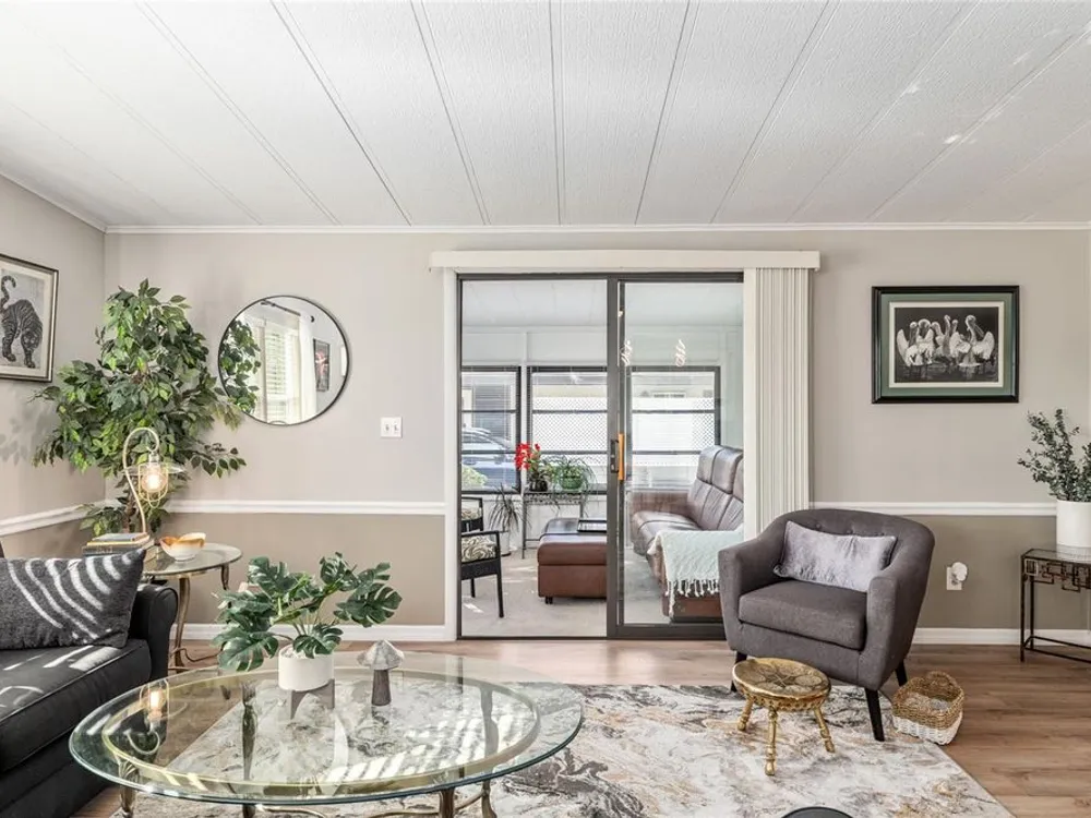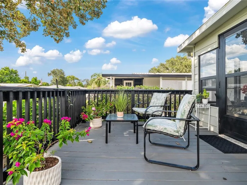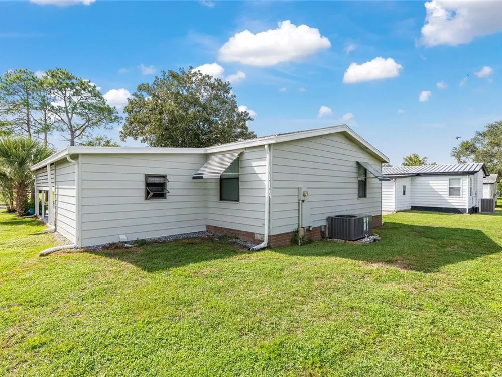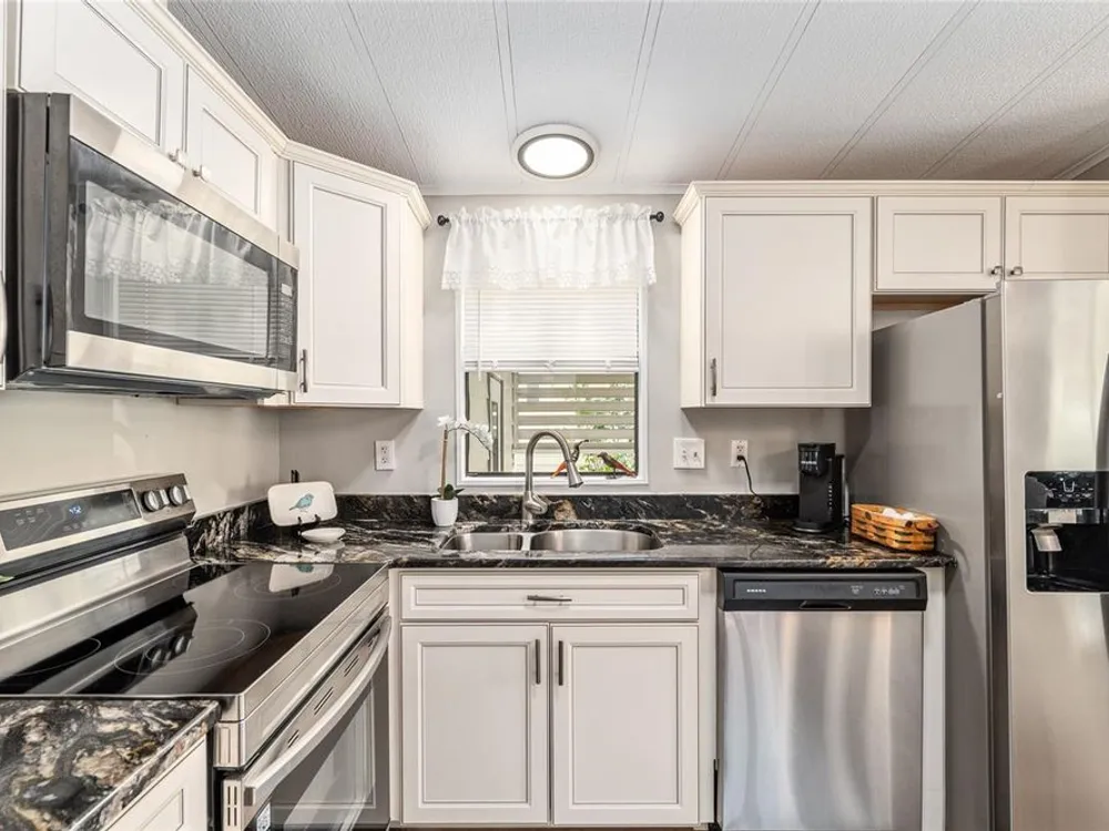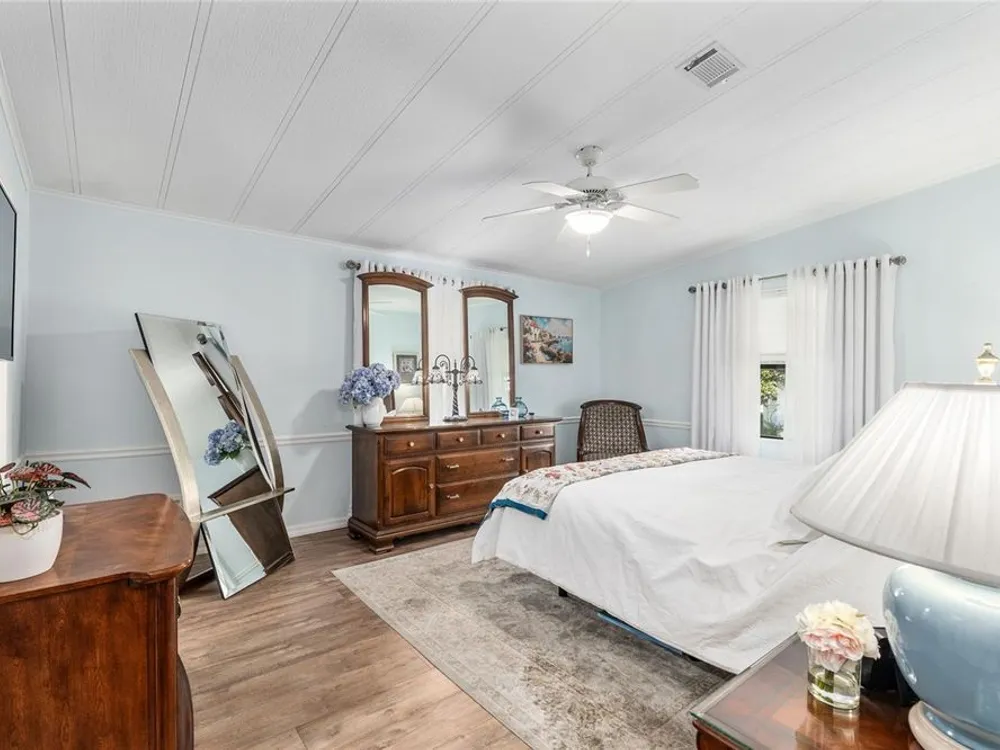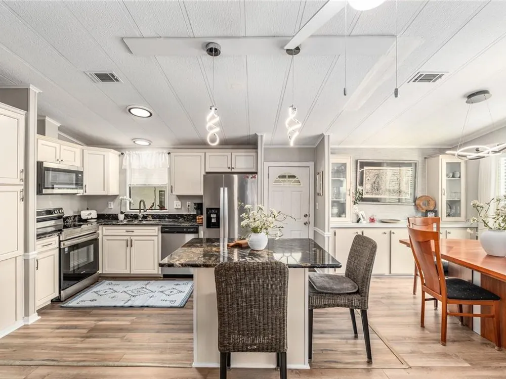 Welcome to this beautifully remodeled 2-bedroom, 2-bath manufactured home located in the desirable Village of Silver Lake, nestled within the historic side of The Villages. Every detail of this home has been thoughtfully updated to fresh, clean, and modern living. Step inside and immediately notice the stylish luxury vinyl plank (LVP) flooring (installed in 2021), paired with a sleek, modern kitchen featuring stainless steel appliances (2022), granite countertops, and contemporary sinks. A freshly painted interior (2023) creates a bright, inviting atmosphere, while new front windows (2025) bring in abundant natural light. The open-concept kitchen includes a large island perfect for casual meals, along with a separate dining area ideal for entertaining. The spacious living room and primary bedroom provide comfort and functionality, while the versatile guest bedroom includes a built-in Murphy bed—perfect for hosting or use as a home office. Enjoy your morning coffee or unwind in the evening on the lanai or front deck, which overlook a peaceful, park-like setting across the street, offering rare privacy and tranquil views.