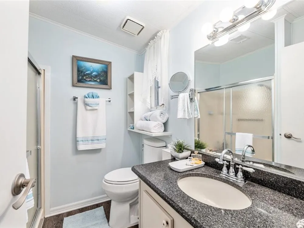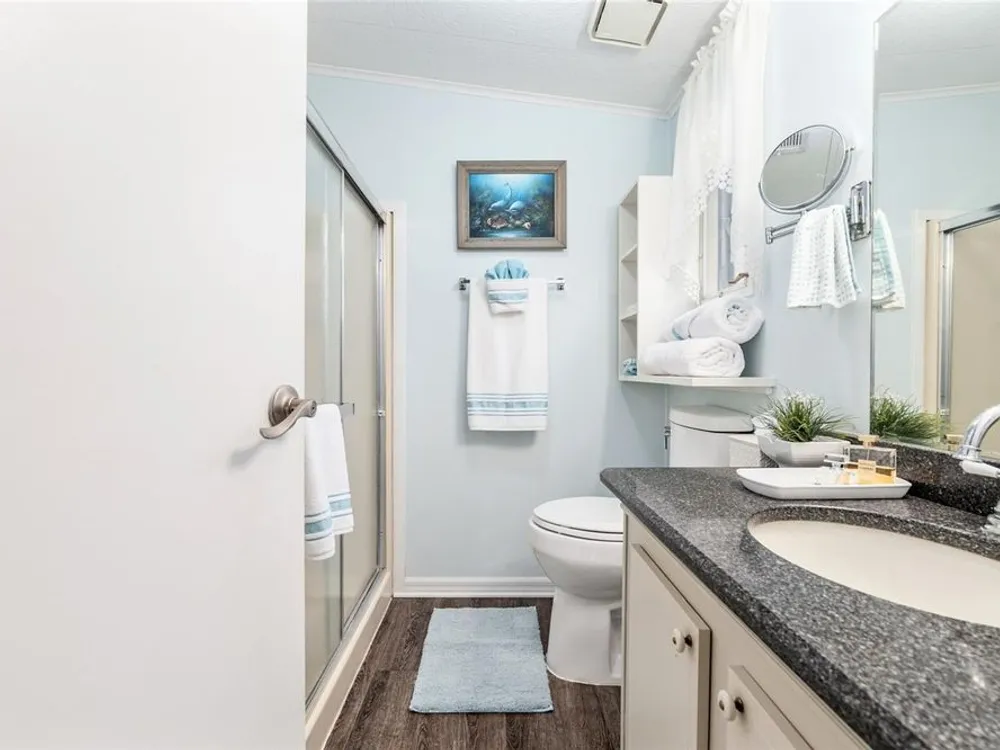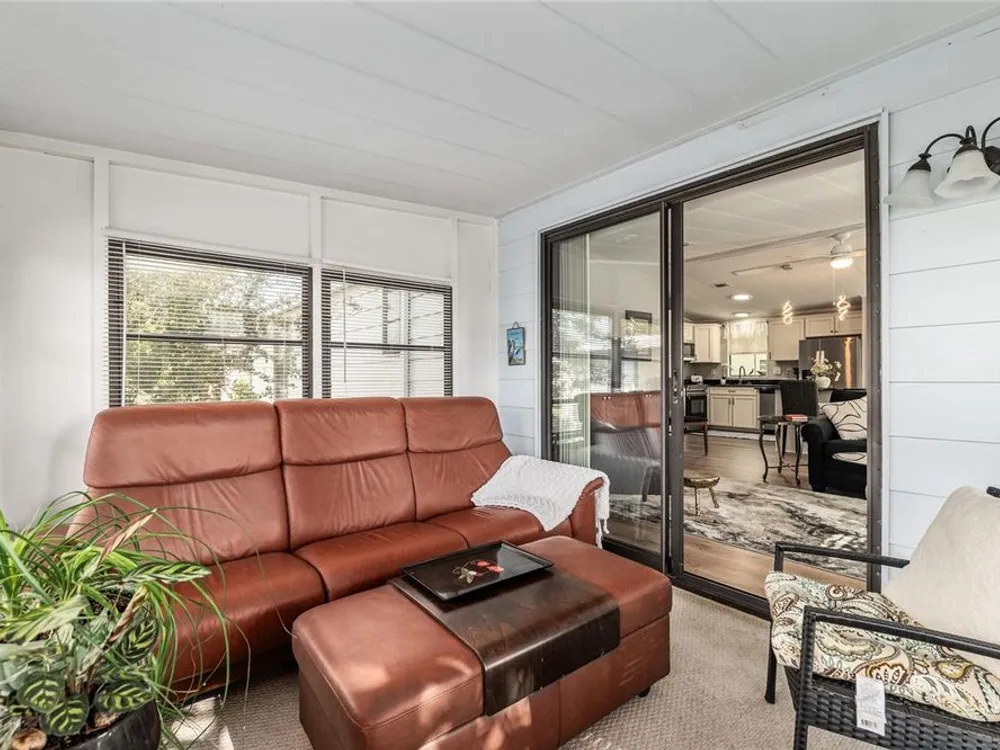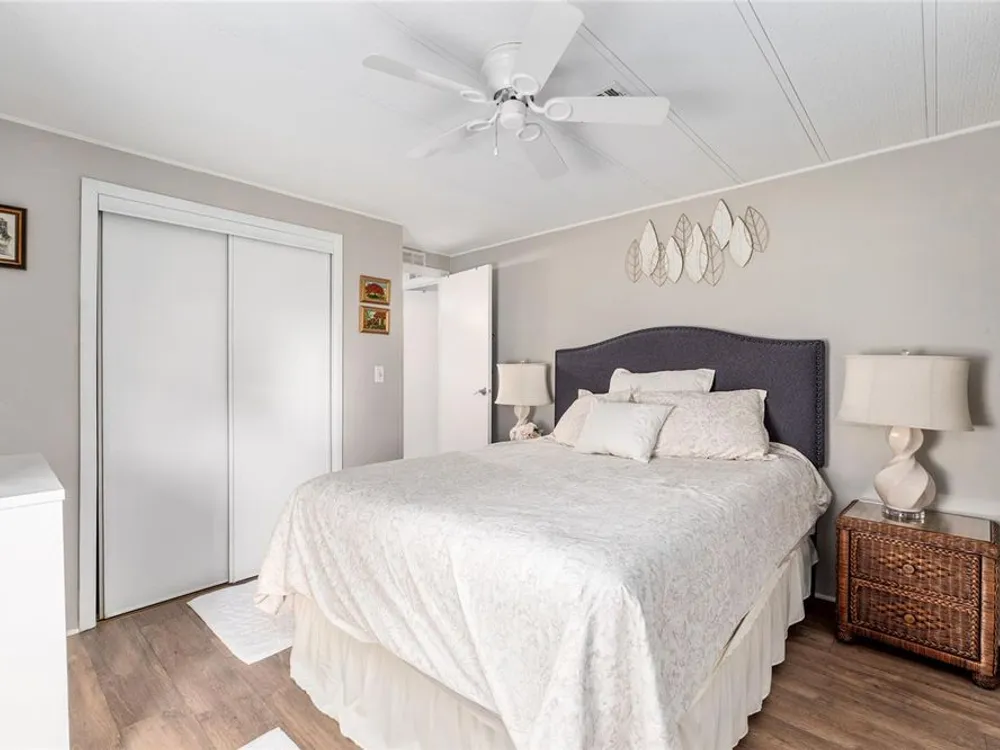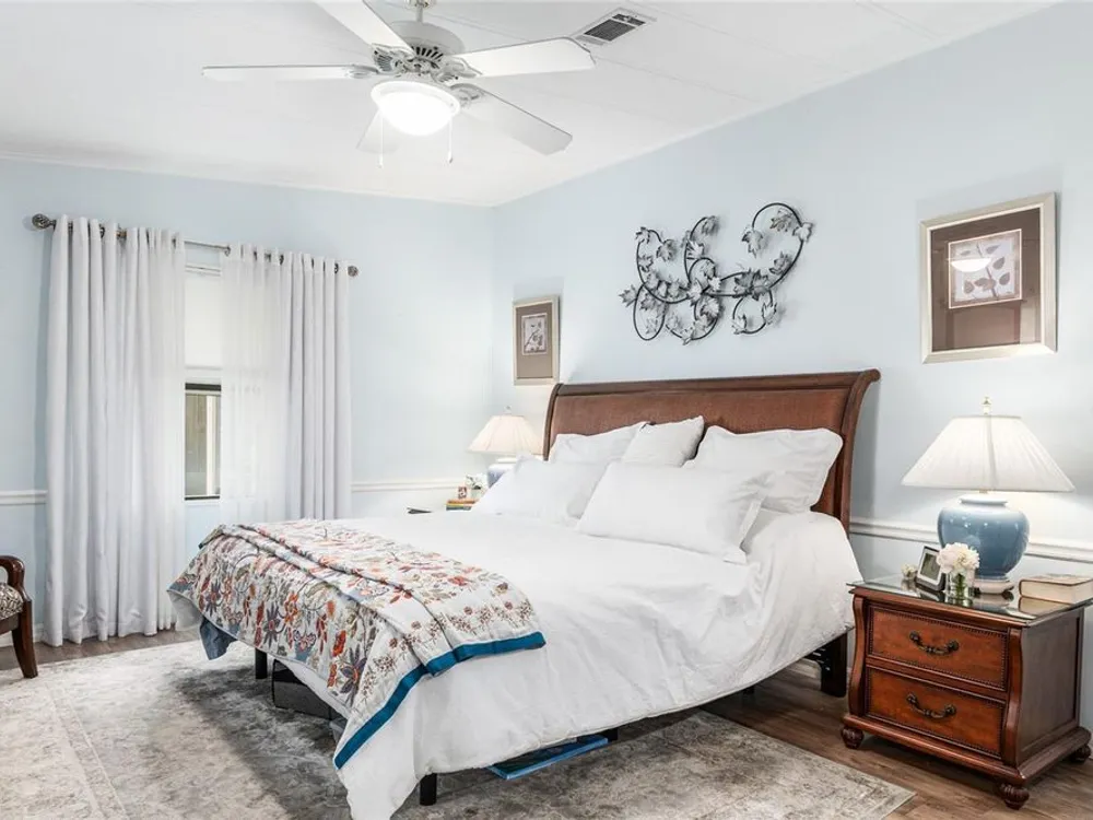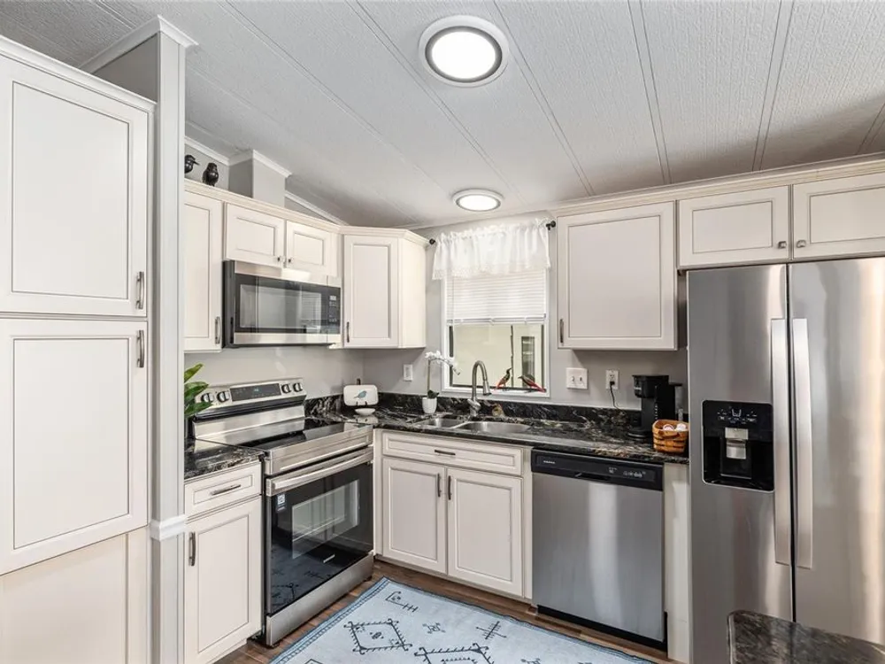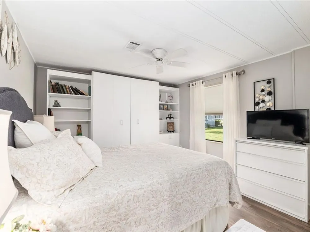 Welcome to this beautifully remodeled 2-bedroom, 2-bath manufactured home located in the desirable Village of Silver Lake, nestled within the historic side of The Villages. Every detail of this home has been thoughtfully updated to fresh, clean, and modern living. Step inside and immediately notice the stylish luxury vinyl plank (LVP) flooring (installed in 2021), paired with a sleek, modern kitchen featuring stainless steel appliances (2022), granite countertops, and contemporary sinks. A freshly painted interior (2023) creates a bright, inviting atmosphere, while new front windows (2025) bring in abundant natural light. The open-concept kitchen includes a large island perfect for casual meals, along with a separate dining area ideal for entertaining. The spacious living room and primary bedroom provide comfort and functionality, while the versatile guest bedroom includes a built-in Murphy bed—perfect for hosting or use as a home office. Enjoy your morning coffee or unwind in the evening on the lanai or front deck, which overlook a peaceful, park-like setting across the street, offering rare privacy and tranquil views.