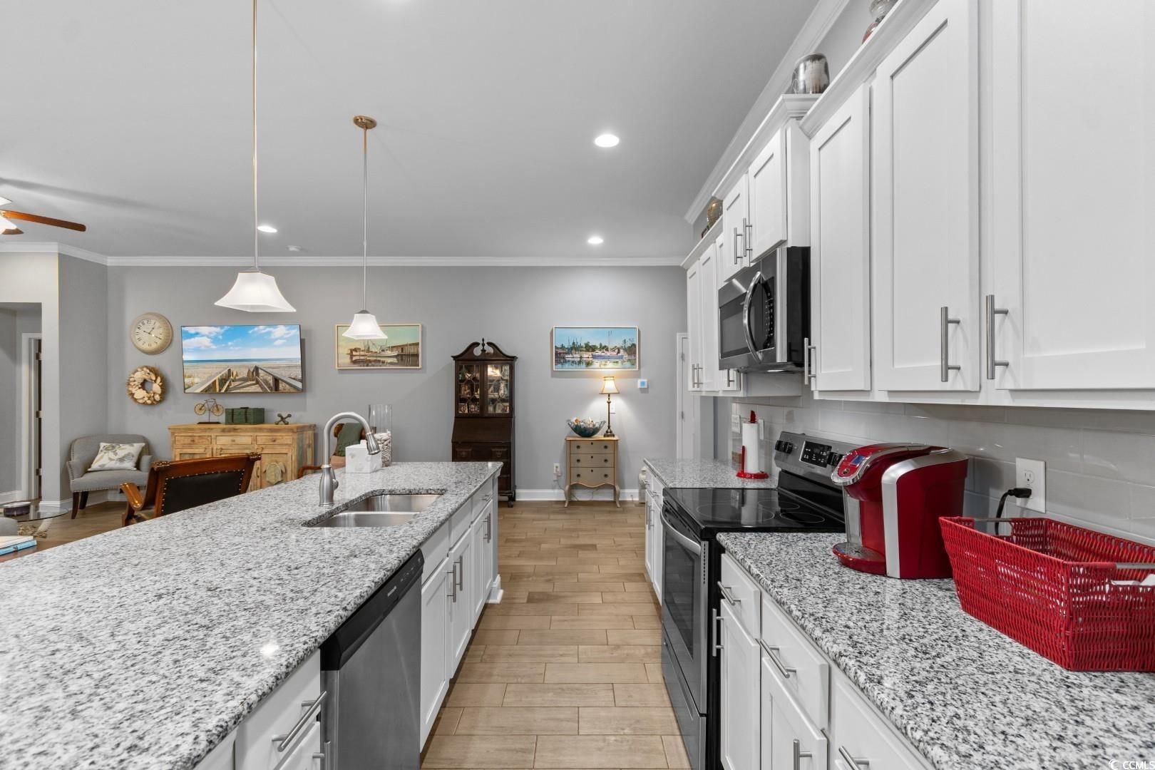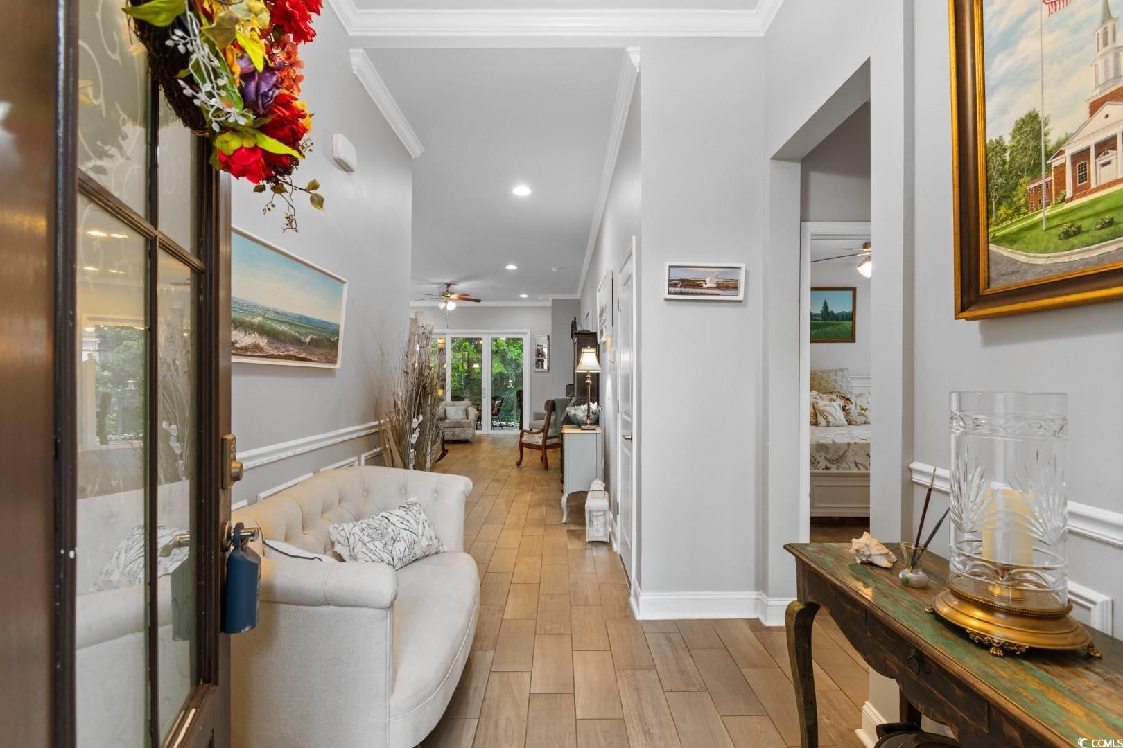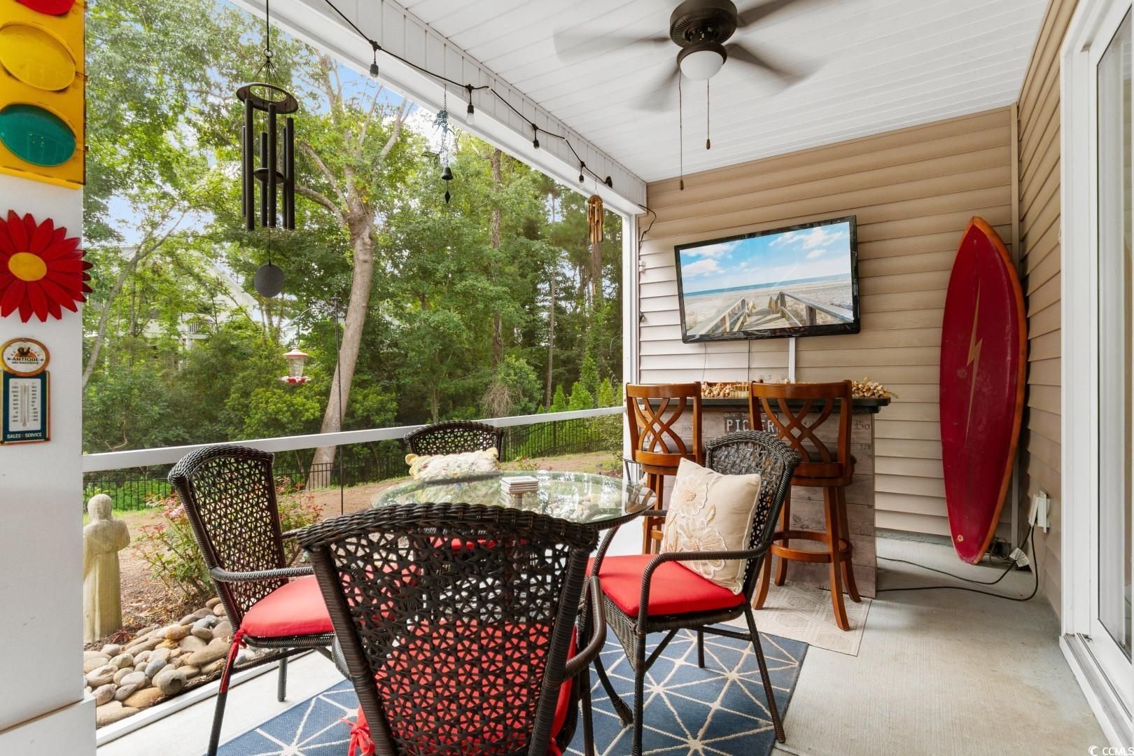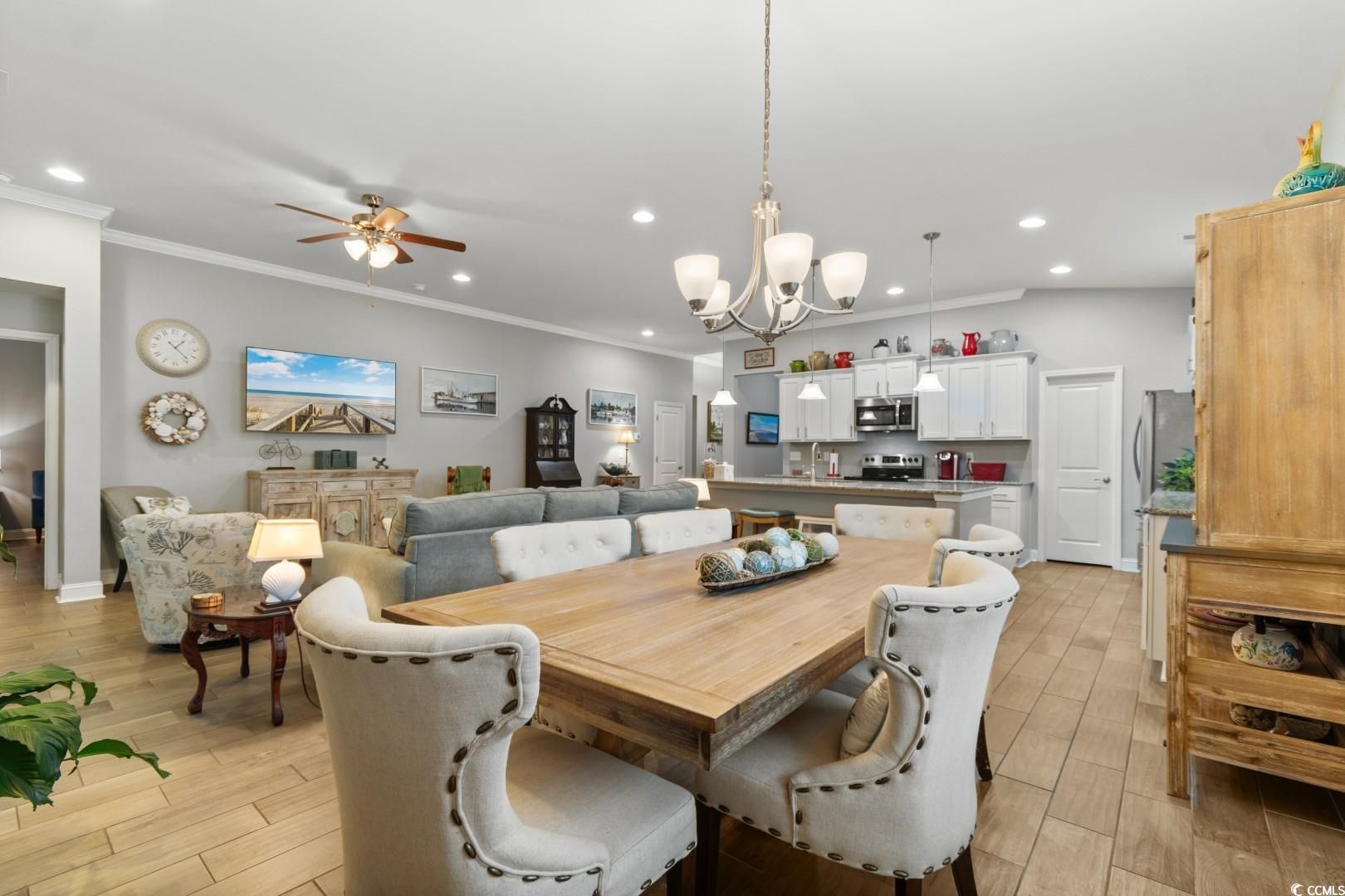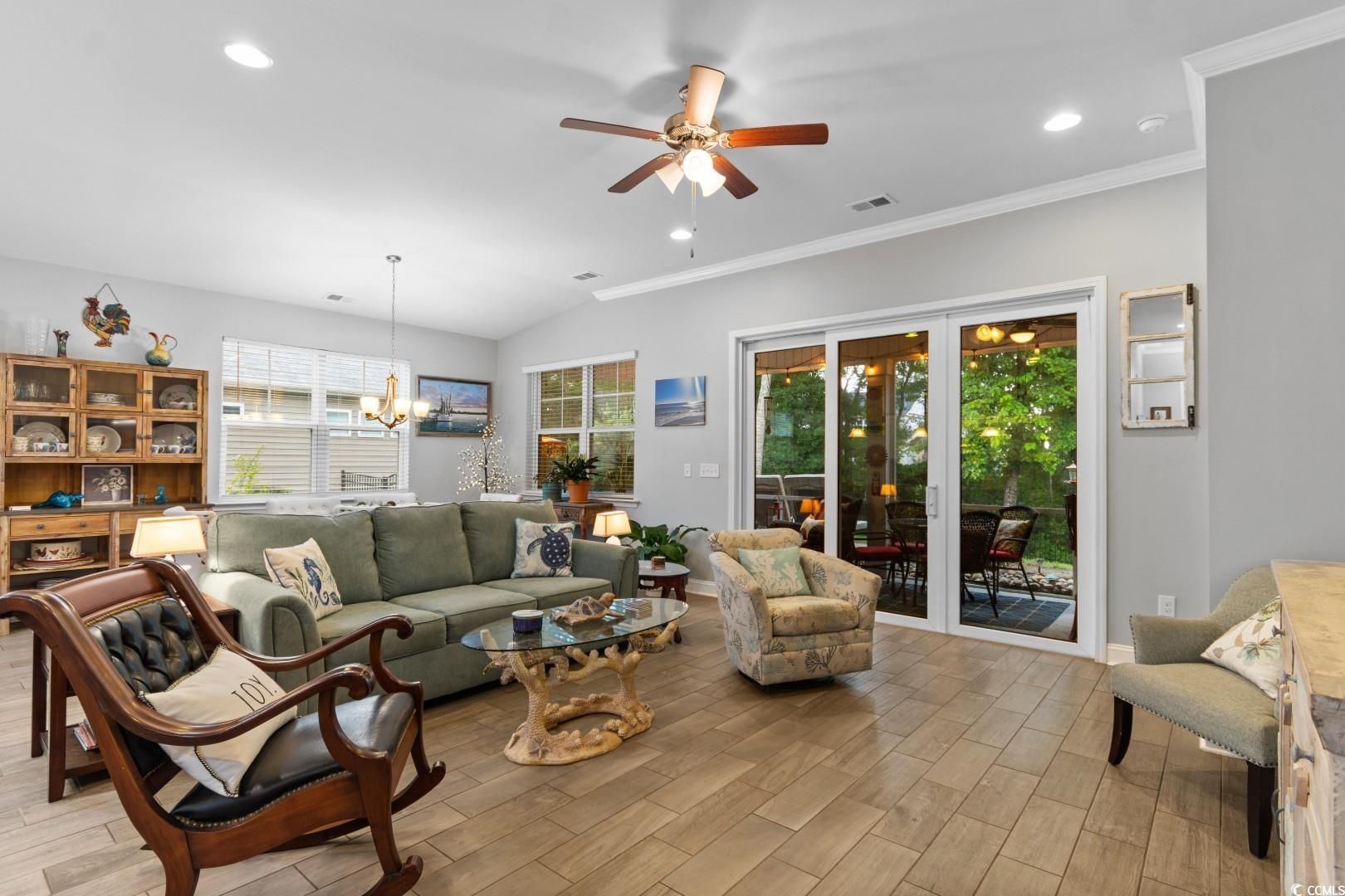 Welcome to 1003 Oak Marsh Lane! This is a pristine home nestled in the highly sought-after gated community of Water's Edge in the Cherry Grove area of North Myrtle Beach. Tucked away in one of the most secluded and peaceful areas of the Grand Strand, this charming 3-bedroom, 2-bath residence offers the perfect blend of privacy, modern comfort, and coastal convenience. As you step inside, you'll be greeted by an open-concept layout enhanced by soaring 12-foot ceilings and large windows that flood the space with natural light. The spacious living area is ideal for relaxing or entertaining, seamlessly flowing into a gourmet kitchen complete with stainless steel appliances, granite countertops, a custom tile backsplash, and a generous island perfect for casual dining or gatherings. The entire home features durable luxury tile flooring, stylish and easy to maintain. The split-bedroom floor plan offers privacy and comfort, with the primary suite boasting wooded views, a spa-like bathroom, and ample closet space. Step outside to a tranquil setting in your fenced in backyard where you can unwind to the sound of ocean waves---yes, you're that close to the beach! Water's Edge residents enjoy resort-style amenities including a large outdoor pool, fitness center, and a beautifully appointed clubhouse. The HOA covers all lawn maintenance, so you can spend more time enjoying your surroundings and less time on chores. Just a quick golf cart ride away, you'll find yourself at the sandy shores of North Myrtle Beach, as well as an array of attractions including Barefoot Landing, world-class golf courses, waterfront dining, shopping, and live entertainment. Whether you're looking for a full-time residence, vacation home, or investment property, 1003 Oak Marsh Lane offers a rare opportunity to live the coastal lifestyle you've been dreaming of!