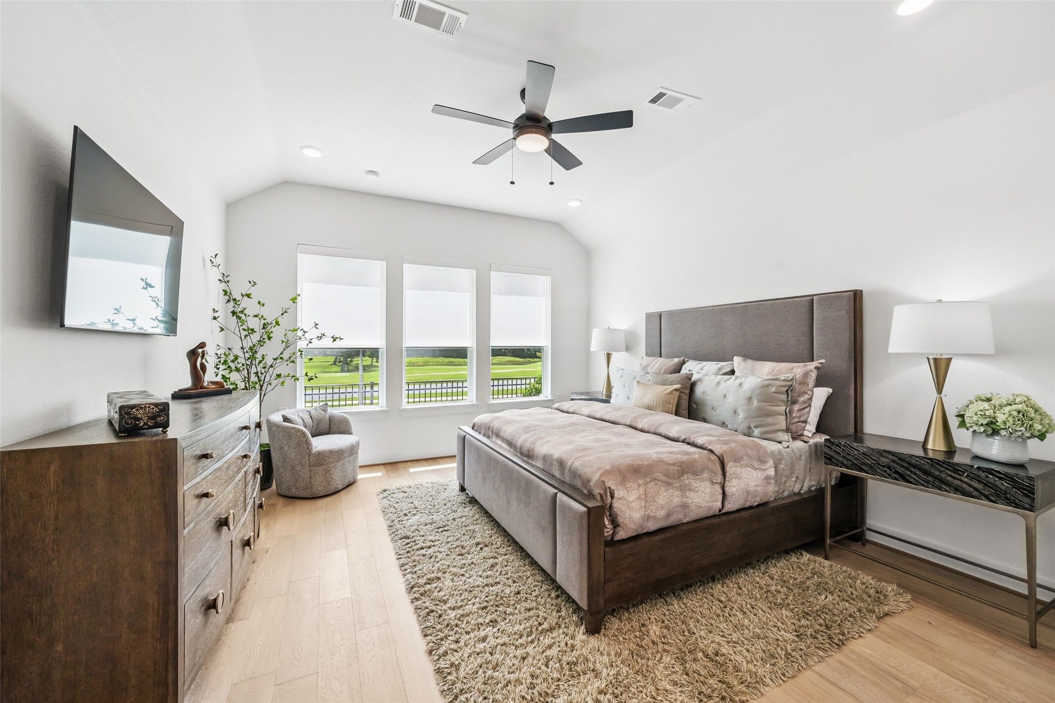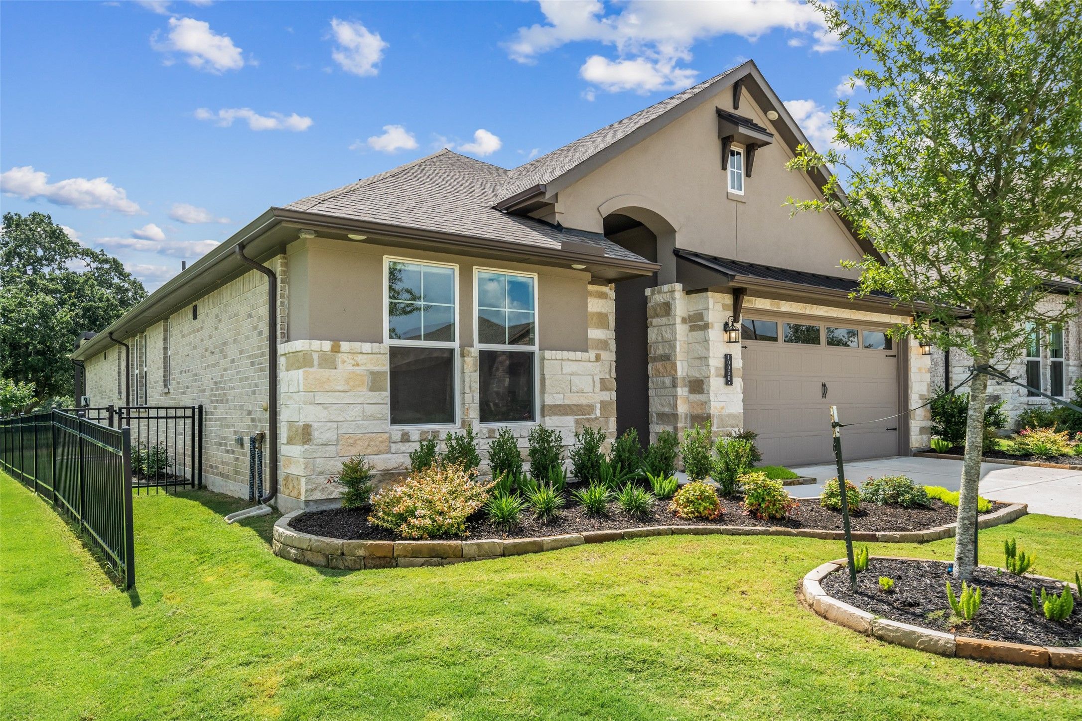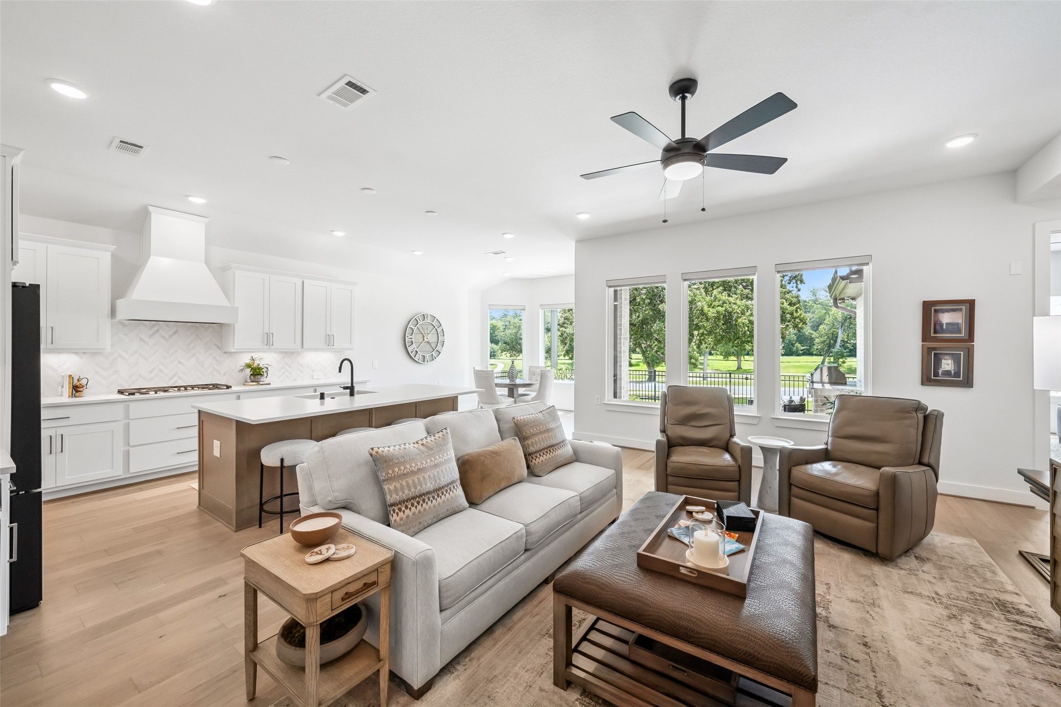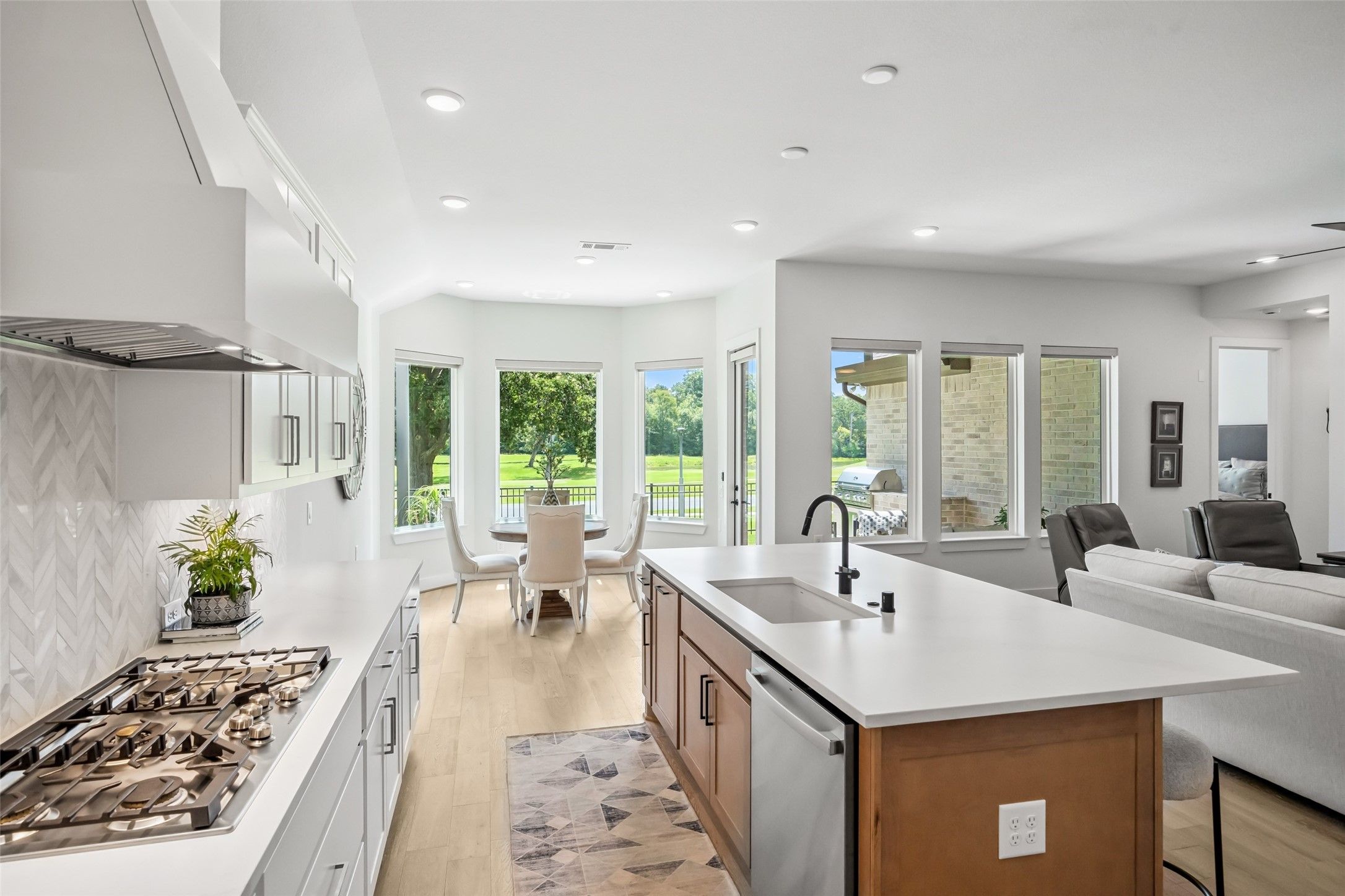 Outstanding resort-style community of Chambers Creek known as Houston's Hill Country. Rolling hills, lakes, trails, golf, vineyard (join planting/harvesting/al fresco dining, tastings), pool/club house, private marina, community garden, tons more! Gorgeous home on corner lot overlooks golf course from back lanai w/outdoor kitchen, custom louvered pergola. Single-story 3 bedroom, 3 bath home has inviting atmosphere w/modern wood floors, designer colors/finishes. Home office. Living has corner modern rustic FP, window wall w/expansive breathtaking views. Kitchen is stunning w/high end quartz counters, herringbone marble backsplash. Coffee bar, walk-in pantry, island with seating. Casual dining space surrounded by windows/views. Laundry room has space for fridge. Primary suite has wall of windows with captivating views, ensuite with dual vanities, walk-in frameless glass shower, large walk-in closet. Bedroom 2 has full bath nearby. Bedroom 3 has ensuite. Water softener & a generator.