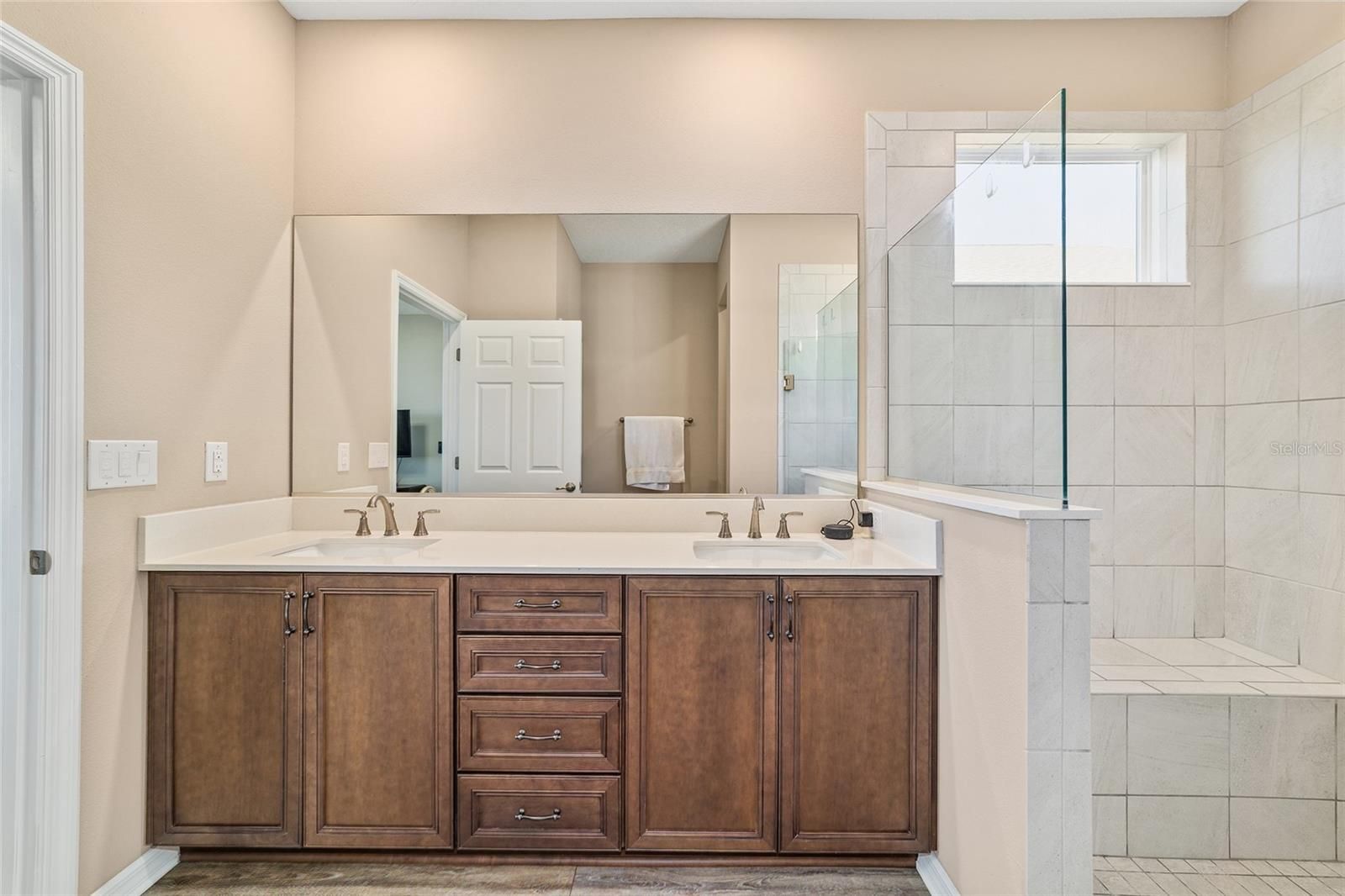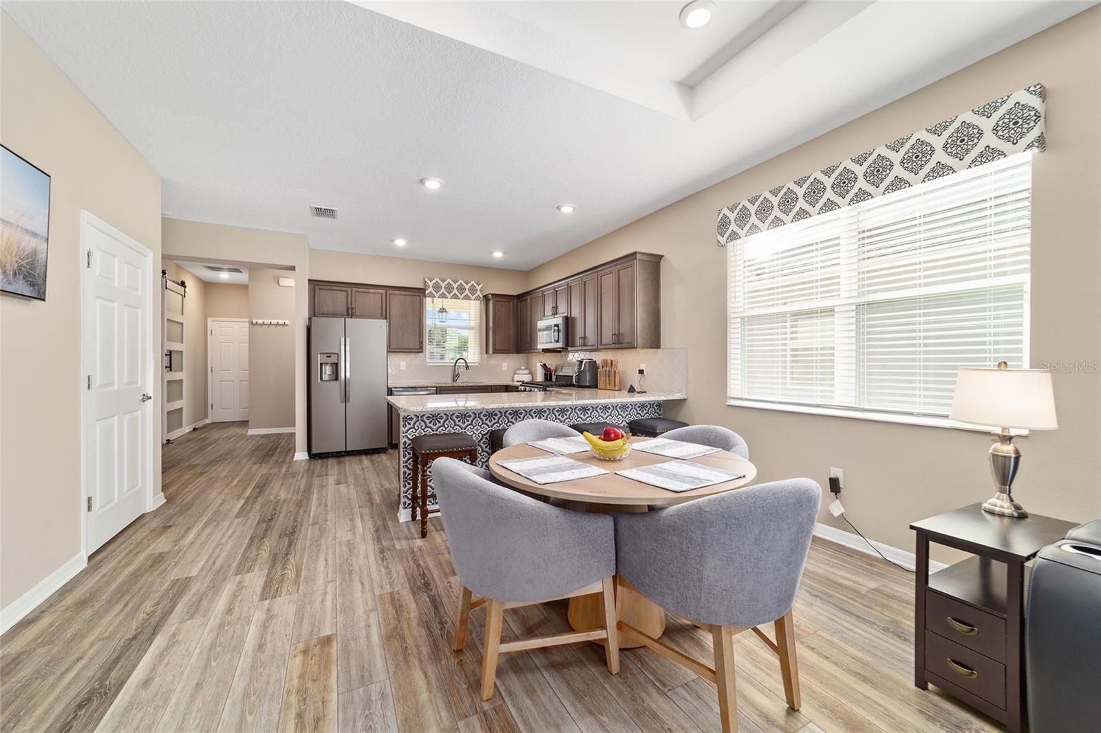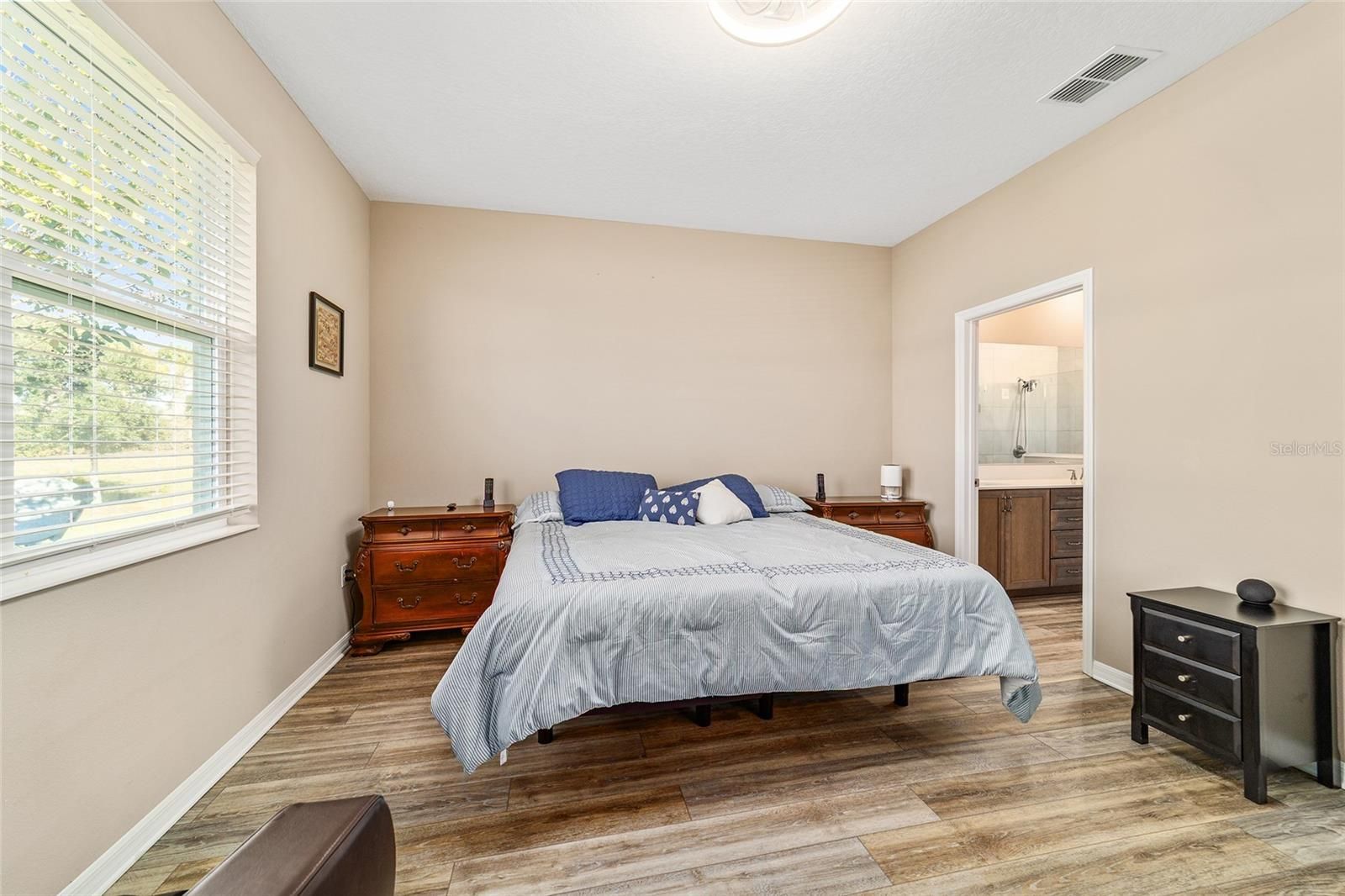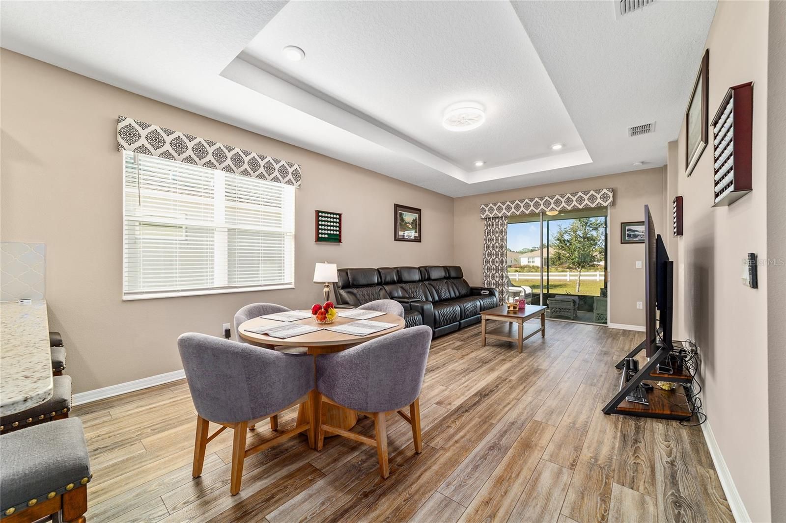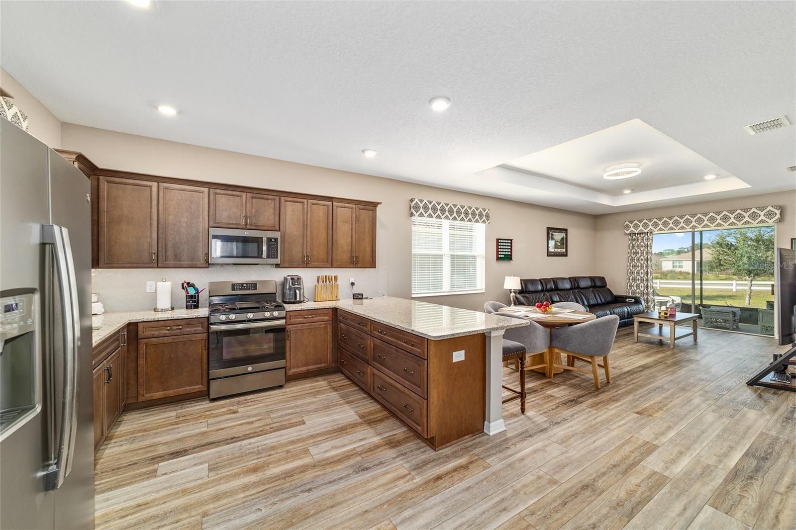 - Ceiling Fan(s), High Ceilings, Kitchen/Family Room Combo, Open Floorplan, Main Level Primary, Smart Home, Solid-Wood Cabinets, Stone Counters, Thermostat, Tray Ceiling(s), Walk-In Closet(s), Window Treatments