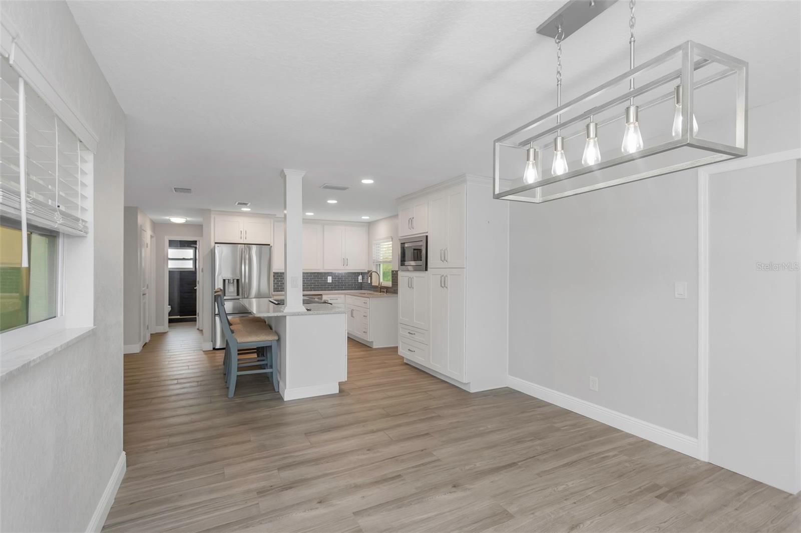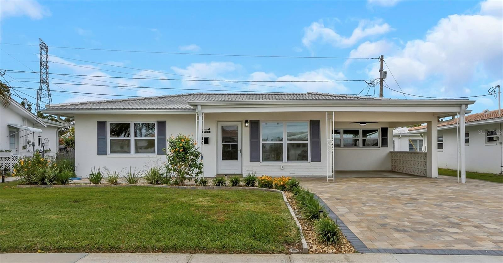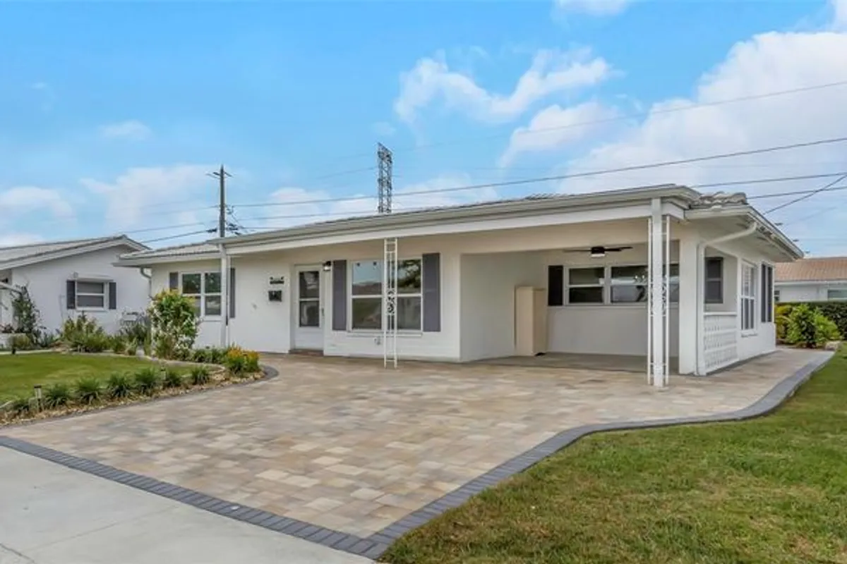 Welcome to this beautifully updated Carlton model in the friendly 55+ community of The Mainlands, Unit Three. This three-bedroom, move-in-ready home stands out with exceptional curb appeal, featuring fresh landscaping, new paver walkways, a spacious rear patio, double paved parking pad, and a charming covered front porch. Inside, the open floor plan centers around a dream kitchen with a large island, quartz countertops, soft-close cabinetry, and brand-new stainless steel appliances. Easy-care wood plank tile flooring runs throughout, creating a modern, cohesive look. The spacious dining area is ideal for everyday living and entertaining. At the rear of the home, a versatile bonus room overlooks the backyard and works perfectly as a den, home office, or guest space. This area also includes a convenient ensuite half bath and laundry. Two comfortable bedrooms and a fully renovated bathroom complete the interior. This home truly shines in a community where many residences look alike, offering unique updates and thoughtful design both inside and out. Residents of Unit Three enjoy an exclusive recreation area with a clubhouse featuring meeting rooms, a stage, full kitchen, and library. Outdoor amenities include a large swimming pool, shuffleboard courts, and outdoor cooking areas. A full calendar of social events—organized by the Unit Three Social Club—brings neighbors together for breakfasts, dances, bingo, and more. The $477 monthly maintenance fee covers water, sewer, trash, cable and internet, lawn care, reclaimed-water irrigation, exterior painting and pressure washing, and roof repair and maintenance—delivering truly maintenance-free living. Golf carts are welcome, and up to two domestic pets are allowed. Conveniently located just off US-19, The Mainlands offers easy access to shopping, dining, downtown St. Petersburg, Tampa, and award-winning Gulf beaches. Whether you’re looking for a full-time residence or a seasonal retreat, this home offers the perfect blend of style, comfort, and the Florida lifestyle.
