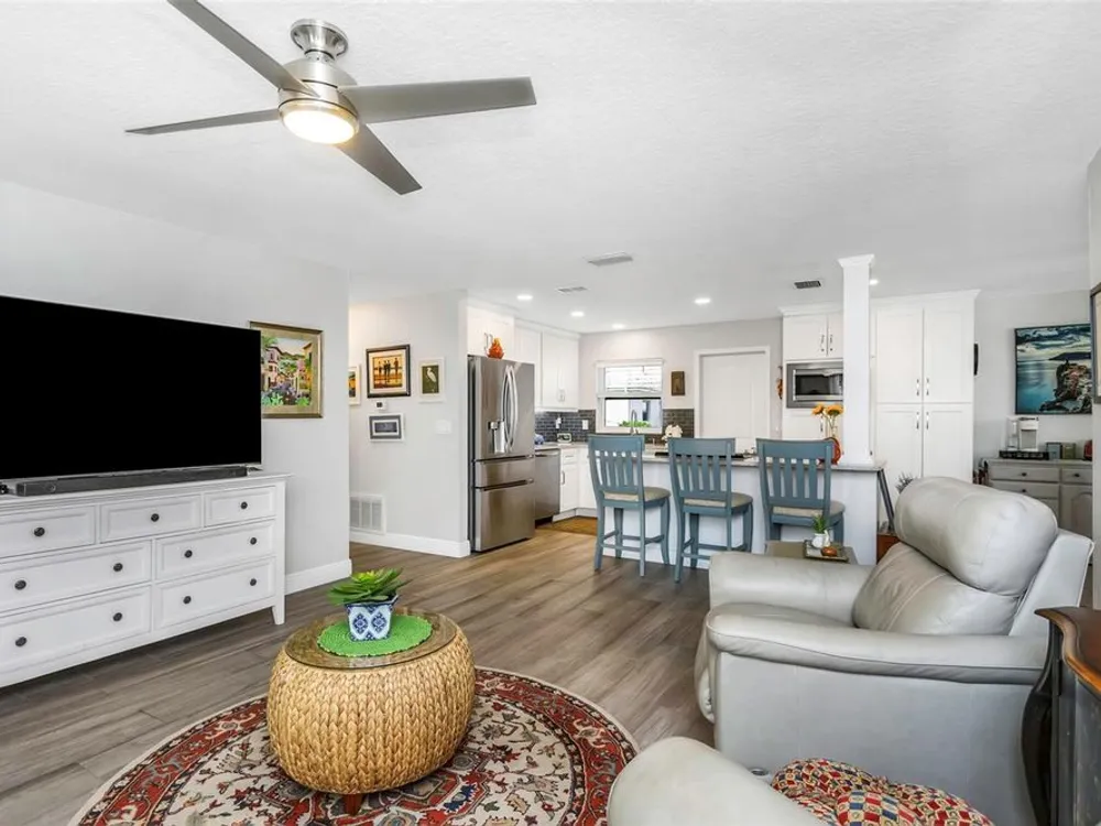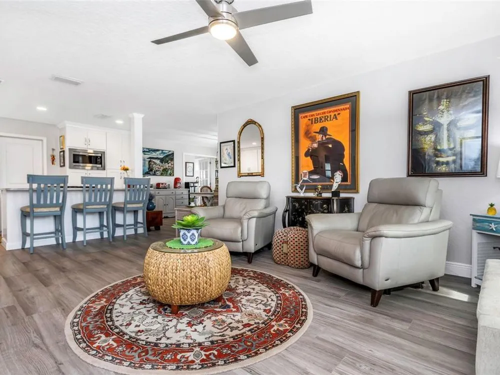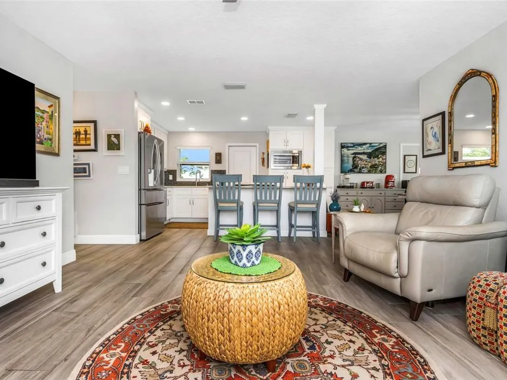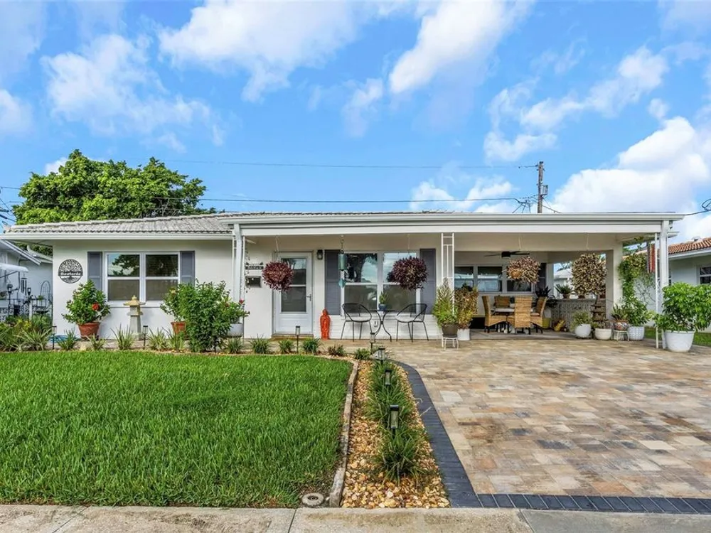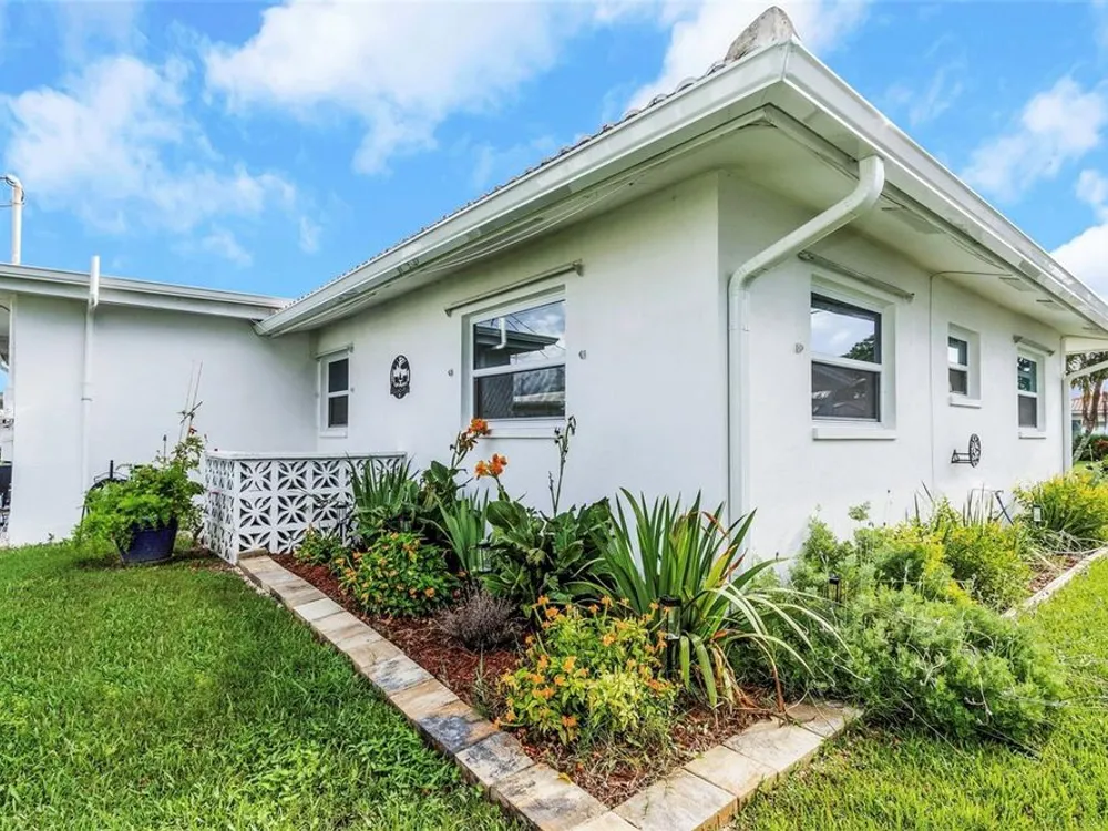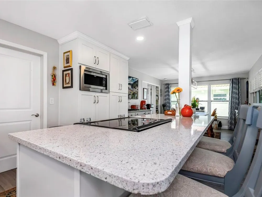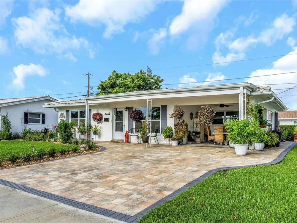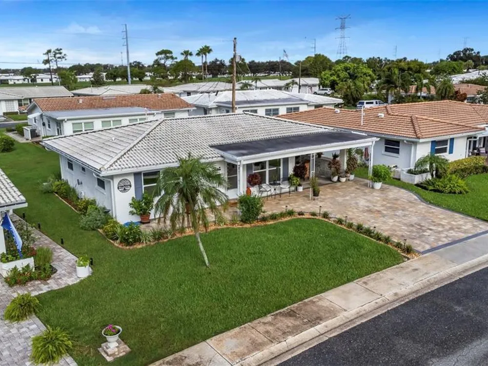Welcome to this beautifully updated Carlton model in the friendly 55+ community of The Mainlands, Unit Three. This three-bedroom home is truly move-in ready and offers standout curb appeal with fresh landscaping, new paver pathways, a spacious rear patio, a double paved parking pad, and a charming covered front porch. Inside, the open floor plan features a dream kitchen with a large island, quartz countertops, soft-close cabinetry, and brand-new stainless steel appliances. Easy-care wood plank tile flooring flows throughout the home, creating a modern and cohesive feel. The spacious dining area is perfect for family meals and entertaining. At the rear of the home, a versatile bonus room overlooks the backyard and makes an ideal den, home office, or guest space. This room also includes a convenient ensuite half bath combined with the laundry area. Two comfortable bedrooms and a fully renovated bathroom complete the interior. This property truly stands out in a community where many homes look alike — offering unique updates and thoughtful touches inside and out. Unit Three residents enjoy their own exclusive recreation area, featuring a clubhouse with meeting rooms, a stage, a full kitchen, and a library. Outdoors, there’s a large swimming pool, shuffleboard courts, and outside cooking facilities. A full calendar of social events, organized by the Unit Three Social Club, brings neighbors together for breakfasts, dances, bingo, and more. The monthly maintenance fee of $477 covers water, sewer, trash, cable/internet, lawn care, irrigation with reclaimed water, exterior painting and pressure washing, and roof repair/maintenance — making this true maintenance-free living. The community also welcomes golf carts and up to two domestic pets. Conveniently located off US-19, The Mainlands offers easy access to shopping, dining, downtown St. Petersburg, Tampa, and award winning Gulf beaches. Whether you’re seeking a full-time residence or a seasonal retreat, this home delivers the perfect blend of style, comfort, and Florida lifestyle.