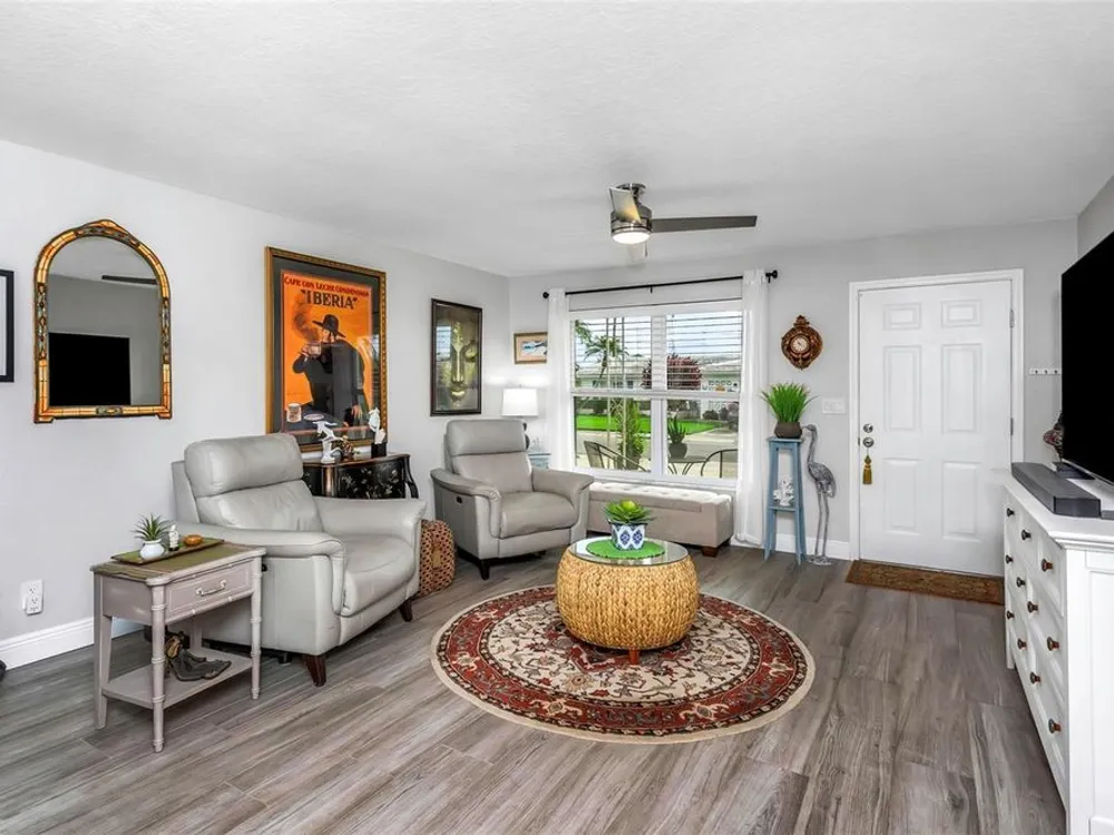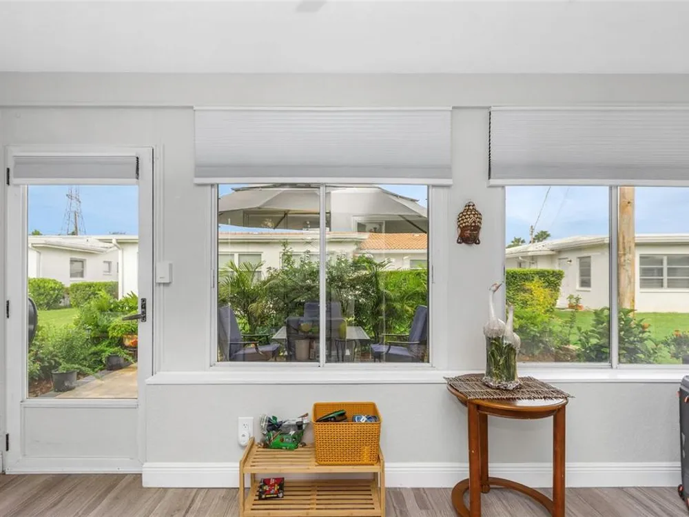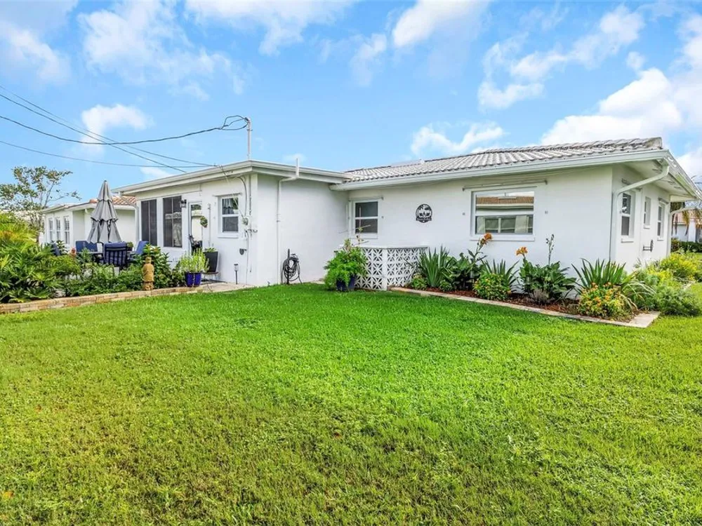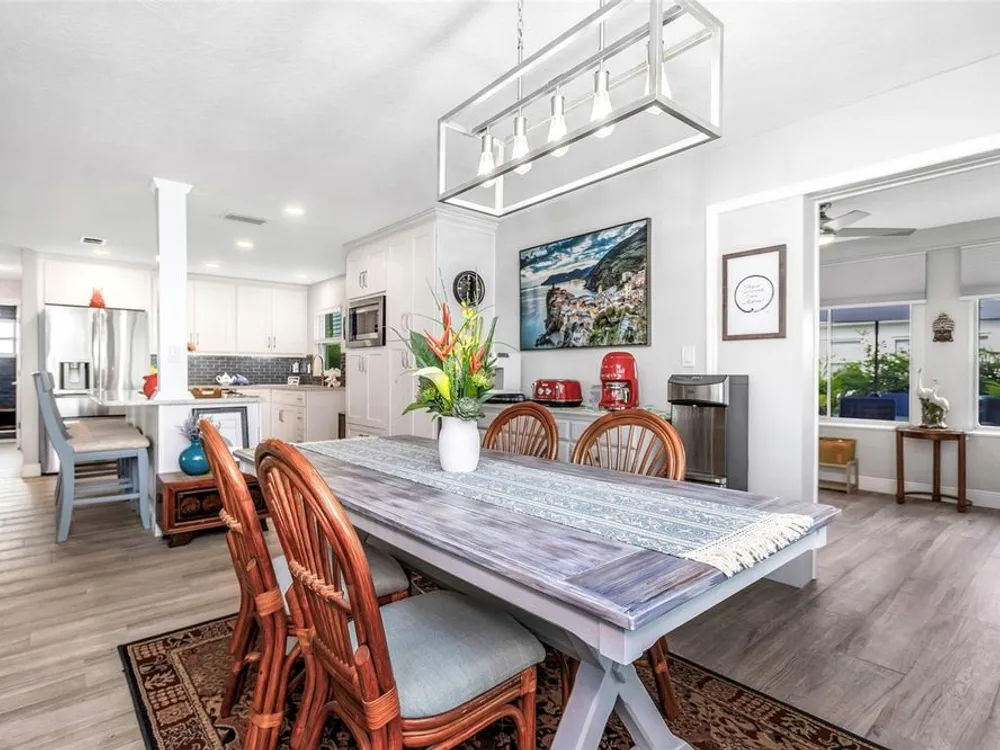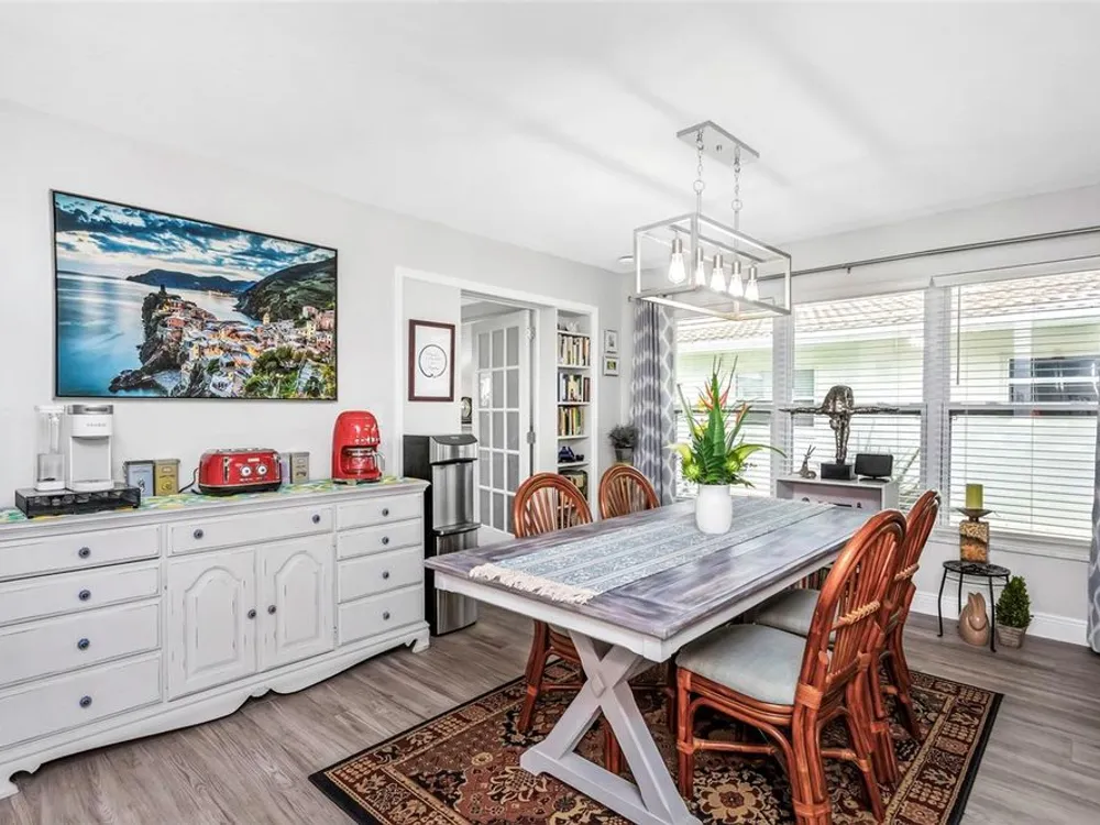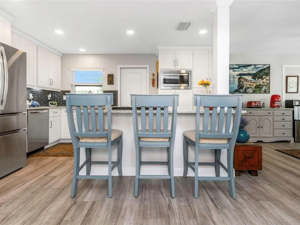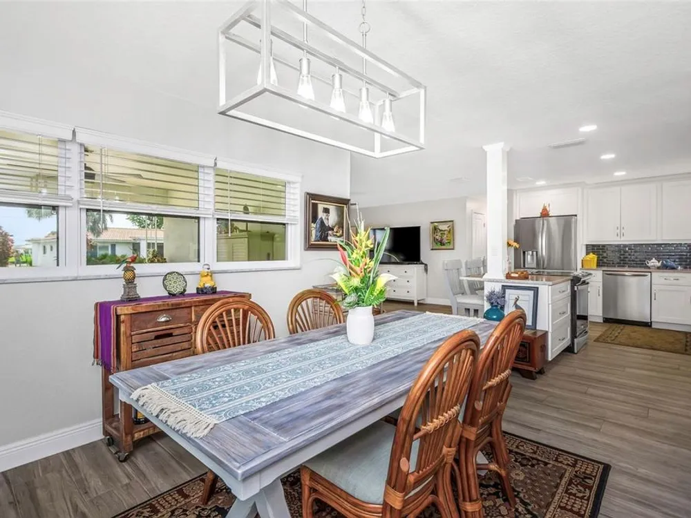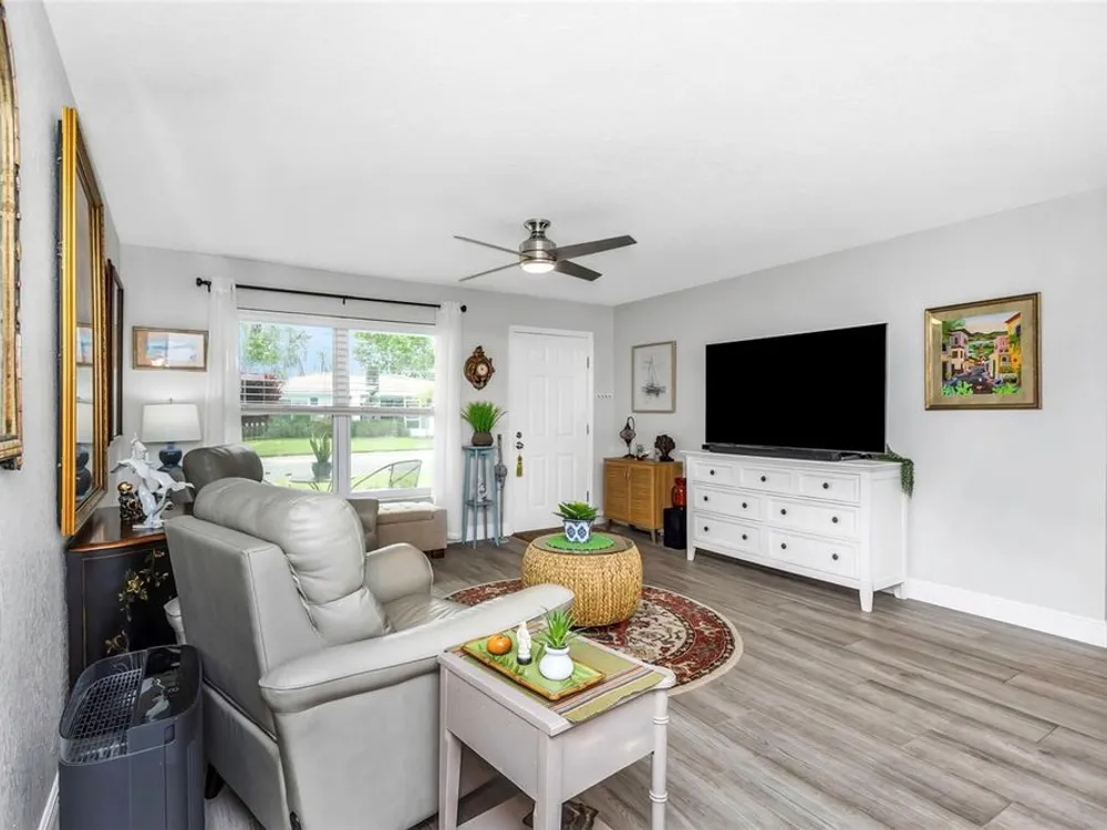 Welcome to this beautifully updated Carlton model in the friendly 55+ community of The Mainlands, Unit Three. This three-bedroom home is truly move-in ready and offers standout curb appeal with fresh landscaping, new paver pathways, a spacious rear patio, a double paved parking pad, and a charming covered front porch. Inside, the open floor plan features a dream kitchen with a large island, quartz countertops, soft-close cabinetry, and brand-new stainless steel appliances. Easy-care wood plank tile flooring flows throughout the home, creating a modern and cohesive feel. The spacious dining area is perfect for family meals and entertaining. At the rear of the home, a versatile bonus room overlooks the backyard and makes an ideal den, home office, or guest space. This room also includes a convenient ensuite half bath combined with the laundry area. Two comfortable bedrooms and a fully renovated bathroom complete the interior. This property truly stands out in a community where many homes look alike — offering unique updates and thoughtful touches inside and out. Unit Three residents enjoy their own exclusive recreation area, featuring a clubhouse with meeting rooms, a stage, a full kitchen, and a library. Outdoors, there’s a large swimming pool, shuffleboard courts, and outside cooking facilities. A full calendar of social events, organized by the Unit Three Social Club, brings neighbors together for breakfasts, dances, bingo, and more. The monthly maintenance fee of $477 covers water, sewer, trash, cable/internet, lawn care, irrigation with reclaimed water, exterior painting and pressure washing, and roof repair/maintenance — making this true maintenance-free living. The community also welcomes golf carts and up to two domestic pets. Conveniently located off US-19, The Mainlands offers easy access to shopping, dining, downtown St. Petersburg, Tampa, and award winning Gulf beaches. Whether you’re seeking a full-time residence or a seasonal retreat, this home delivers the perfect blend of style, comfort, and Florida lifestyle.