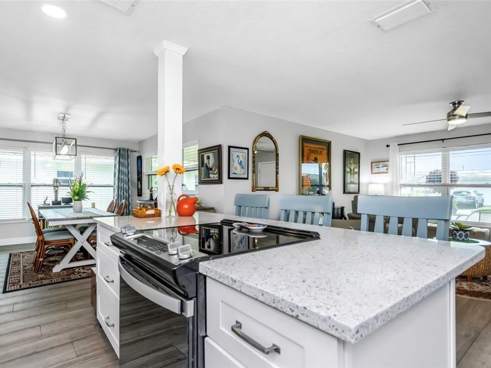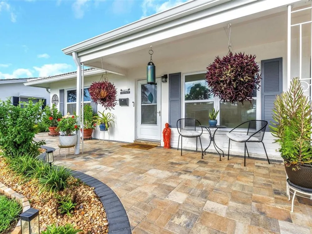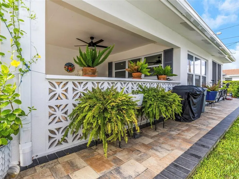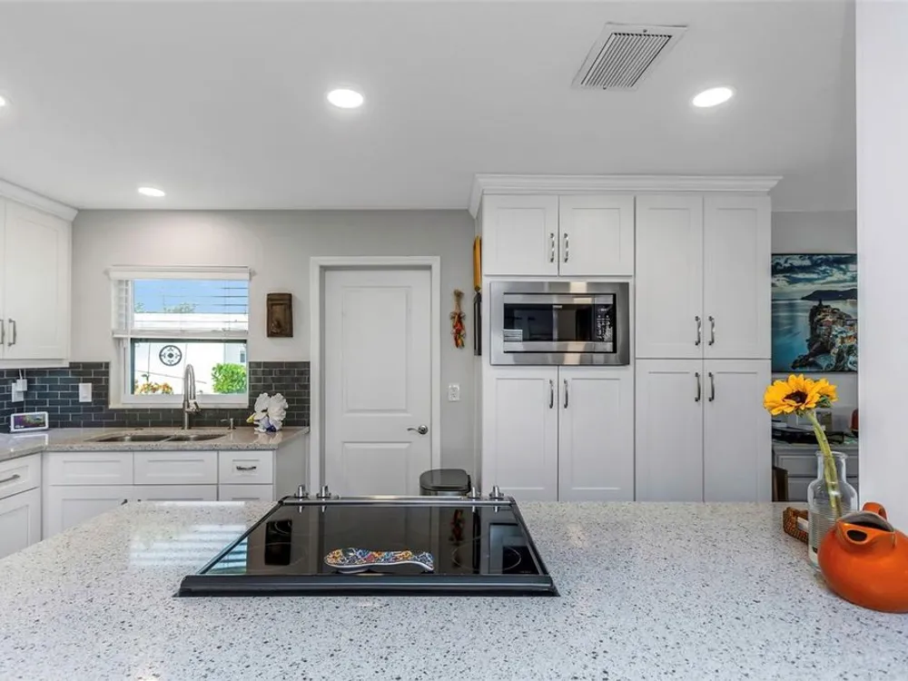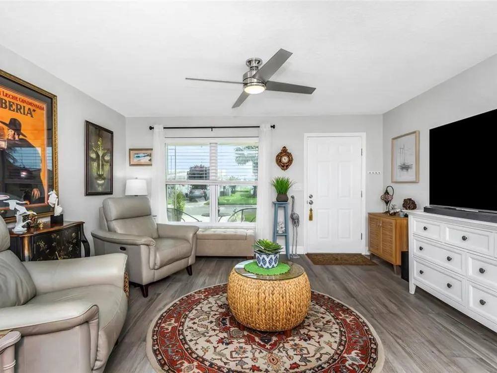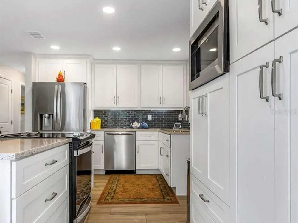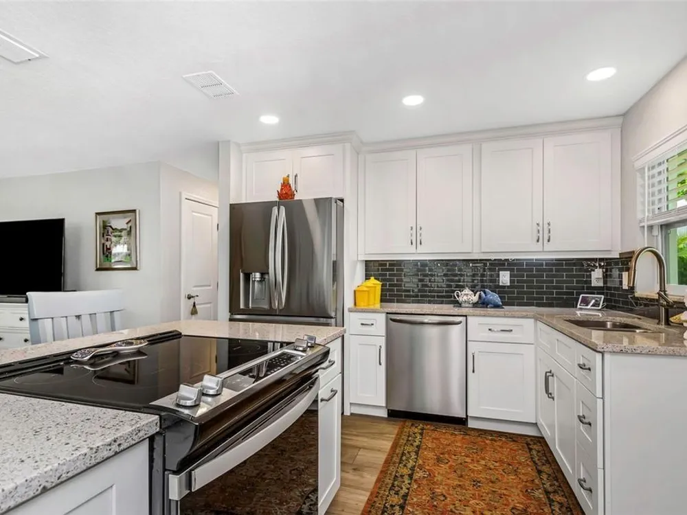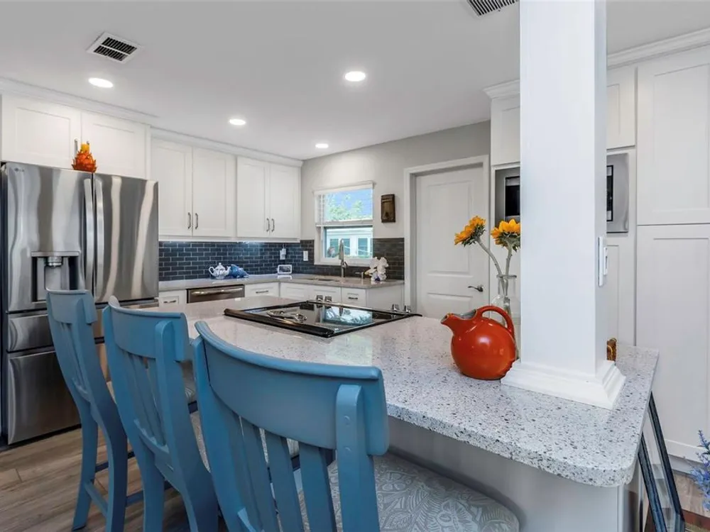 Welcome to this beautifully updated Carlton model in the friendly 55+ community of The Mainlands, Unit Three. This three-bedroom home is truly move-in ready and offers standout curb appeal with fresh landscaping, new paver pathways, a spacious rear patio, a double paved parking pad, and a charming covered front porch. Inside, the open floor plan features a dream kitchen with a large island, quartz countertops, soft-close cabinetry, and brand-new stainless steel appliances. Easy-care wood plank tile flooring flows throughout the home, creating a modern and cohesive feel. The spacious dining area is perfect for family meals and entertaining. At the rear of the home, a versatile bonus room overlooks the backyard and makes an ideal den, home office, or guest space. This room also includes a convenient ensuite half bath combined with the laundry area. Two comfortable bedrooms and a fully renovated bathroom complete the interior. This property truly stands out in a community where many homes look alike — offering unique updates and thoughtful touches inside and out. Unit Three residents enjoy their own exclusive recreation area, featuring a clubhouse with meeting rooms, a stage, a full kitchen, and a library. Outdoors, there’s a large swimming pool, shuffleboard courts, and outside cooking facilities. A full calendar of social events, organized by the Unit Three Social Club, brings neighbors together for breakfasts, dances, bingo, and more. The monthly maintenance fee of $477 covers water, sewer, trash, cable/internet, lawn care, irrigation with reclaimed water, exterior painting and pressure washing, and roof repair/maintenance — making this true maintenance-free living. The community also welcomes golf carts and up to two domestic pets. Conveniently located off US-19, The Mainlands offers easy access to shopping, dining, downtown St. Petersburg, Tampa, and award winning Gulf beaches. Whether you’re seeking a full-time residence or a seasonal retreat, this home delivers the perfect blend of style, comfort, and Florida lifestyle.