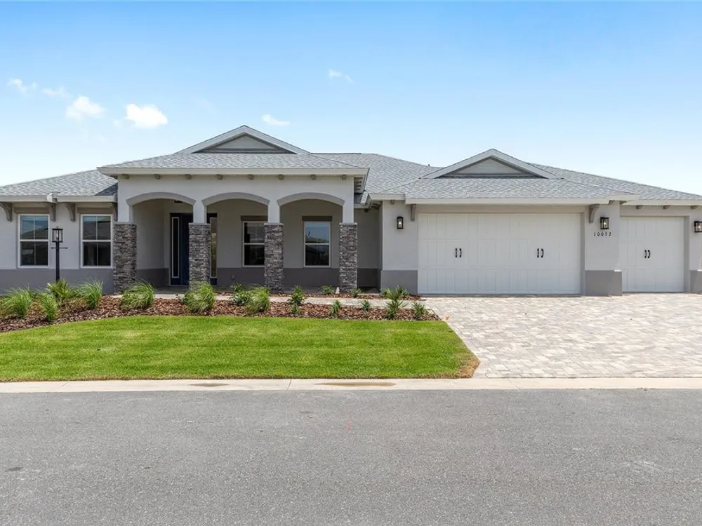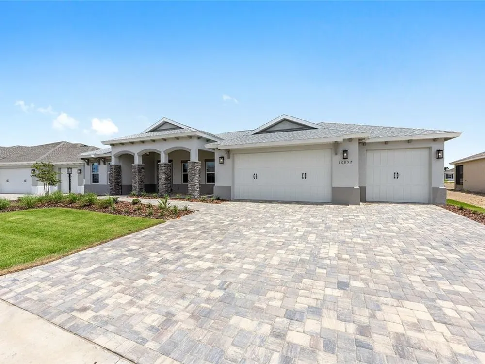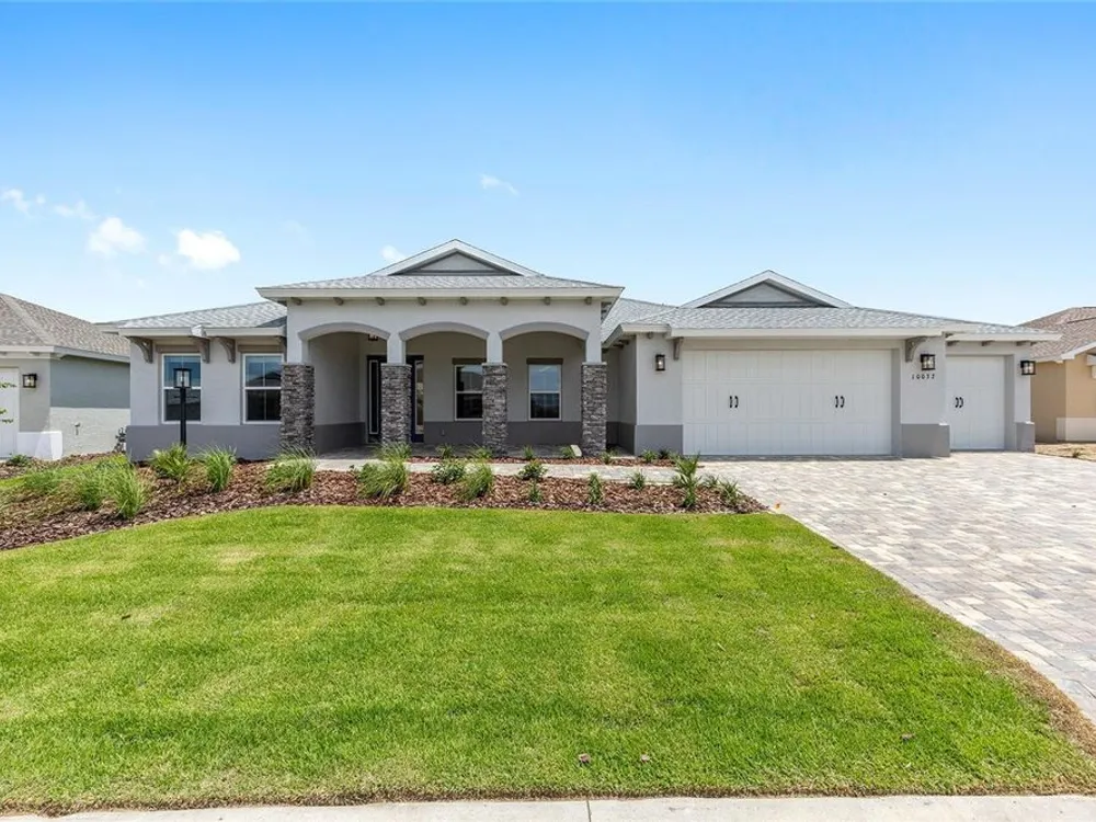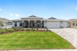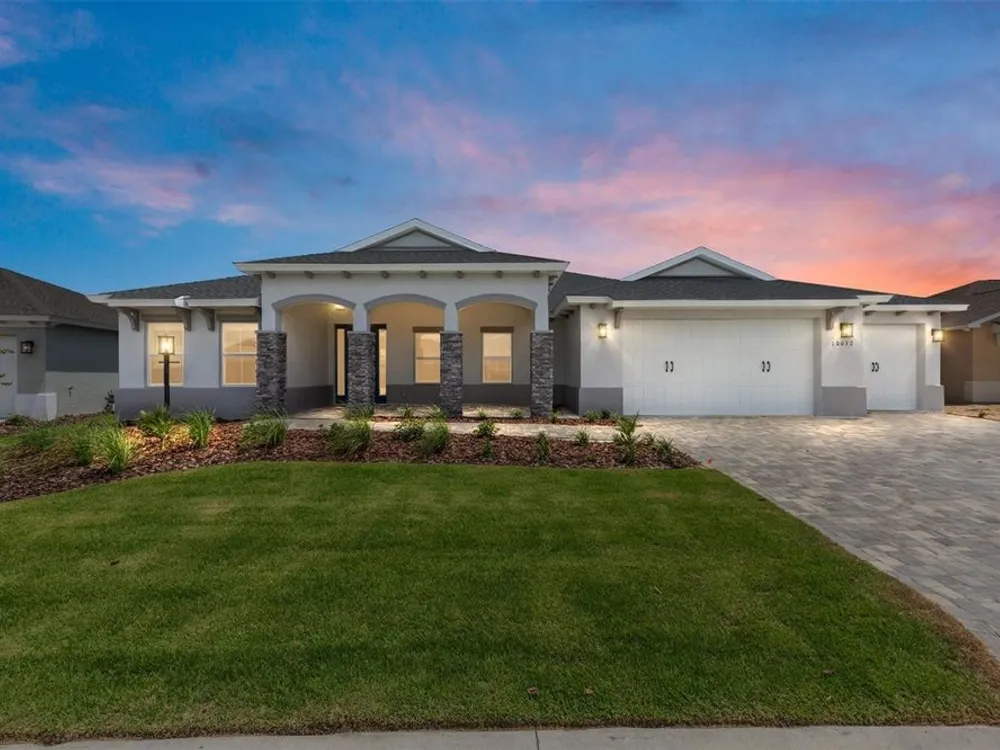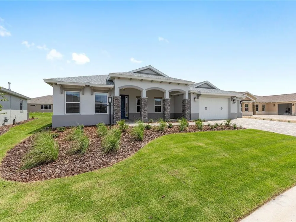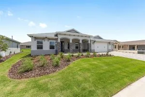 Brighton Beauty in Balfour—Brand New & Impeccably Designed! Welcome to this stunning new construction estate home in the sought-after Balfour neighborhood of On Top of the World, Ocala’s premier 55+ gated community. From the moment you arrive, this Brighton model impresses with its manicured landscaping, oversized driveway, and inviting extra-large front porch, perfect for sipping lemonade and greeting neighbors. Step inside to a thoughtfully designed open-concept floor plan with tray ceilings, abundant natural light, and elevated finishes throughout. This 2-bedroom, 2-bath residence features a versatile flex room with French doors—ideal as a home office, den, or guest space—and an oversized 3-car garage with additional room for a golf cart. At the heart of the home lies the gourmet kitchen, where high-end finishes meet exceptional functionality. Enjoy quartz countertops, a generous island, staggered cabinets with crown molding, under-cabinet lighting, and stainless-steel appliances including a built-in gas cooktop, oven, and microwave. Adjacent to the kitchen, the light-filled dining area boasts floor-to-ceiling windows, creating a warm, scenic spot for meals or morning coffee while overlooking your beautifully landscaped surroundings. The spacious primary suite offers a luxurious retreat with a spa-style en suite bathroom, featuring a zero-entry walk-in shower with built-in bench, a dual-sink quartz vanity, and a large walk-in closet with direct access to the laundry room for added convenience. The guest bedroom is tucked away in a private wing, ensuring comfort and privacy for visitors. Open the sliding glass doors to your screened lanai, the perfect outdoor extension of your living space for year-round relaxation. With golf cart access to two nearby shopping centers and a lifestyle loaded with resort-style amenities, this home delivers both elegance and ease in one of Ocala’s most vibrant communities. Don’t miss your chance to live in luxury! Schedule your private tour today!