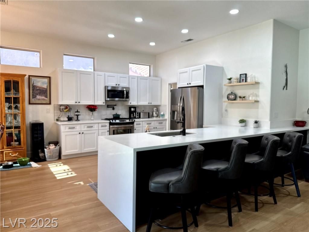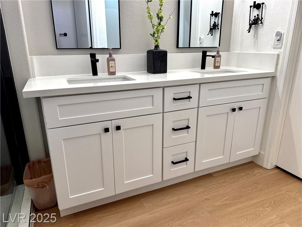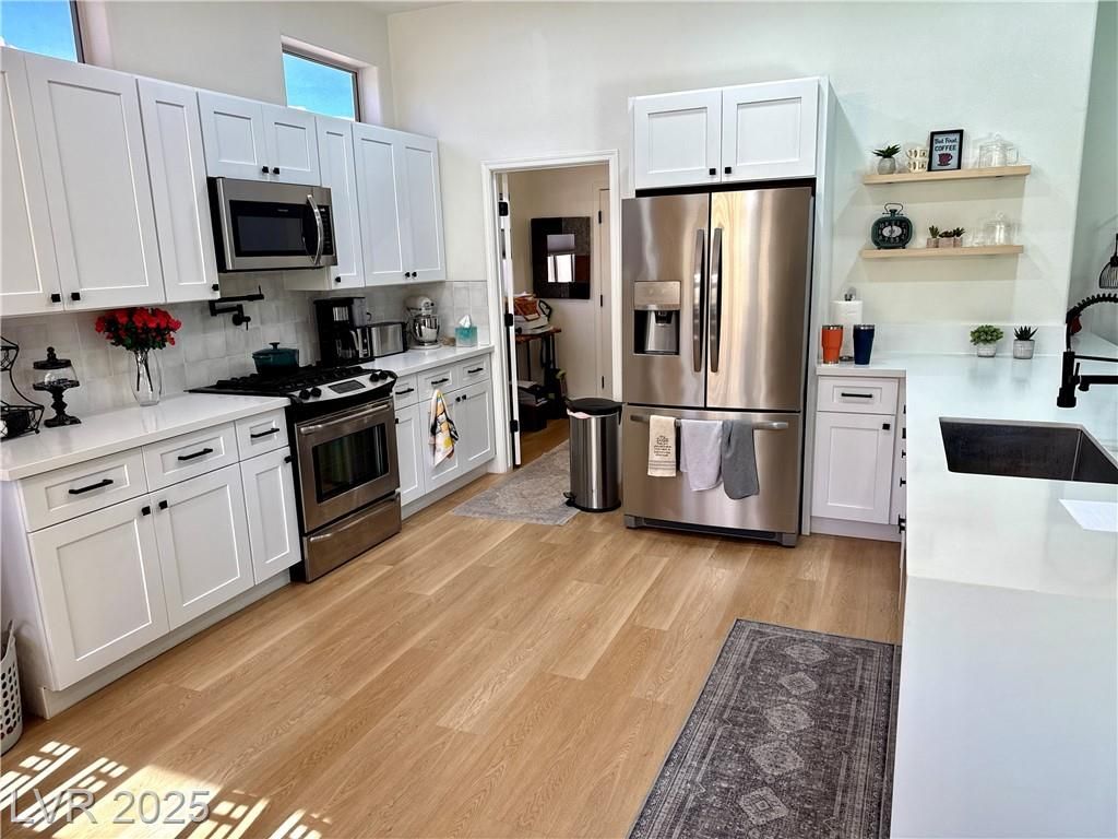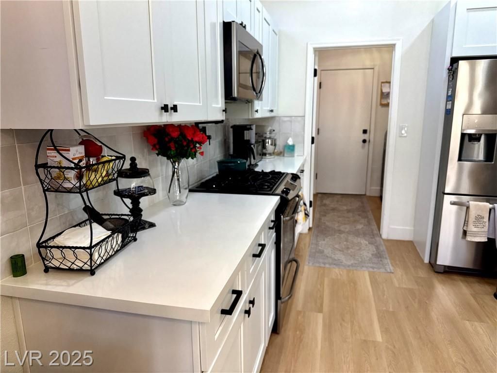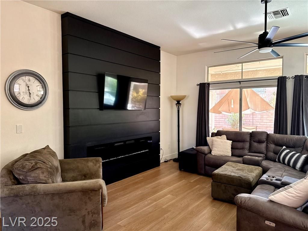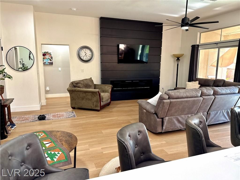 This stunning residence situated within one of Las Vegas' top 55+ communities offers an array of amenities such as three golf courses, fitness centers, clubhouses, eateries, and more than 80 social clubs. The entire home has been recently renovated! It boasts numerous modern features, including quartz countertops, custom cabinetry, 5-inch square baseboards, stainless steel kitchen appliances, wood-look luxury vinyl flooring, carpeting, as well as stylish lighting and plumbing fixtures. The property includes a fenced backyard and is equipped with a new HVAC system and water softener. Don’t miss out—schedule your showing today!