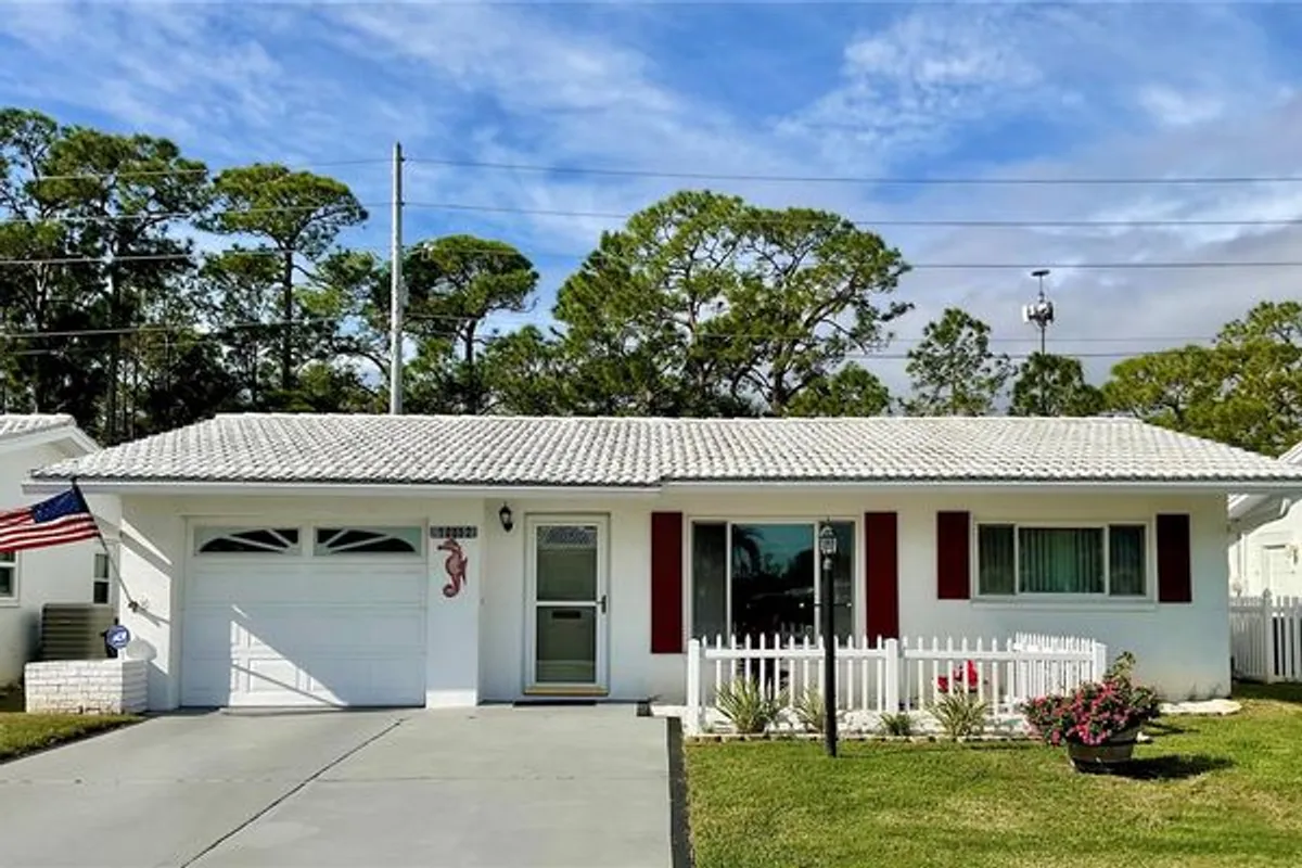 Cute, updated 2 bedroom, 2 bath, one car garage home with 890 sq. ft in the desirable 55+, golf cart community of Mainlands of Tamarac. As you arrive, you will notice a driveway with room for two vehicles providing you with room to park your golf cart and there is even a small fenced in front patio for relaxing in the sun. Entering through the front door, is an open concept living room, dining room, and kitchen. The flooring is updated, wood grained, tile throughout the home, except in the bedrooms. The updated kitchen has new cabinets, a beautiful butcher block island with room to seat four, newer stainless steel slide-in range, microwave, inset lights and a stylish light fixture over the island. Enjoy your meals at the island or visit with the chef in the kitchen. Off the kitchen is a slider to a large Florida room with vinyl, screened windows, plenty of room for entertaining all your friends and family. The kitchen has a door to the garage laundry area where you will find a washer, dryer, and a freezer for extra food storage. The front, guest bedroom has carpet, a large built-in closet and can accommodate a queen size bed. The guest bathroom is tastefully updated with new fixtures, vanity, comfort toilet, mirror, and has a shower/tub combo. The primary bedroom has carpet, walk-in closet, and is in the back of the home with its own en-suite. The en-suite bathroom has a step-in shower. There is a slider in the primary bedroom for access to the Florida room. Unit 1 Clubhouse is close by, with a heated pool and lots of activities to keep you busy, such as, dances, cards, and shuffleboard. Conveniently located just down the street from the Mainlands Public Golf Course, Mayor Park and is only a short drive to beaches, downtown St. Petersburg and the airports. What more could you ask for? If you are looking for your spot in the sun, this is it! Call today to schedule your private showing.