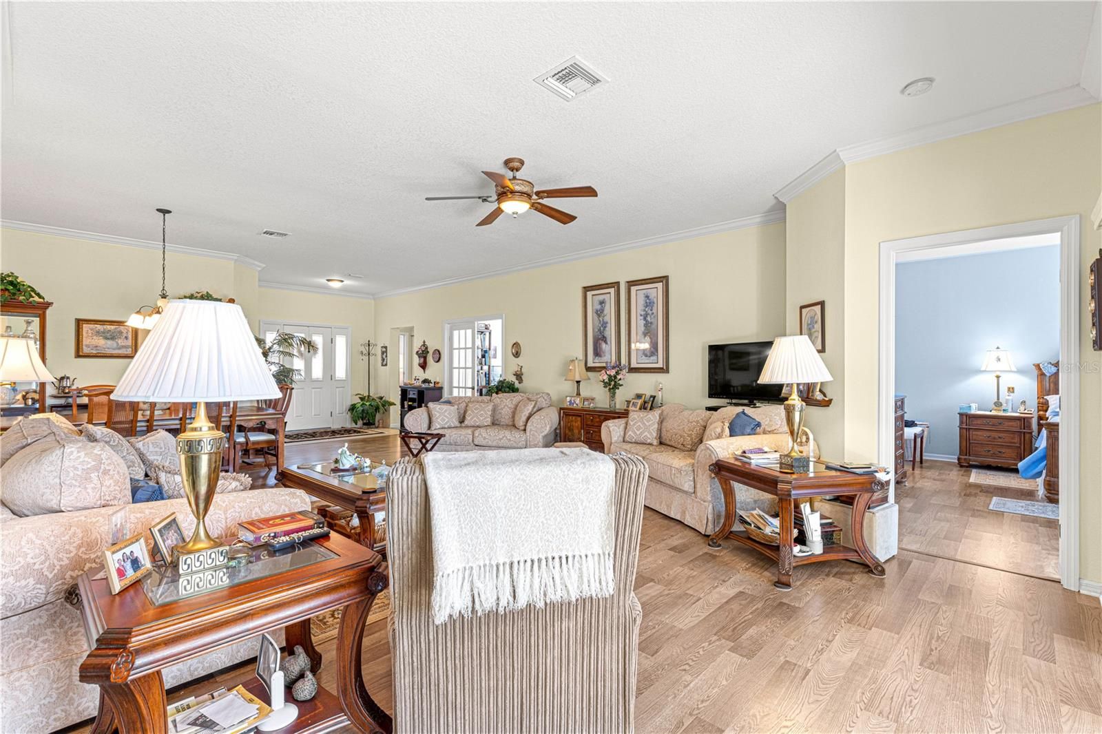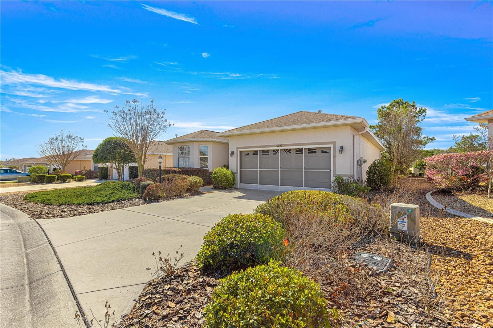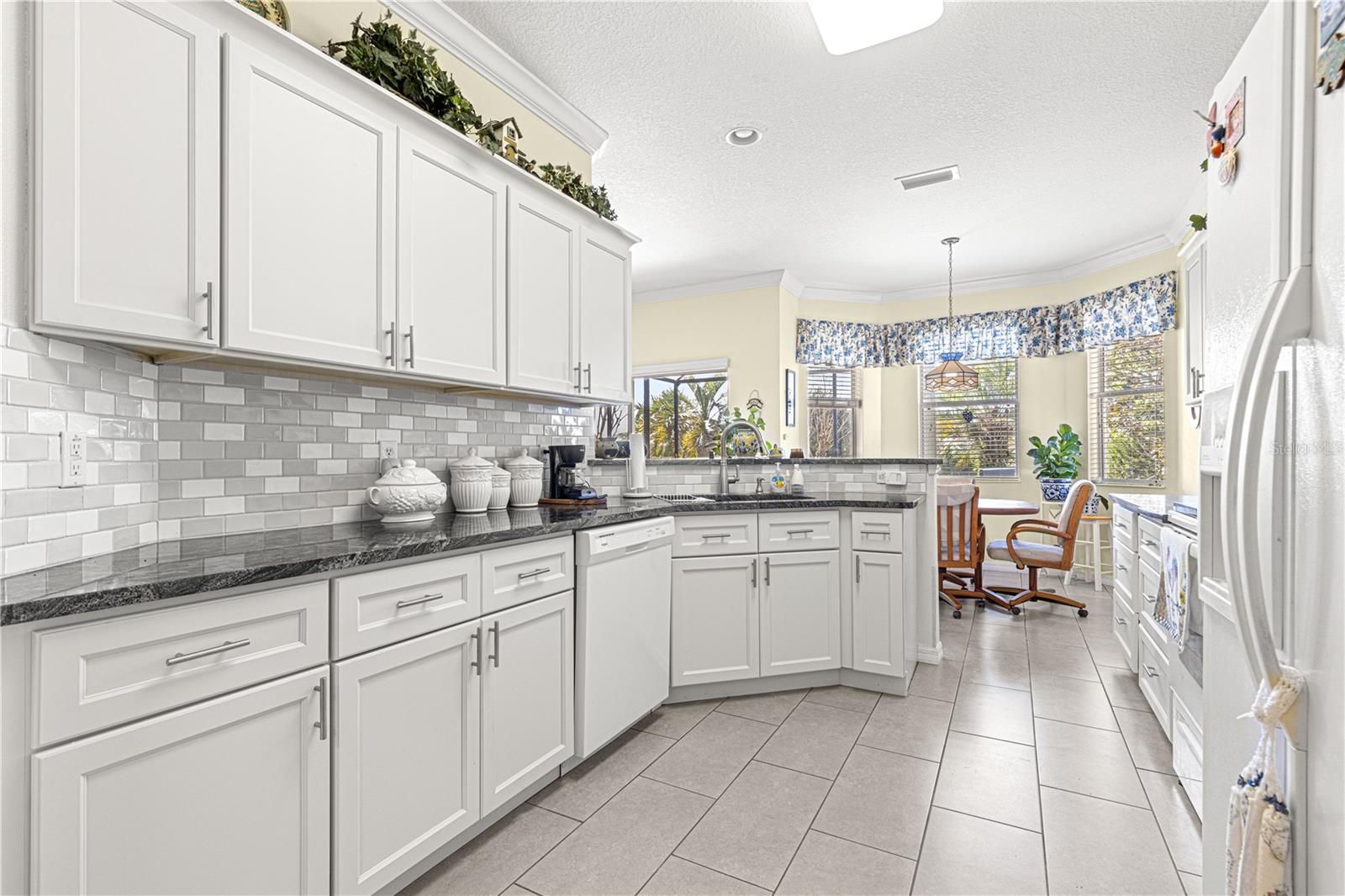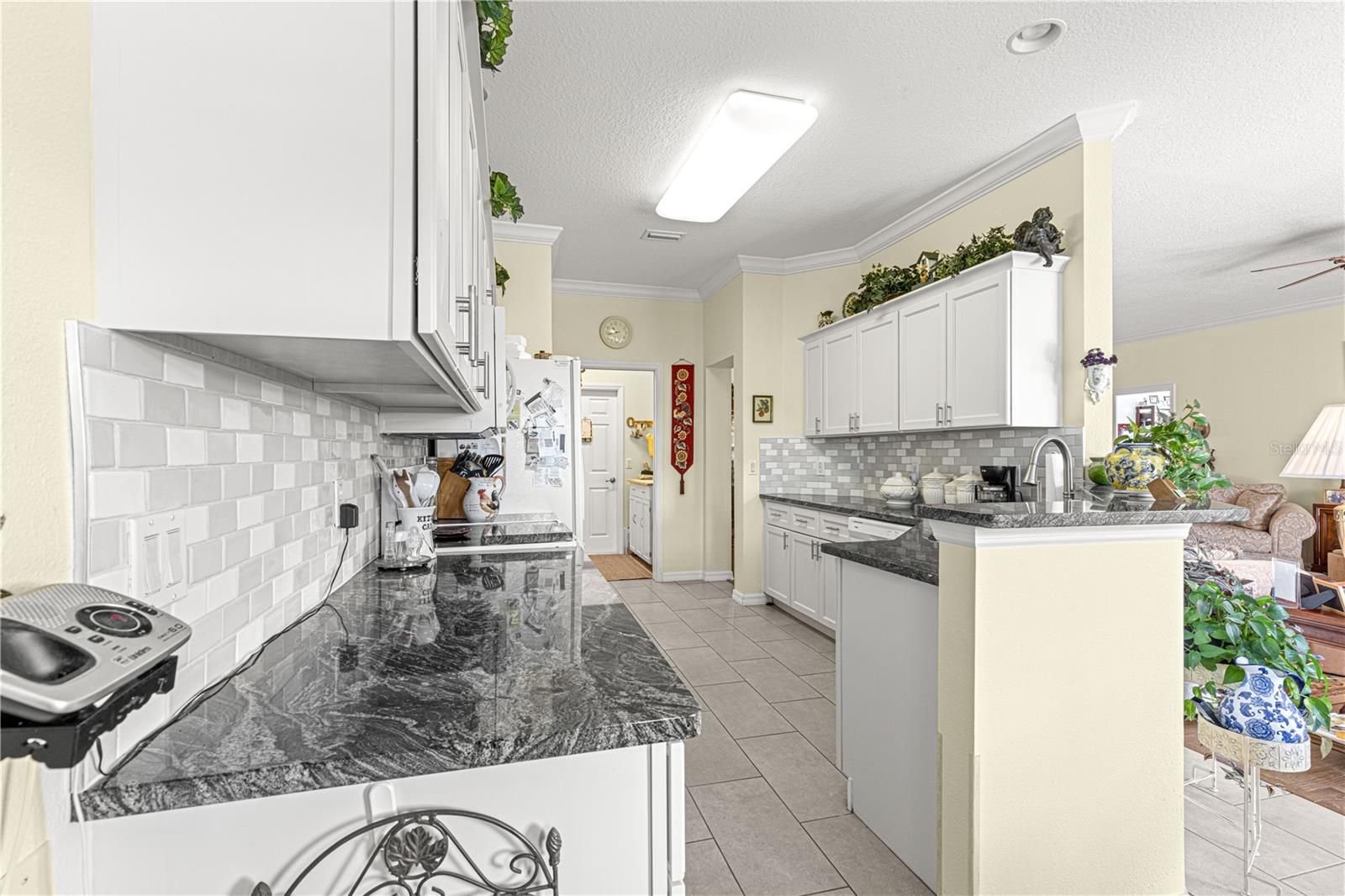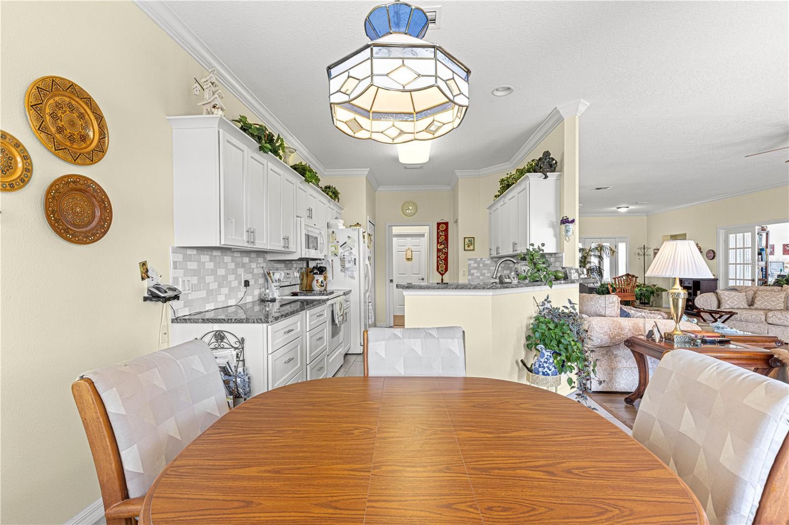 Welcome to the much sought after 55+ community of On Top of the World! The outside of this Hanover features mature landscaping and palm trees to give it that true Florida feel. Entering the home there are 2 bedrooms, a flex/office space and 2 bathrooms. The foyer has tiled flooring leading to your spacious living and dining area. This area has wood look laminate flooring, soaring ceilings and a triple slider to your screened lanai and very large birdcage. The kitchen has been freshly renovated with new white shaker cabinets, a pretty tiled backsplash, long rectangular tile on the floor and fabulous granite counters! This kitchen is a chef's dream. Microwave and dishwasher are newer. There is also a newer garbage disposal. There's a nook off the kitchen with a bay window. The flex/office space has french doors and carpeting. The perfect space for an office or hobby area. The seller also upgraded to the higher ceilings than the standard for this model. The primary bedroom is quite large with wood look laminate flooring, ceiling fan and large windows. There are also his & her walk-in closets. Plenty of space. The primary bath features a step in shower and a double sink vanity. The second bedroom is perfectly sized for guests and they will have their own bath with a tub/shower combo. Inside laundry room has gas dryer hook up. If you like to entertain or enjoy have your family over the large lanai and birdcage in the back is the perfect spot for that. Partially under cover if we get some of that liquid sunshine. Inside paint was refreshed in 2023. HVAC is a 2023 with the UV light and electronic air filter. Screens on the front of the garage. Call for your appointment to see today!