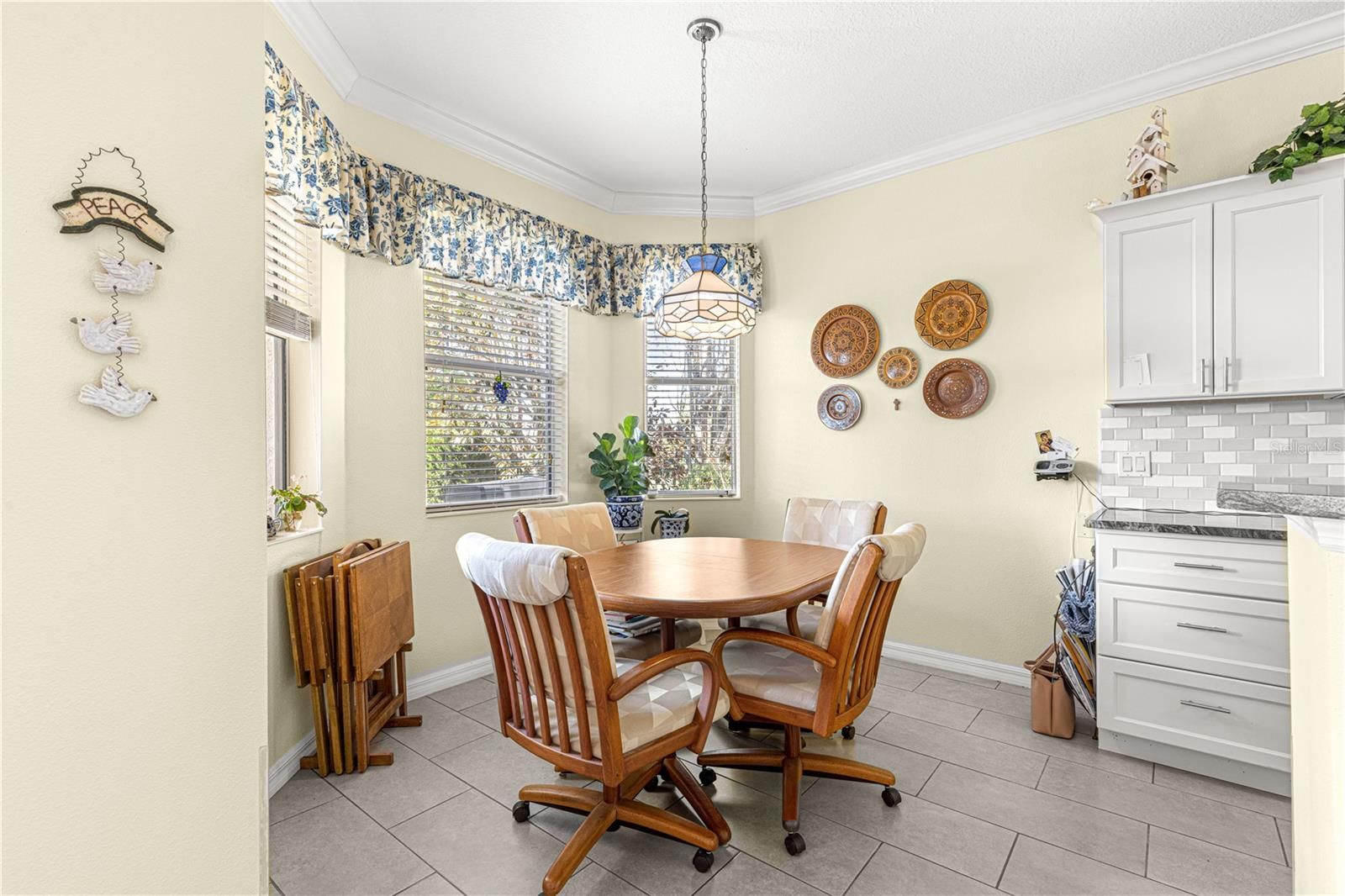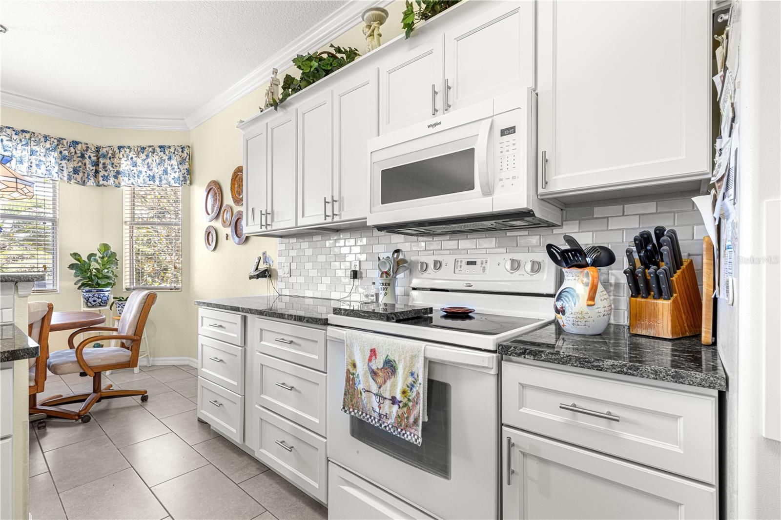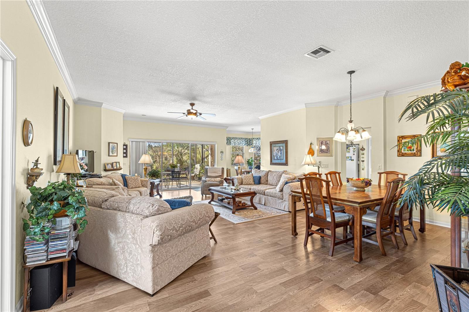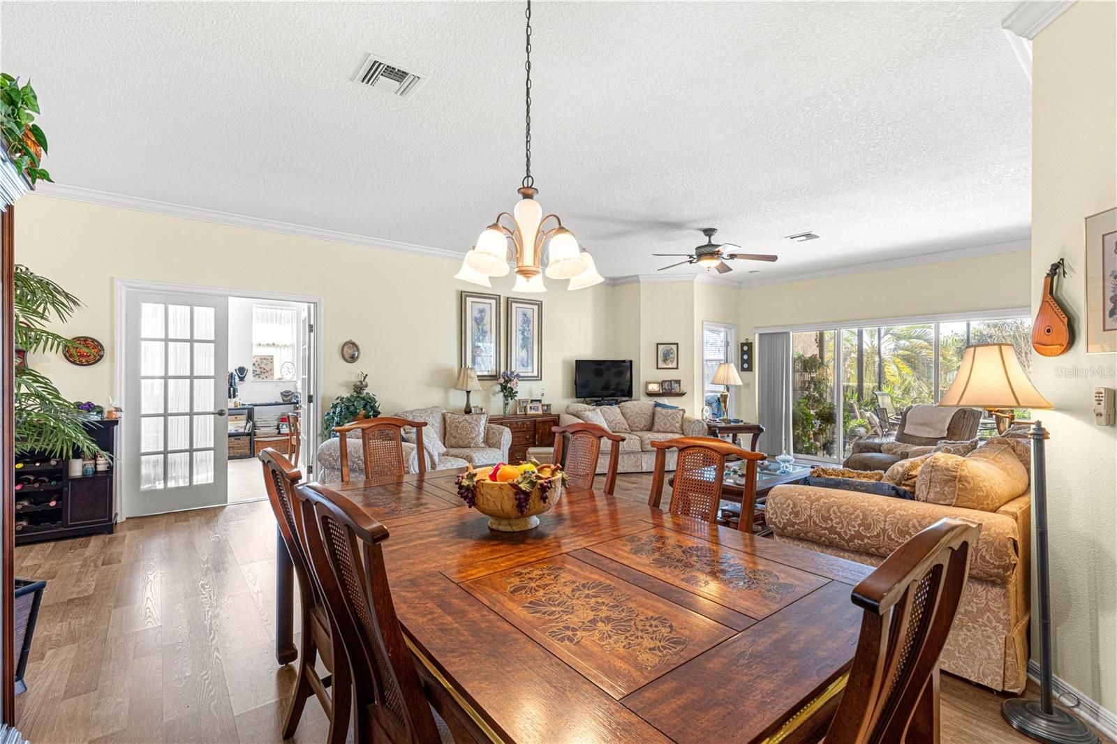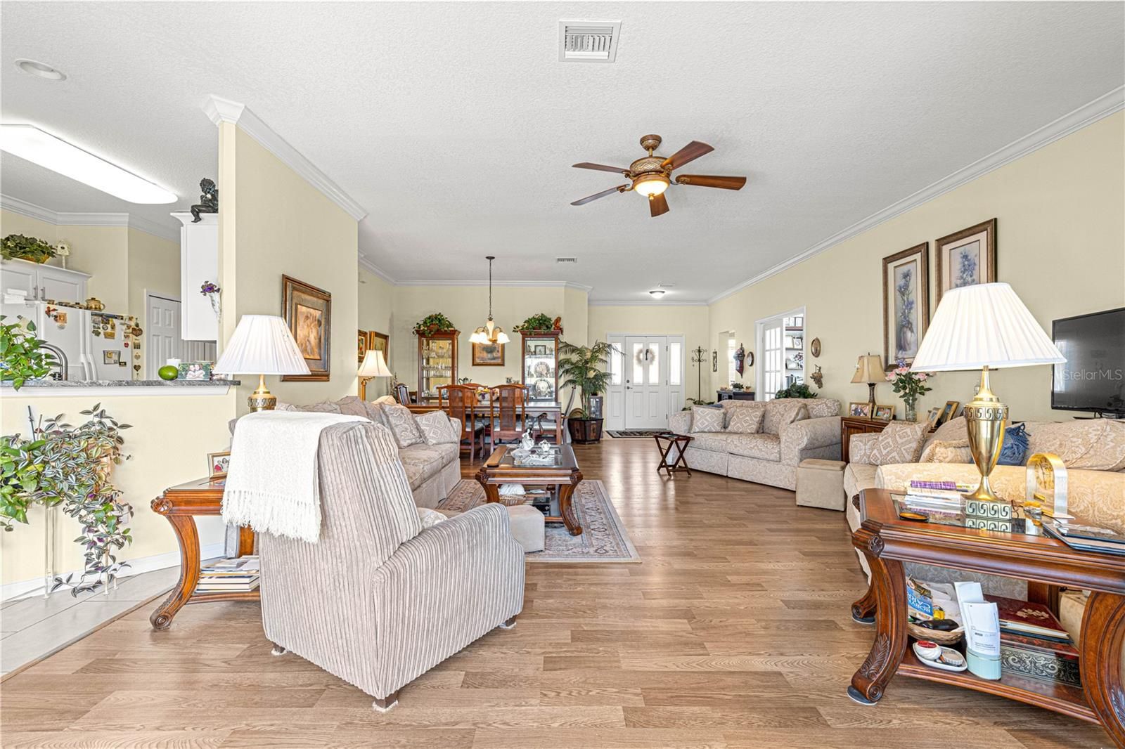 Welcome to the much sought after 55+ community of On Top of the World! The outside of this Hanover features mature landscaping and palm trees to give it that true Florida feel. Entering the home there are 2 bedrooms, a flex/office space and 2 bathrooms. The foyer has tiled flooring leading to your spacious living and dining area. This area has wood look laminate flooring, soaring ceilings and a triple slider to your screened lanai and very large birdcage. The kitchen has been freshly renovated with new white shaker cabinets, a pretty tiled backsplash, long rectangular tile on the floor and fabulous granite counters! This kitchen is a chef's dream. Microwave and dishwasher are newer. There is also a newer garbage disposal. There's a nook off the kitchen with a bay window. The flex/office space has french doors and carpeting. The perfect space for an office or hobby area. The seller also upgraded to the higher ceilings than the standard for this model. The primary bedroom is quite large with wood look laminate flooring, ceiling fan and large windows. There are also his & her walk-in closets. Plenty of space. The primary bath features a step in shower and a double sink vanity. The second bedroom is perfectly sized for guests and they will have their own bath with a tub/shower combo. Inside laundry room has gas dryer hook up. If you like to entertain or enjoy have your family over the large lanai and birdcage in the back is the perfect spot for that. Partially under cover if we get some of that liquid sunshine. Inside paint was refreshed in 2023. HVAC is a 2023 with the UV light and electronic air filter. Screens on the front of the garage. Call for your appointment to see today!