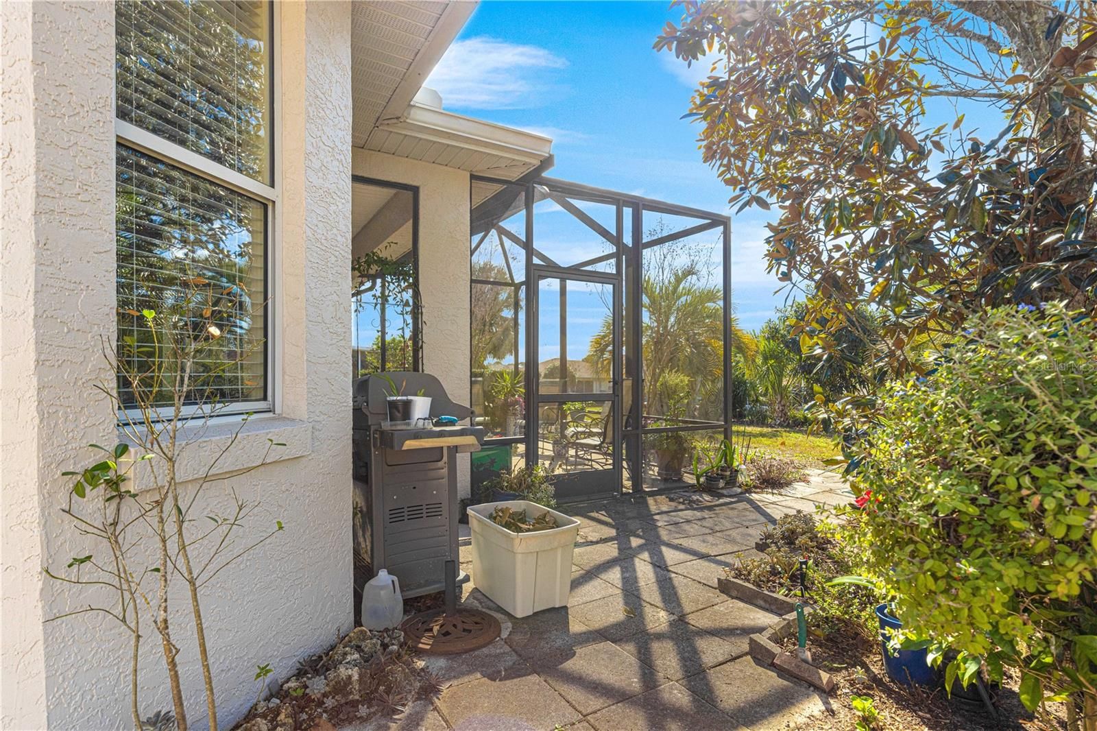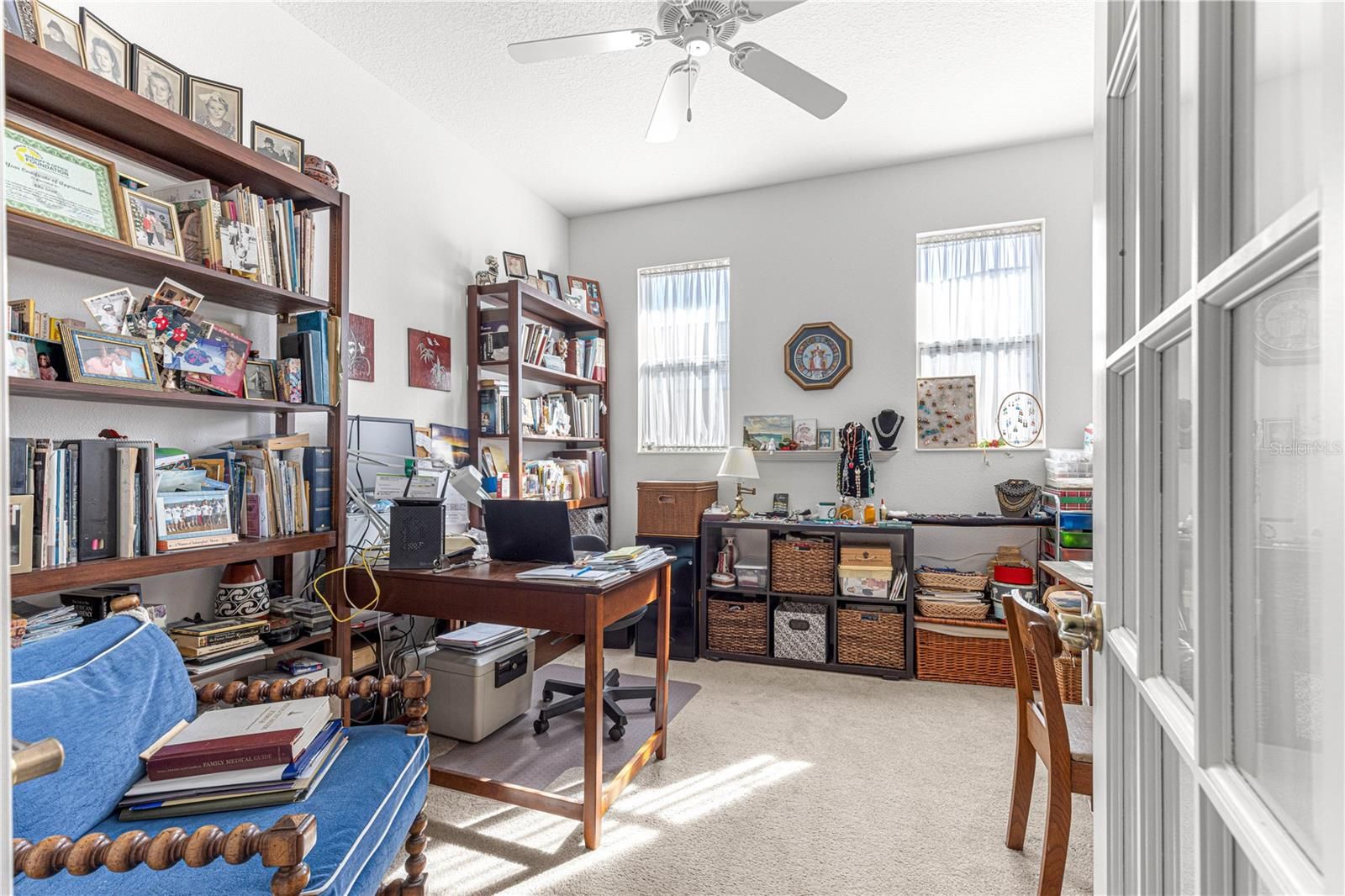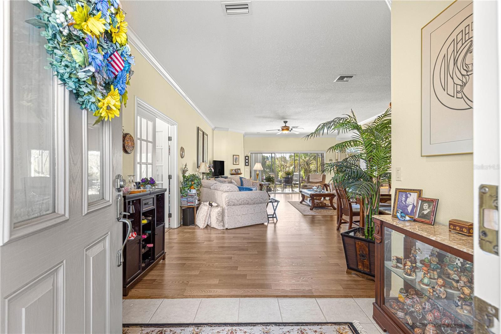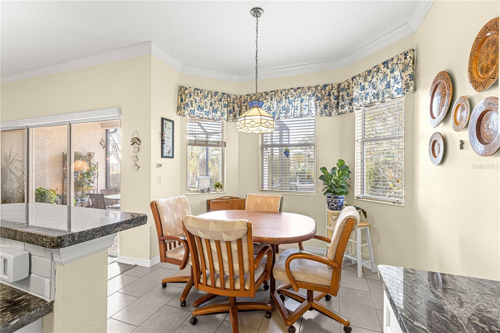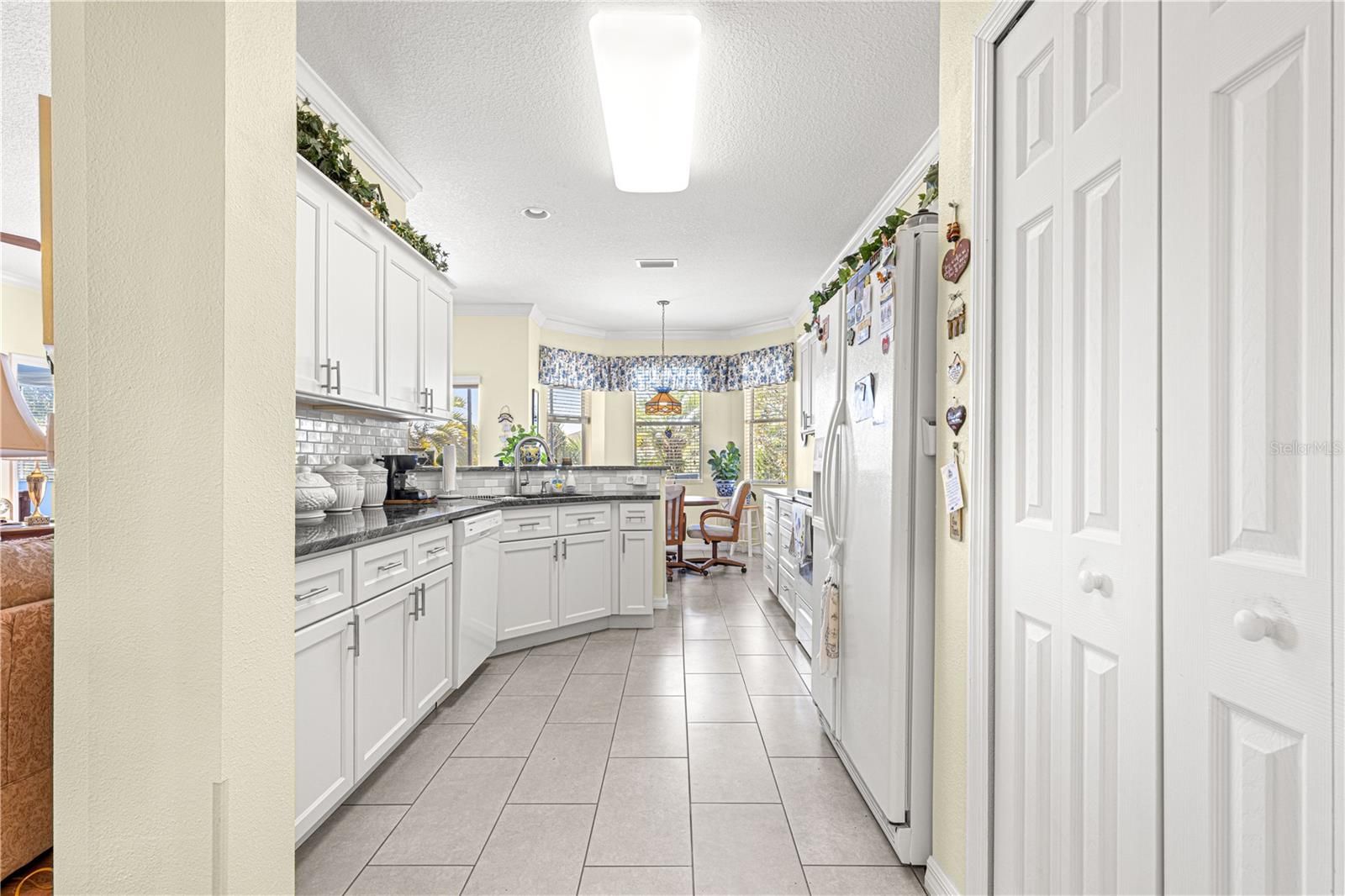 Welcome to the much sought after 55+ community of On Top of the World! The outside of this Hanover features mature landscaping and palm trees to give it that true Florida feel. Entering the home there are 2 bedrooms, a flex/office space and 2 bathrooms. The foyer has tiled flooring leading to your spacious living and dining area. This area has wood look laminate flooring, soaring ceilings and a triple slider to your screened lanai and very large birdcage. The kitchen has been freshly renovated with new white shaker cabinets, a pretty tiled backsplash, long rectangular tile on the floor and fabulous granite counters! This kitchen is a chef's dream. Microwave and dishwasher are newer. There is also a newer garbage disposal. There's a nook off the kitchen with a bay window. The flex/office space has french doors and carpeting. The perfect space for an office or hobby area. The seller also upgraded to the higher ceilings than the standard for this model. The primary bedroom is quite large with wood look laminate flooring, ceiling fan and large windows. There are also his & her walk-in closets. Plenty of space. The primary bath features a step in shower and a double sink vanity. The second bedroom is perfectly sized for guests and they will have their own bath with a tub/shower combo. Inside laundry room has gas dryer hook up. If you like to entertain or enjoy have your family over the large lanai and birdcage in the back is the perfect spot for that. Partially under cover if we get some of that liquid sunshine. Inside paint was refreshed in 2023. HVAC is a 2023 with the UV light and electronic air filter. Screens on the front of the garage. Call for your appointment to see today!