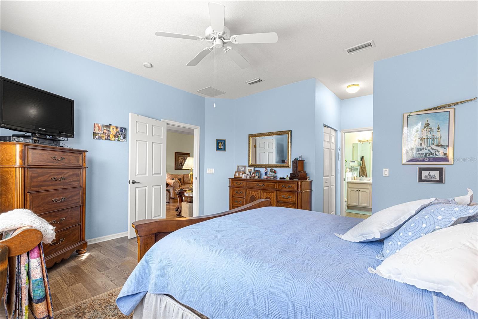 - Ceiling Fan(s), Crown Molding, Eat-in Kitchen, High Ceilings, Main Level Primary, Stone Counters, Thermostat, Walk-In Closet(s)