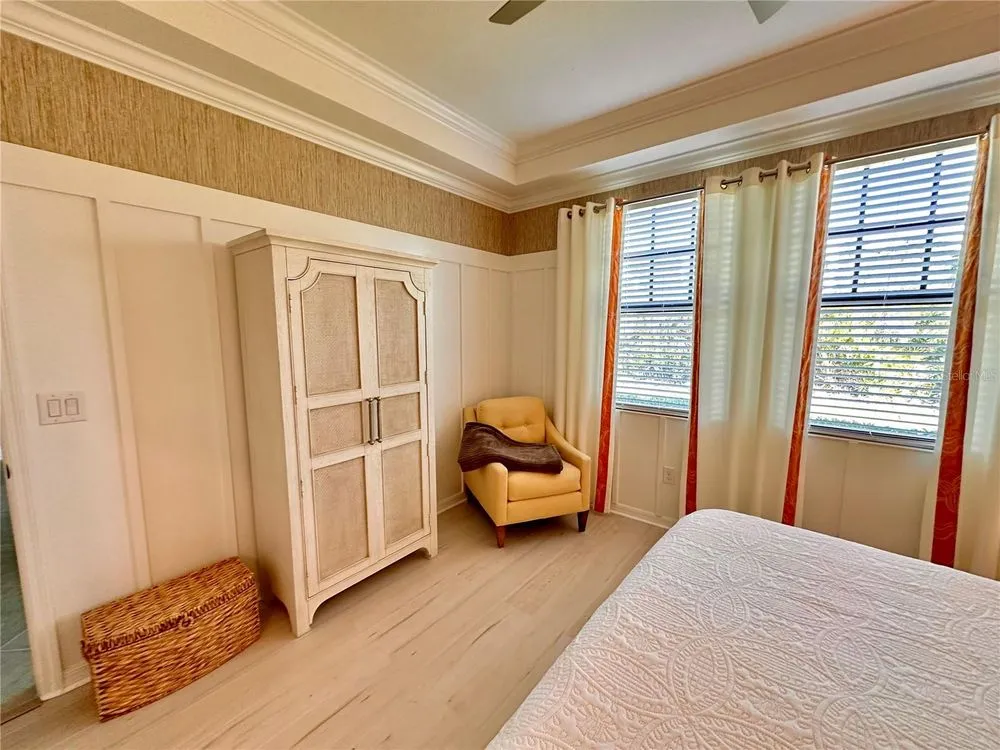 - Ceiling Fan(s), Coffered Ceiling(s), Crown Molding, Eat-in Kitchen, High Ceilings, In-Wall Pest Control, Kitchen/Family Room Combo, Open Floorplan, Main Level Primary, Solid Surface Counters, Split Bedrooms, Stone Counters, Thermostat, Tray Ceiling(s), Walk-In Closet(s), Window Treatments