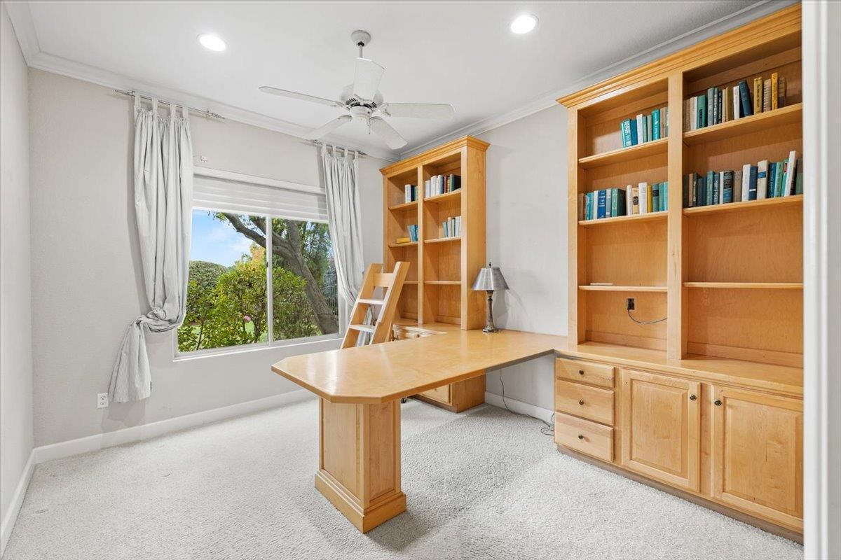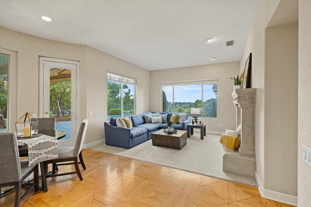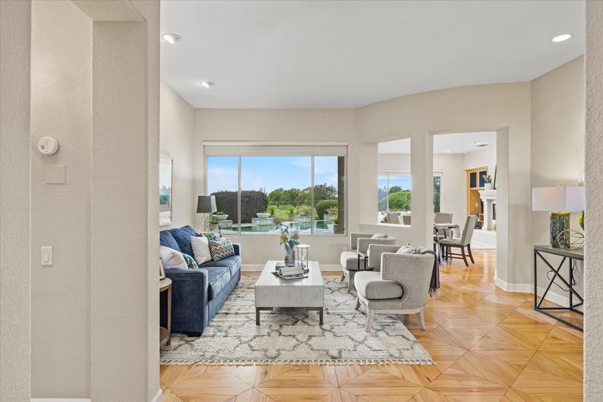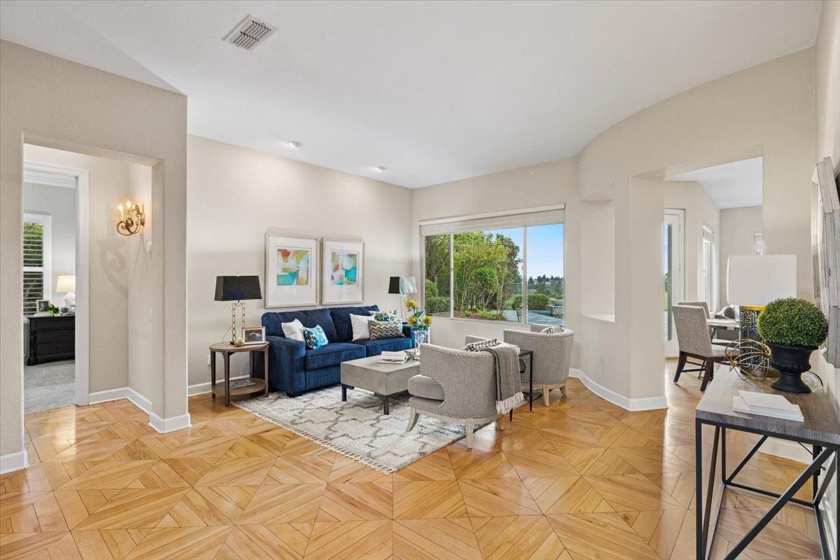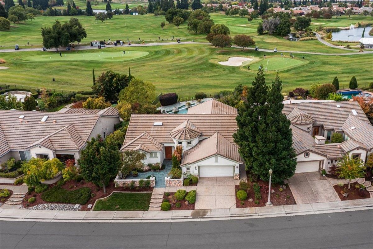 Superb views and fantastic location at this former model home in Sun City Lincoln Hills! Super close to the mail lodge. Popular Sausalito plan with beautiful wood floors and honed granite counters. Two bedrooms plus den. Formal living and dining rooms. Newer SS appliances. Primary suite has glass door to back patio. Tiled front courtyard and rear patio. Extended patio in back also has a roll out awning for an even larger covered patio area. Beautiful built in pool. Iron fencing on all three sides. Roof and pool have been recently serviced. Clear pest report too. Don't miss the attached video!