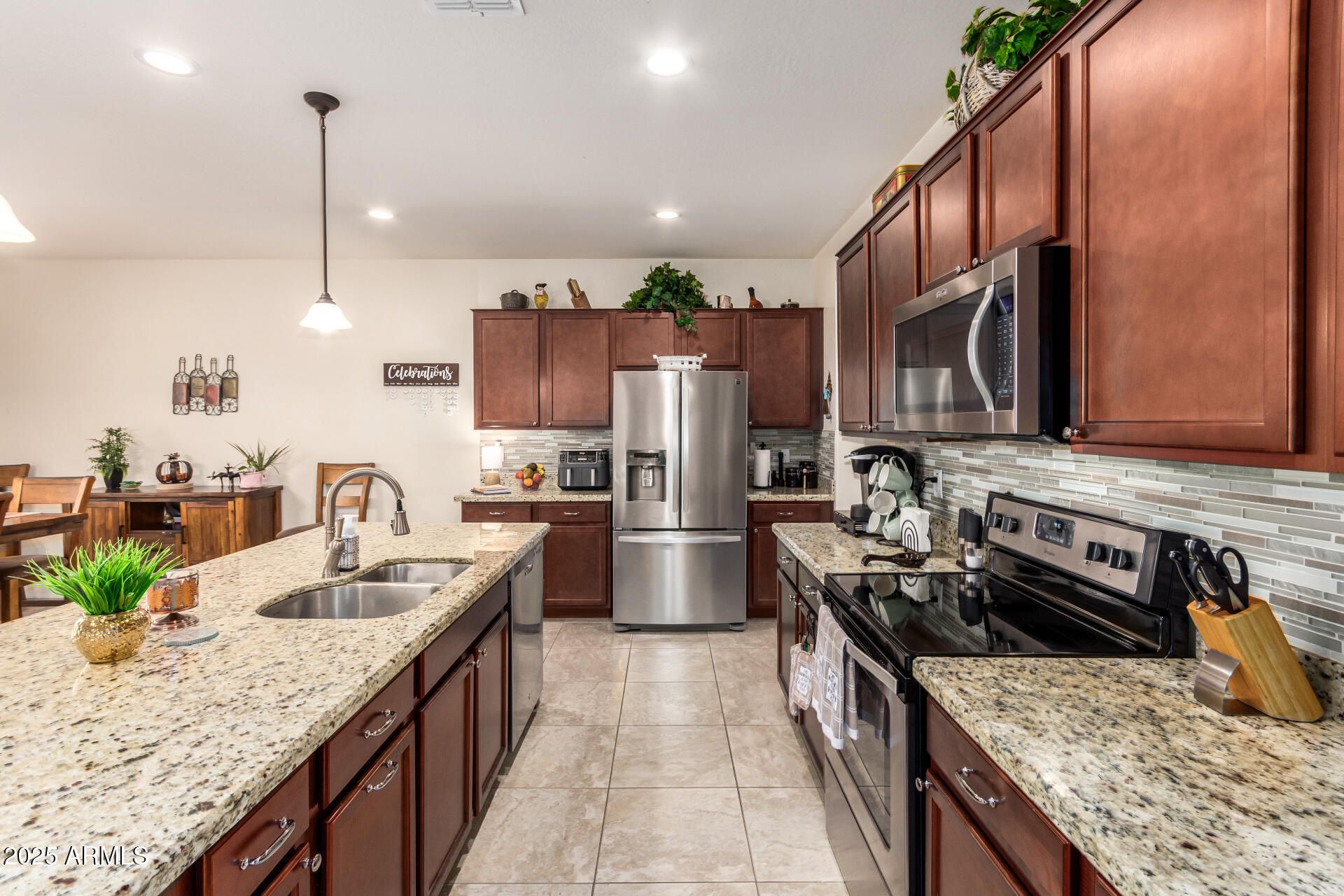Enjoy Adult living in this beautiful home at Encore in the Eastmark Community. This 2bd/2ba home features a spacious great room with an adjacent optional den or dining room. The kitchen features granite countertops, pendant lighting, decorative backsplash, stainless appliances, huge island and spacious dining room. Beautiful shutters and shades throughout. Large primary room, the bathroom has a raised vanity, private water closet, ample walk-in-closet. There is a security door at entry, front yard porch and low maintenance landscaping. Enjoy the extended backyard paved patio, synthetic grass, full grown trees and shrubs.Encore offers resort-style amenities: heated pool, tennis, bocce, pickleball, fitness center, arts/ crafts room, café and endless activities + Home Warranty included!
