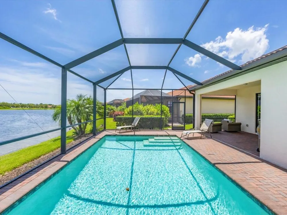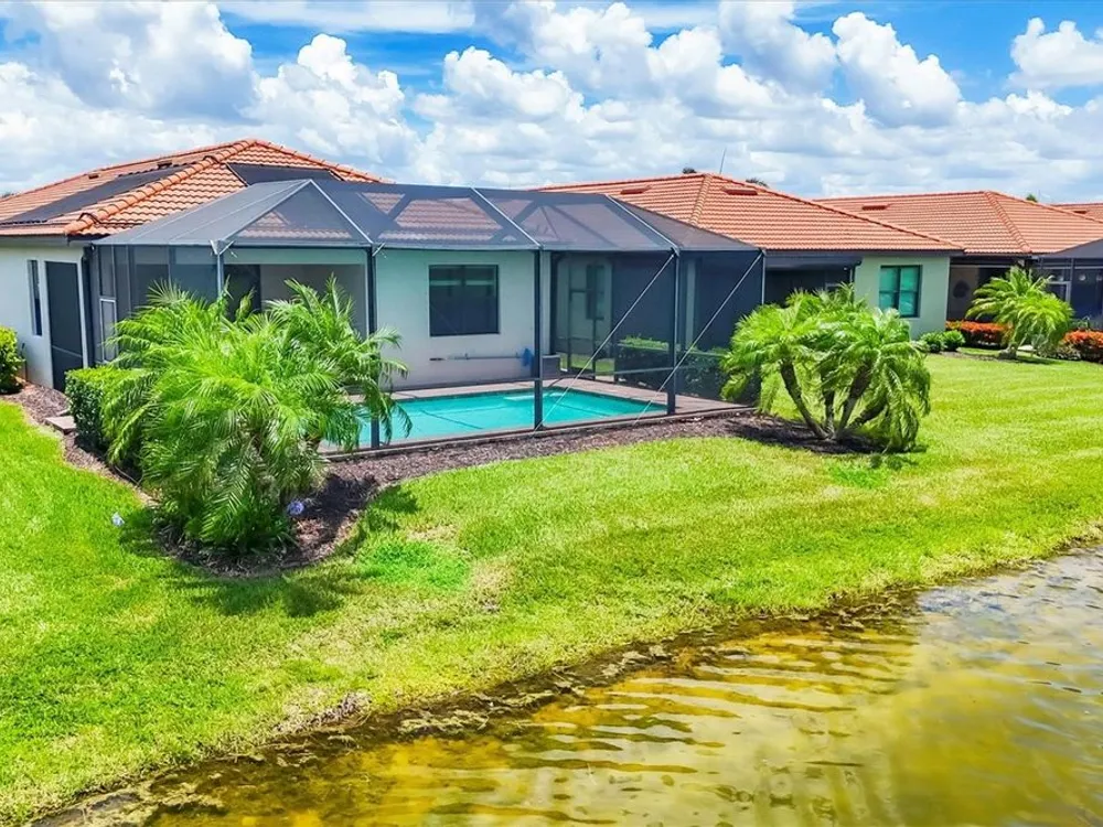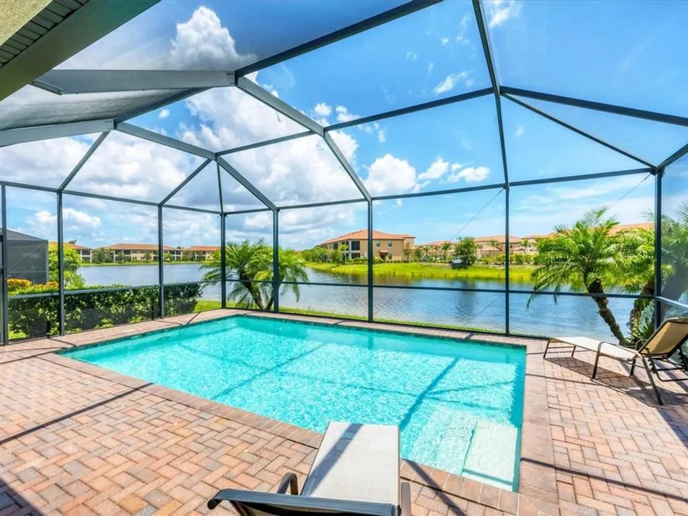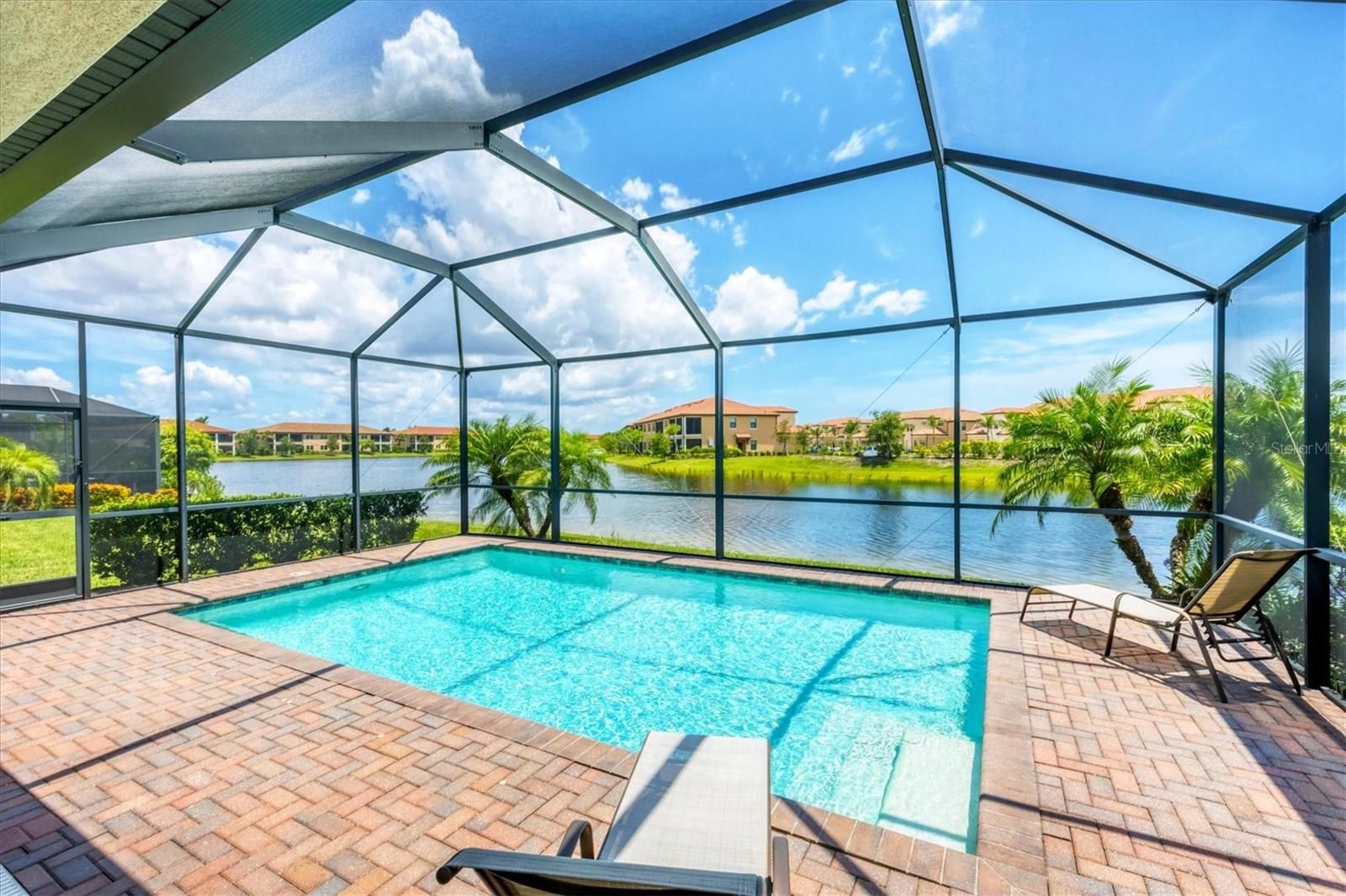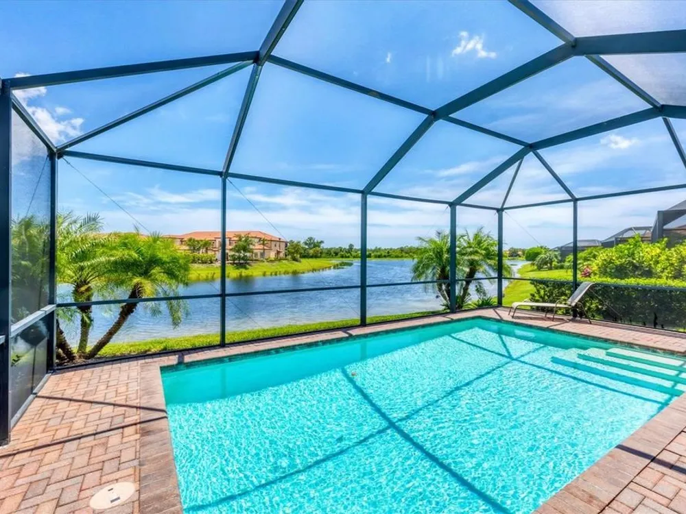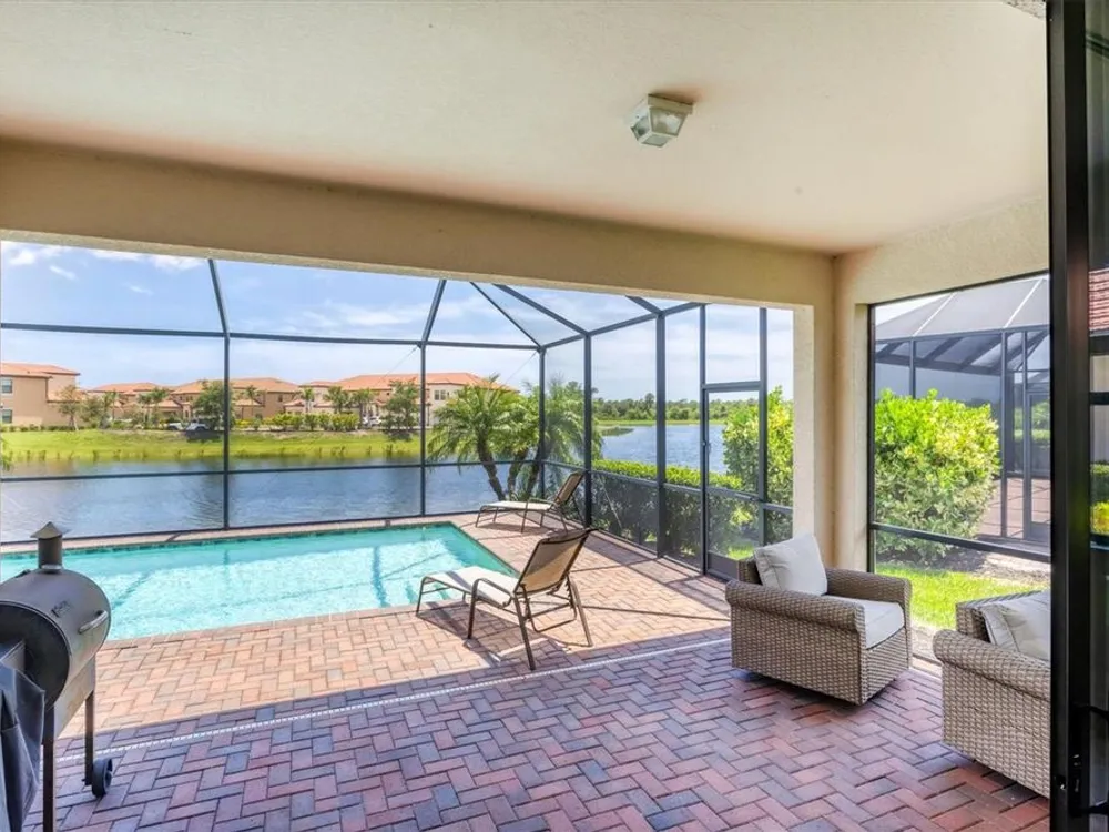 TRULY SPECTACULAR VIEWS!! Private pool and lanai overlooking lake views in all directions. SOUTHWEST EXPOSURE for sun all day long. PAVERED LANAI SURROUNDS SOLAR HEATED POOL. Looking for a little relaxation in the shade- sit on your front porch- a great place for reading a book and watching or engaging with the neighbors walking by. This Milan floor plan has 2BR/2BA and a SEPARATE FLEX ROOM that has multiple uses and can be whatever you prefer. Often used as an office space or den with a pull out sofa for extra guests. The large open great room is the heart of the home, combining living room, kitchen, and dining room areas together for cozy gathering or all out entertaining space. The whole home is enhanced with a Neutral, Warm decor, high ceilings, crown molding, and 8 foot doors. Gourmet kitchen offers GRANITE counters, STAINLESS STEEL appliances/upgraded refrigerator, extra recessed lighting, and Island perfect for eating breakfast or setting out hors d'oeuvres and wine. Tile flooring throughout the main rooms with carpets in the 2 bedrooms only. Spacious en suite master bedroom with 2 WALK IN CUSTOM BUILT closets. Master bath has dual sinks and walk in shower. Large Guest bedroom at other end of home for privacy. Separate laundry room with wash sink. HURRICANE SHUTTERS. Not in Florida to see it in person? Go to the 3D Walkthrough at : https://my.matterport.com/show/?m=heBGDXv4DTf Sarasota National is Venice’s premier community, offering over 1,300 acres of preservation, conservation, lakes, and open spaces with breathtaking views. As an Audubon International Certified Sanctuary, it provides the perfect backdrop for the community’s 18-hole championship golf course. Enjoy resort-style amenities, including a huge pool and spa, Tiki Bar, tennis courts, pickle ball, bocce courts, a 7000 sq. ft. fitness center, a 30,000 sq. ft. clubhouse with dining and incredible views, and a coffee lounge/library/card room/meeting place. Plus, there’s a day spa for relaxation. The community is just minutes from the new Wellen Park shopping area and Atlanta Braves stadium, with Venice Beach and downtown Venice only a short drive away. Whether you enjoy dining, shopping, or outdoor activities, this location has it all. Live the Florida lifestyle and make every day feel like a vacation! Schedule your tour today! BE AWARE, hitting the "contact agent"button on Zillow or 3rd party websites will NOT take you to the person who has the house on the market. SEE THIS GREAT HOME TODAY and FIND YOUR FLORIDA LIFESTYLE!