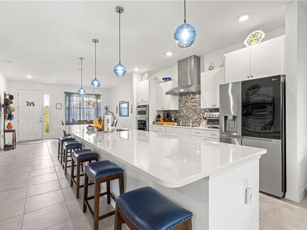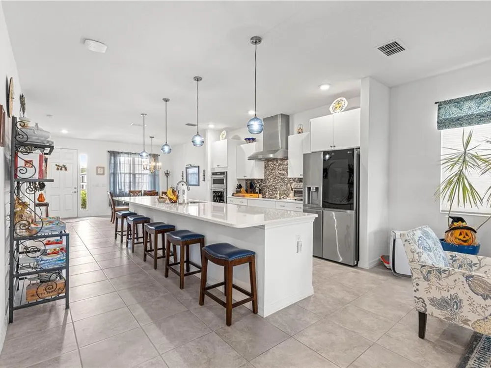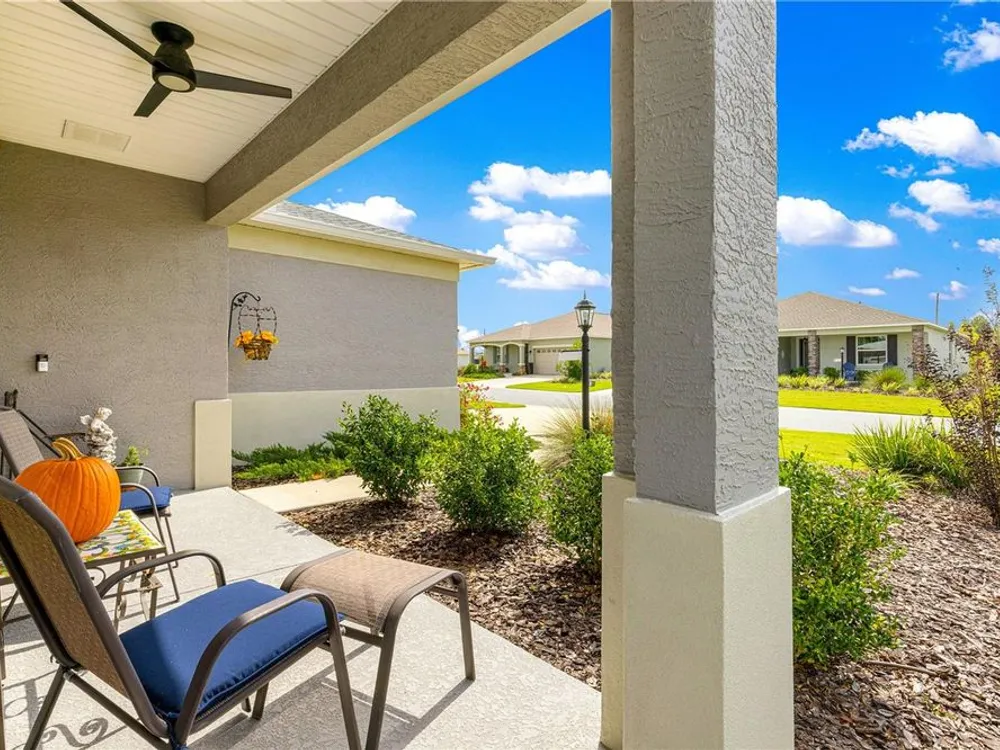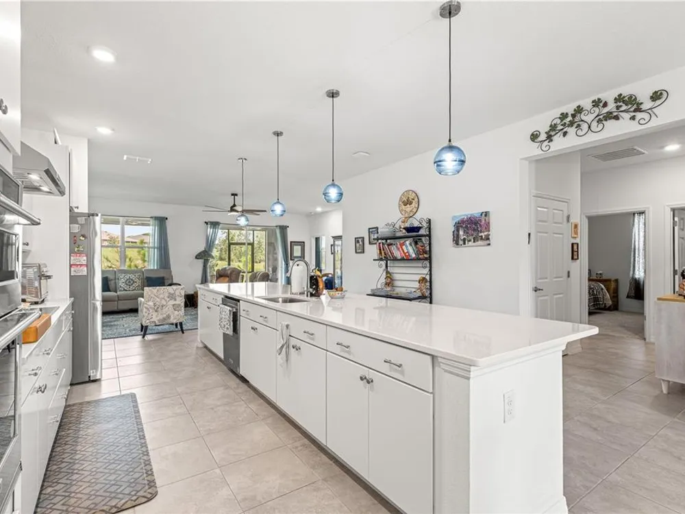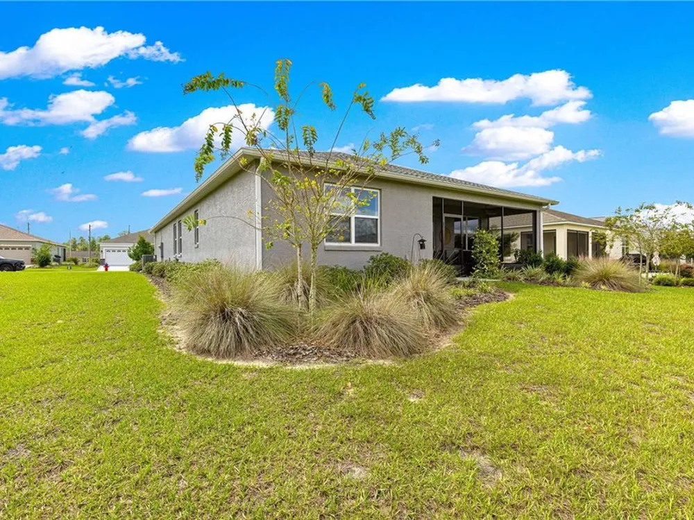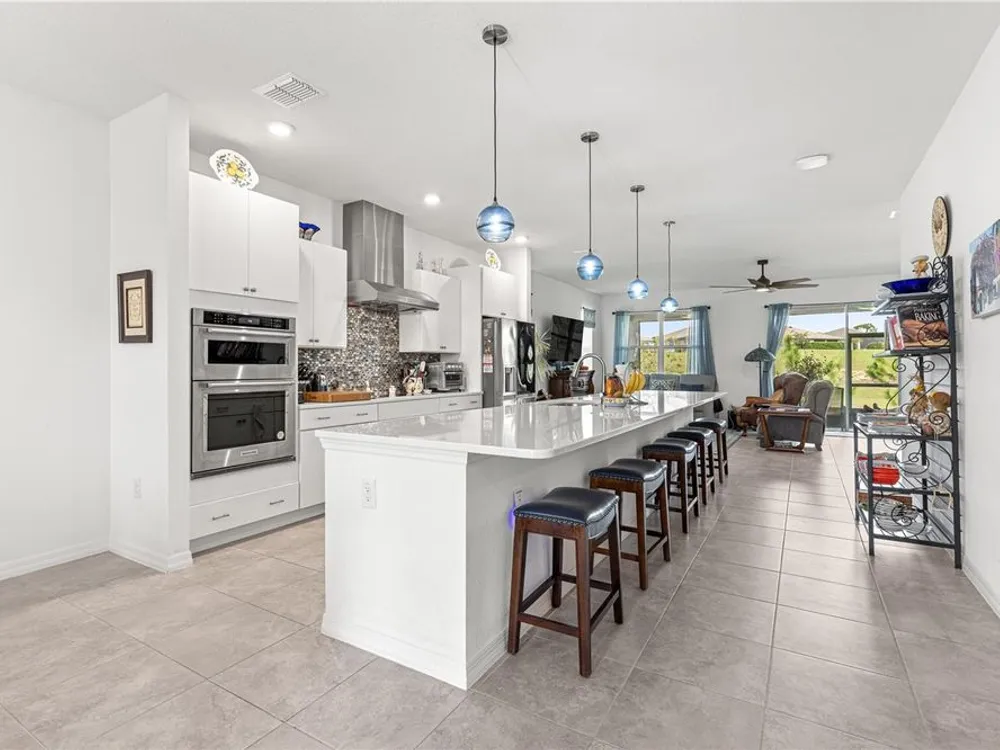 Elegant and modern, this Orchid Model home in the desirable On Top of the World community combines comfort, luxury, and privacy in a serene cul-de-sac setting. Built in 2022, this 3-bedroom, 2-bath home is perfectly positioned on a choice lot backing onto an expansive retention pond, offering peaceful views from the screened lanai—an ideal spot for morning coffee or evening relaxation. Inside, the open-concept design centers around a spectacular chef’s kitchen featuring a 15-foot quartz island perfect for entertaining. The kitchen is equipped with high-end stainless-steel appliances, soft-close cabinetry, a gorgeous tile backsplash, and abundant prep and storage space. The natural flow extends into the dining and living areas, enhanced by upgraded lighting fixtures and ceiling fans throughout. The primary suite includes a spacious walk-in closet and a luxurious main shower with modern finishes, while two additional bedrooms provide ample space for guests or a home office. Additional enhancements include a whole-house surge protector, water softener and filtration system, rain gutters, and an insulated garage extended by four feet for added storage or workspace. This smart home is designed for efficiency and convenience, blending technology with everyday living. Residents enjoy maintenance-free living with the HOA covering basic internet, trash removal, lawn mowing and edging, and exterior repainting every seven years. The community’s extensive amenities are easily accessible by golf cart, including grocery stores, multiple pools, fitness centers, and Veterans Park—making this an exceptional home for those seeking both privacy and active living in one of Florida’s premier 55+ communities.