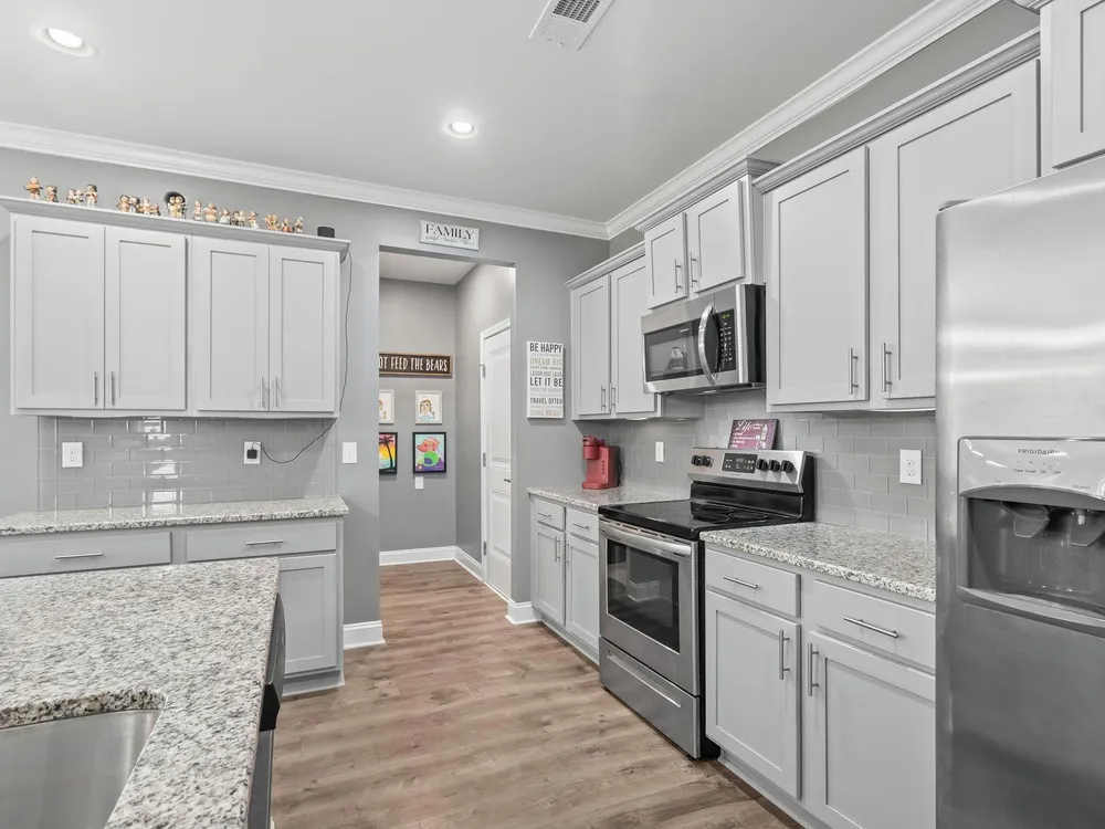 - Split Bedrooms, Breakfast Bar, Bedroom on Main Level, Entrance Foyer, Kitchen Island, Stainless Steel Appliances, Solid Surface Counters