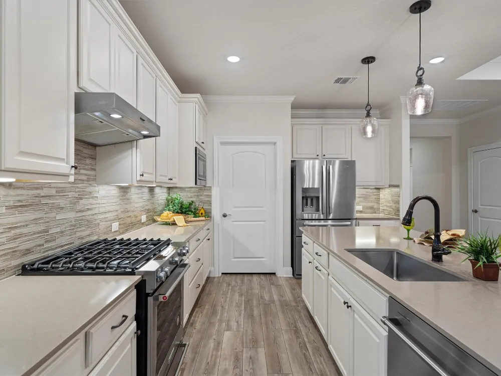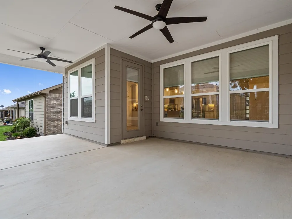 A stylish glassed entry door welcomes you at the front sitting porch of this pristine Sun City Texas Prestige plan near first class amenities and miles of walking trails. Inside, a private Guest Bedroom and deluxe en suite bath will have visitors perfectly pampered. Ahead, off the Gallery Foyer, French doors open to the Study, a wonderful Office-at-Home, where twin windows provide rich natural lighting and crown molding rims the high ceiling. The Foyer opens to the Great Room, where a tray ceiling raises the height to ten feet as a breezy fan keeps things in check. Ideal for entertaining, or everyday use, the Open Kitchen is part of the Great Room, while a lowered bar top illuminated with pendants is ideal for Movie Night or large-scale entertaining. The Kitchen sparkles with stainless-steel KitchenAid appliances plus refrigerator, gleaming quartz counters and a picture-perfect backsplash. Gas cooking and a handy trough sink complete the good looks. The Dining Area can be as dressy or casual as you desire, while it is also the access point to the large Covered Patio, an outdoor retreat ideal for lounging, or cooking out. Quietly located at the rear of the home, the Primary Bedroom hosts yet another tray ceiling, while the en suite Primary Bath is spa-like and thoughtful, hosting two Walk-In Closets, a Walk-In Shower and a wide dual vanity. At the front of the home, a well-placed Powder Room is always desirable, while the Laundry complete with operable window is ready, willing, and able. Don't miss the roomy Two-Car Garage complete with custom storage, water softener, whole-home generator and snazzy epoxy floor. Near access to Ronald Reagan Blvd. and its upcoming shopping and eateries, even the location is hip and trendy.