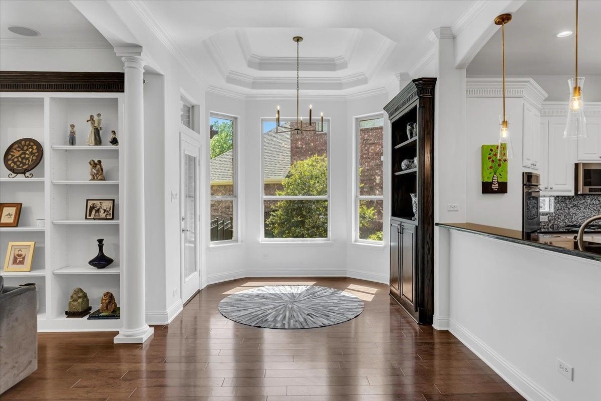 IN A CLASS OF ITS OWN! This custom K. Hovnanian home is perfectly positioned at the end of a quiet cul-de-sac, backing to a scenic greenbelt with an ideal east-southeast view. Designed with comfort and elegance in mind, this home offers a rare guest or in-laws suite with a private entrance—ideal for extended family, guests, or in home care provider. The exterior is beautifully landscaped with a wraparound patio, and arbor creating a peaceful setting perfect for relaxing or entertaining. Step inside to find rich wood floors, detailed crown molding, and large picture windows that bring in natural light. The home includes three fireplaces, 10’ and 11’ tray ceilings, built-in cabinets, granite countertops throughout, and a stylish wet bar with wine cooler—perfect for entertaining. The gourmet gas kitchen is equipped with a Bosch cooktop, stainless steel appliances, granite counters, a walk-in pantry, breakfast bar, and smart storage features like double pull-out shelves. The primary suite is a private retreat, complete with a cozy sitting room or office, a double-sided fireplace, and a spa-inspired bath featuring a custom walk-in shower. The oversized seasonal walk-in closet includes built-in shelves, soft-close drawers, and direct access to the laundry. The private guest suite has its own front door, living space, bedroom with built-ins, step-in shower, and a sit-down vanity—perfect for visitors or multi-generational living. Upstairs, you’ll find a large library with built-in bookcases, fireplace, projector and screen for movie night, and an additional bedroom and full bathroom, plus attic access for storage. This home is thoughtfully designed and full of luxury features—a must-see to fully appreciate!