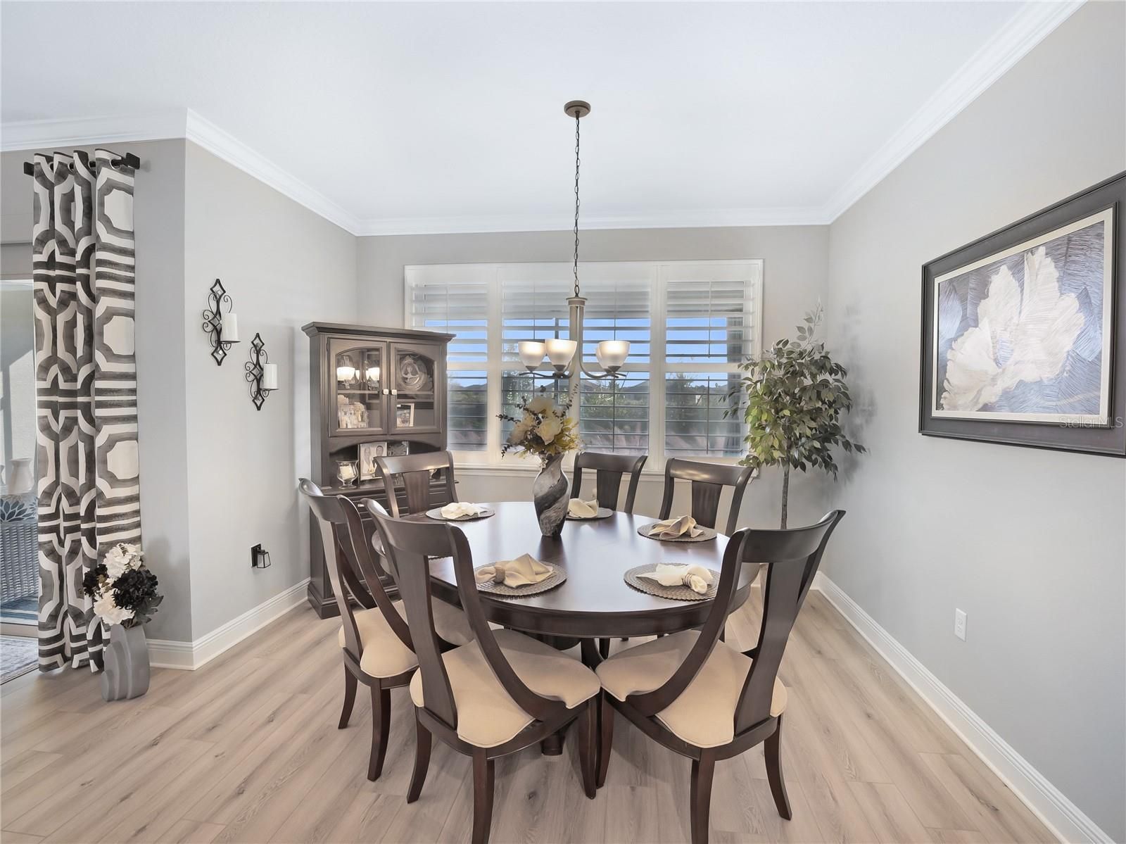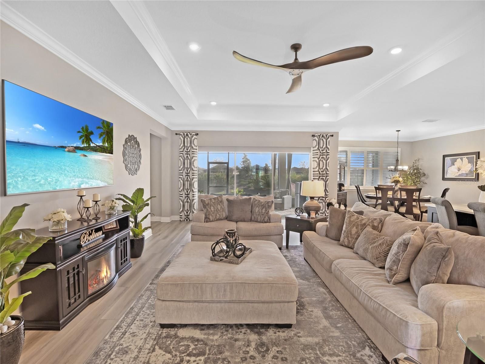 - Built-in Features, Ceiling Fan(s), Crown Molding, Eat-in Kitchen, High Ceilings, Kitchen/Family Room Combo, Open Floorplan, Main Level Primary, Split Bedrooms, Stone Counters, Tray Ceiling(s), Walk-In Closet(s), Window Treatments