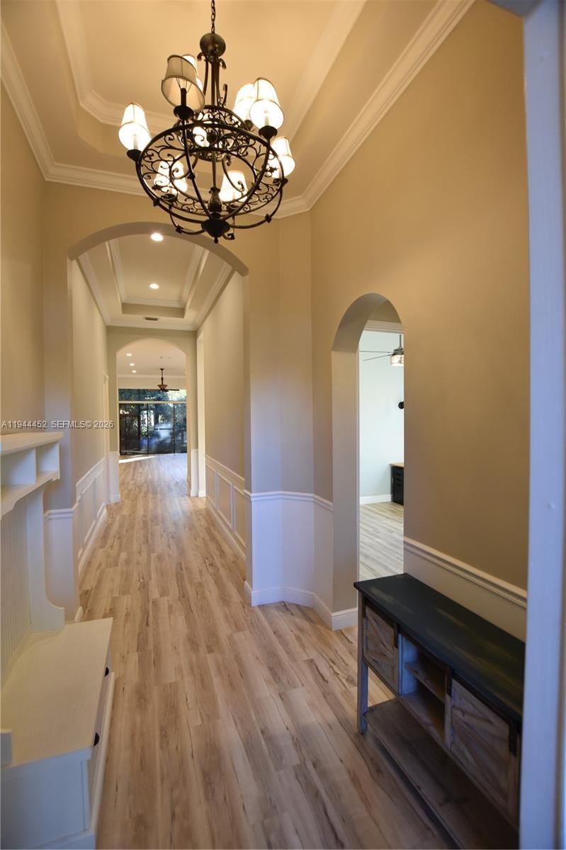 This beautifully updated 3-bedroom home in Tivoli Lakes greets you with a spacious open floor plan, a charming foyer, and lush landscaping surrounding the front, sides, and back. The counter-height, eat-in kitchen includes a built-in desk, while 11-foot ceilings with crown molding run throughout the home, complemented by a stunning tray ceiling in the master bedroom. The kitchen and second bathroom have been stylishly renovated, and the electric fireplace features stonework extending to the ceiling. Fixtures, window treatments, and chandeliers have all been thoughtfully updated. The garage offers an epoxied floor and added stylish cabinets for organized storage. The master bath boasts two fully built-out walk-in closets. Out back, enjoy a screened-in patio surrounded by tropical greenery. Tivoli Lakes is fully fenced with a 24-hour manned security gate and offers amenities including a theater, grand ballroom, fully equipped gym, pickleball and clay tennis courts, billiards and card rooms, a heated pool, jacuzzi, shuffleboard, and more. Conveniently close to beaches, the Turnpike, and I-95. Flooring updated in 2021 along with new baseboards and crown molding. Kitchen full remodel 2023 with Quartzite countertops. Storage in built ins, MB Closets, Office reading nook, garage cabinets and epoxy flooring done in 2021. Custom window treatments and blinds done 2023. Please be sure to click on 360Degree link for a virtual tour of the home online.