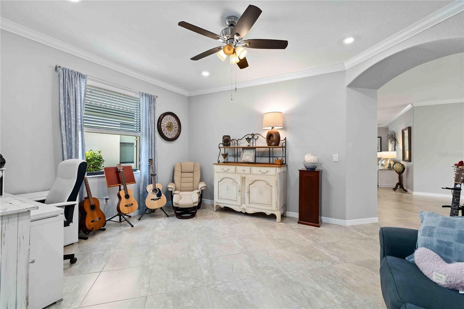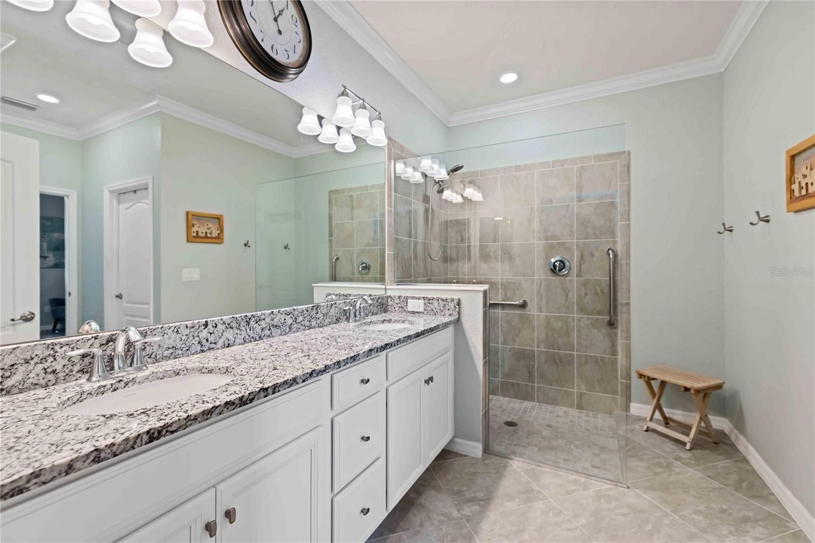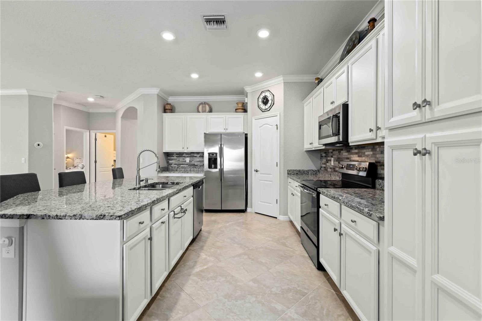 - Ceiling Fan(s), Crown Molding, Kitchen/Family Room Combo, L-Shaped Dining Room, Open Floorplan, Main Level Primary, Smart Home, Solid Surface Counters, Solid-Wood Cabinets, Split Bedrooms, Stone Counters, Thermostat, Walk-In Closet(s), Window Treatments