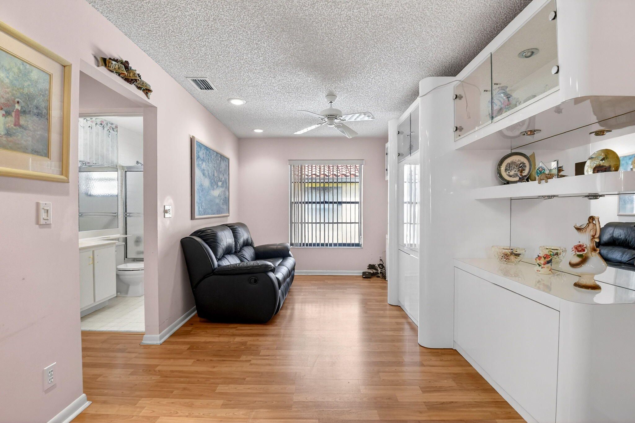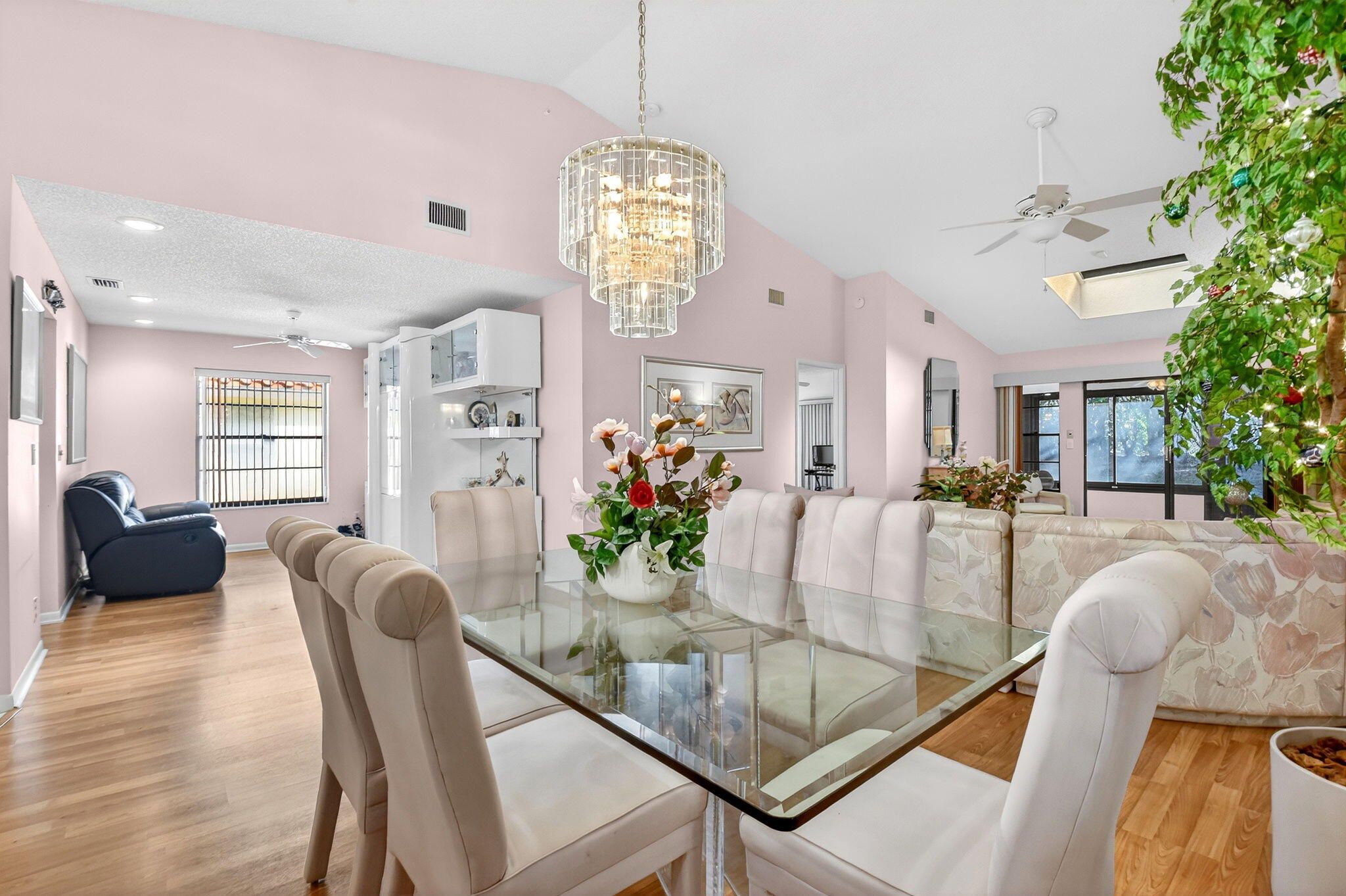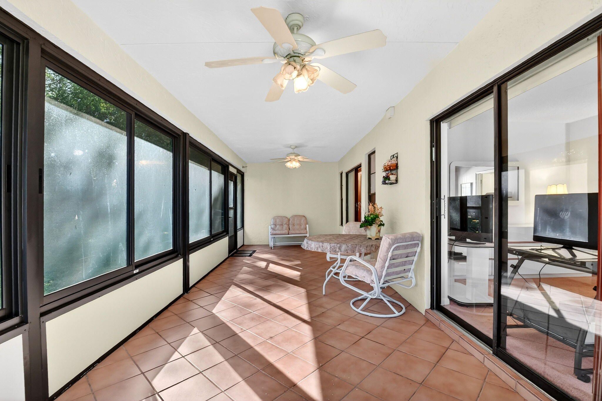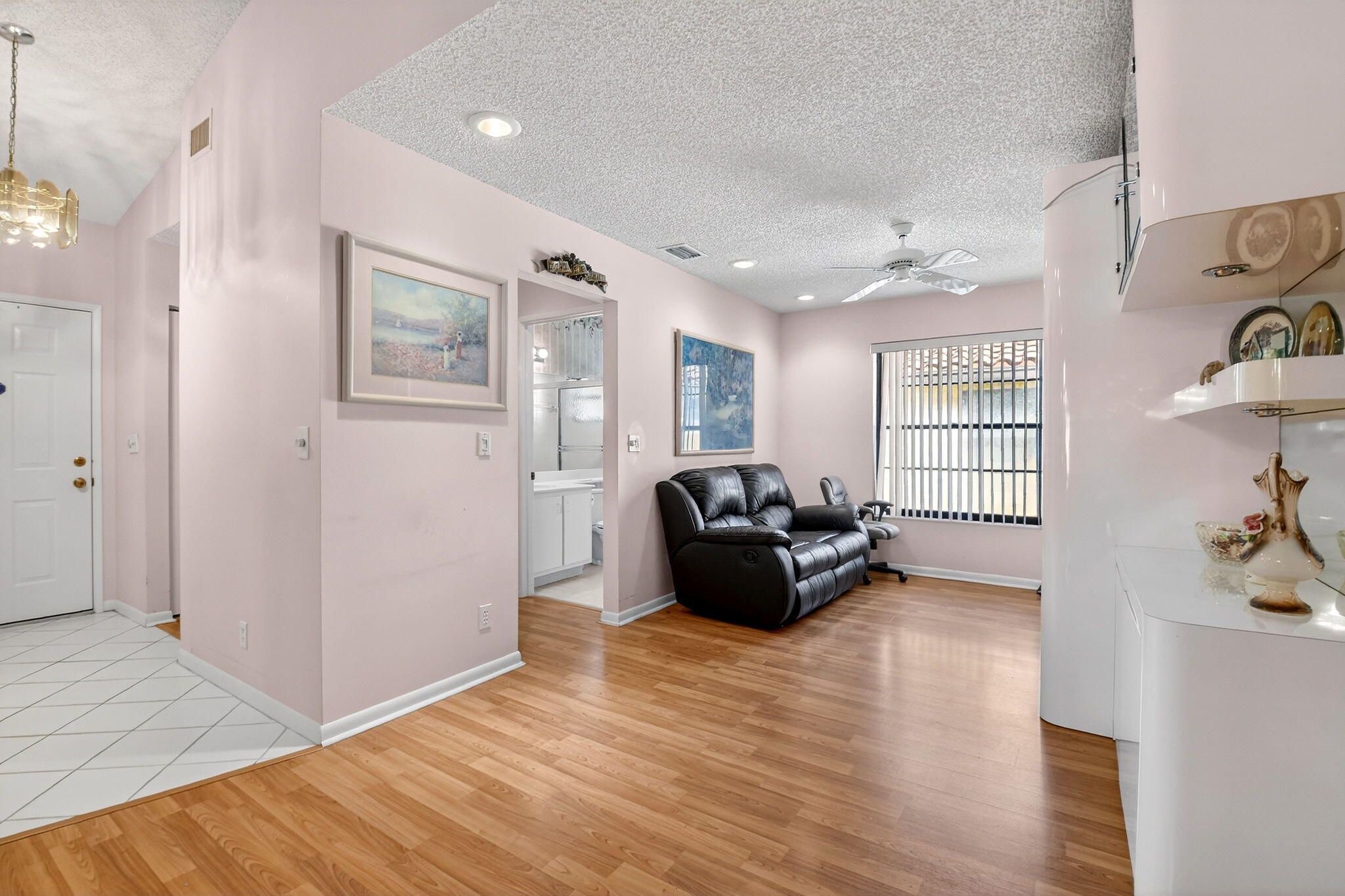 Well-kept 3BR/2BA villa with a one-car garage and a large 300 sq ft enclosed lanai in the desirable 55+ Palm Chase Lakes community. This light-filled home offers two bedrooms plus a flexible den or third bedroom, skylights, and a 2024 A/C. Enjoy resort-style living with a clubhouse, fitness center, pools and sauna, pickleball, tennis, billiards, shuffleboard, and an active social calendar. Ideally located close to I-95, the Florida Turnpike, shopping, dining, and within walking distance to houses of worship.