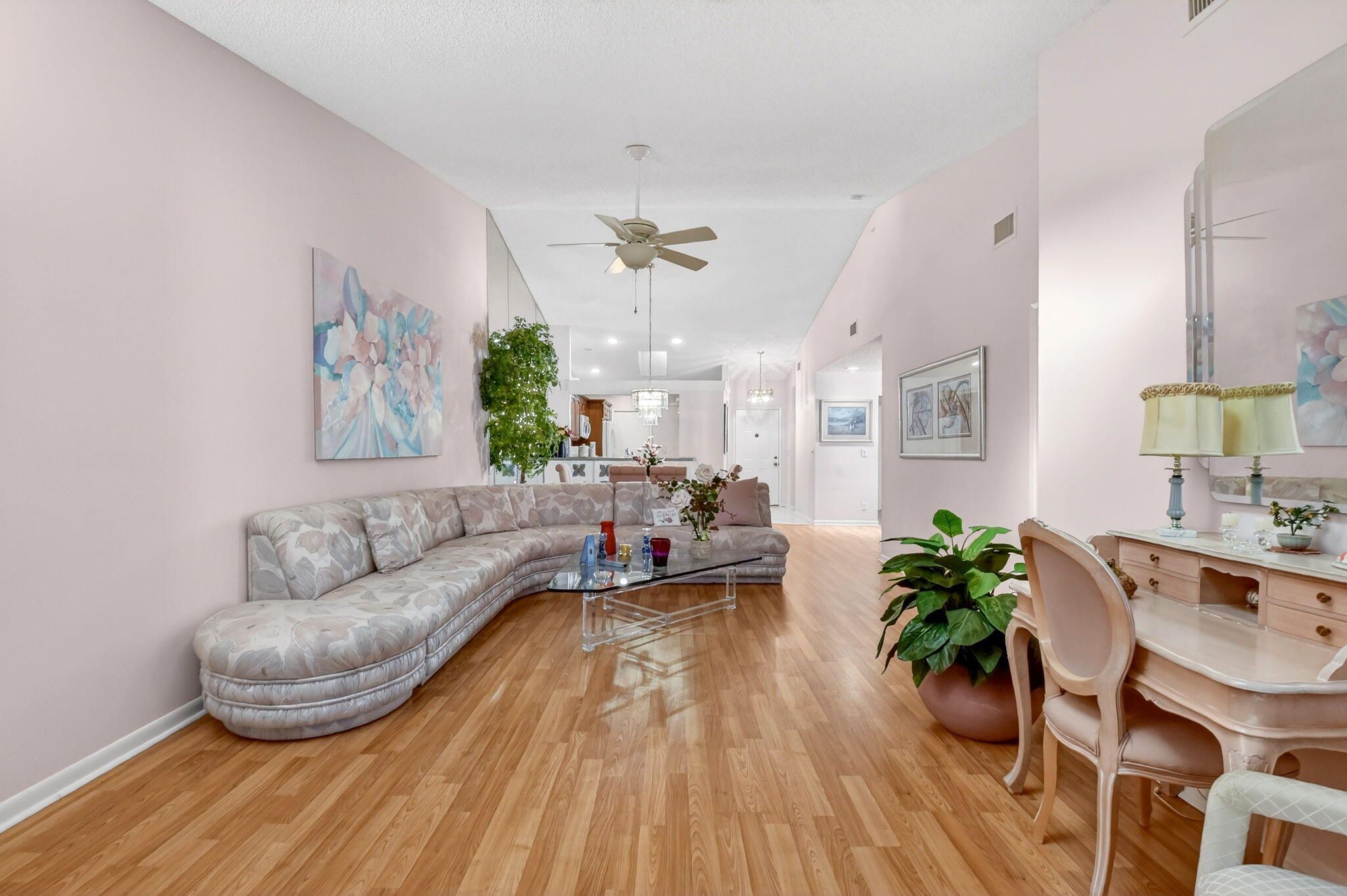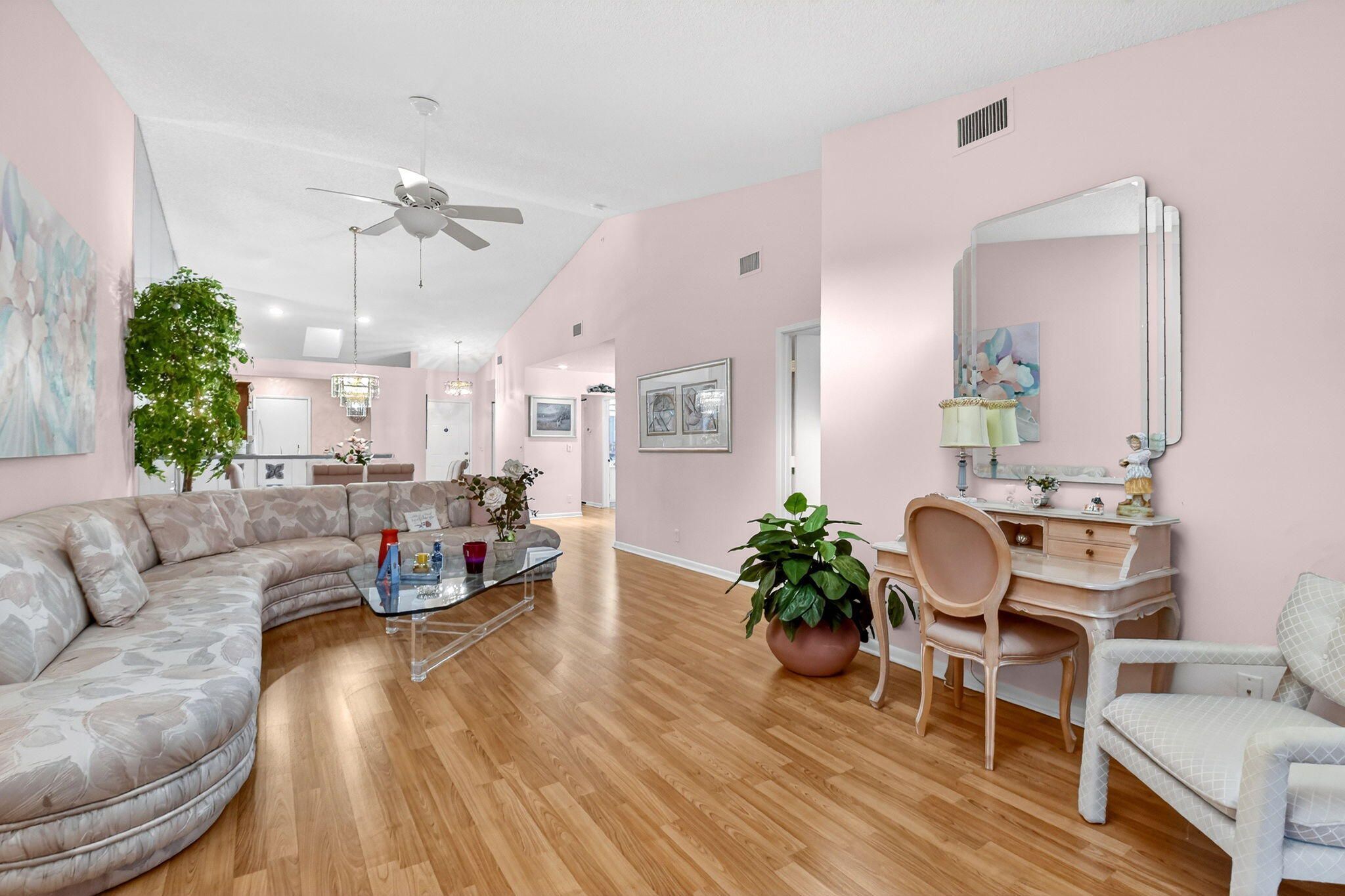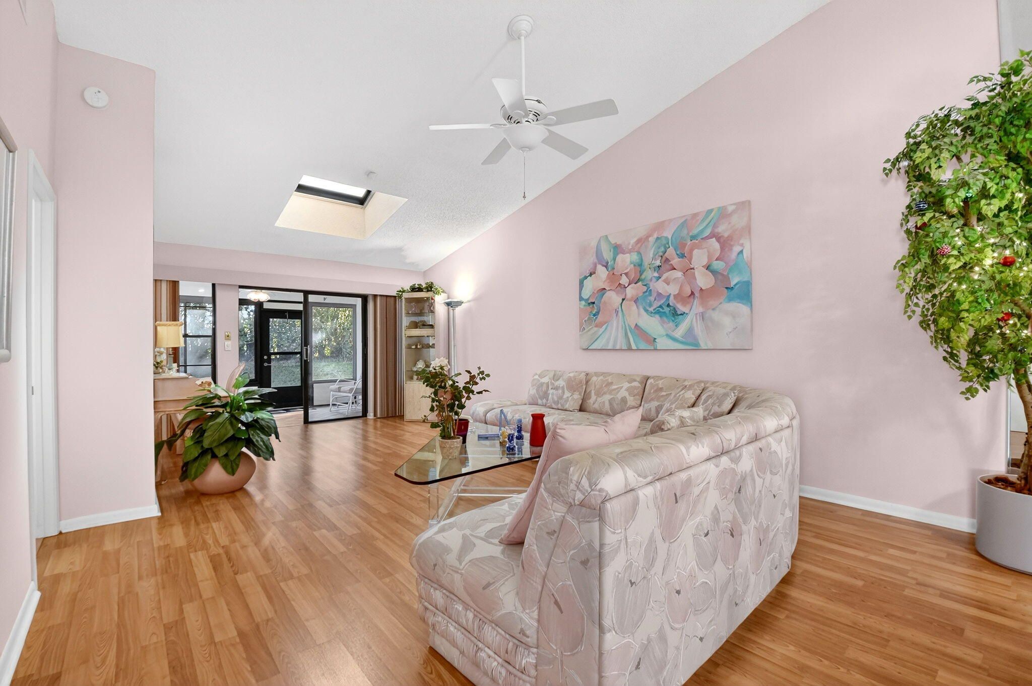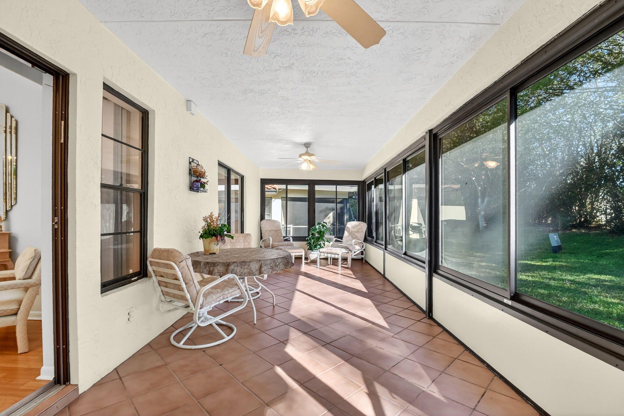 Well-kept 3BR/2BA villa with a one-car garage and a large 300 sq ft enclosed lanai in the desirable 55+ Palm Chase Lakes community. This light-filled home offers two bedrooms plus a flexible den or third bedroom, skylights, and a 2024 A/C. Enjoy resort-style living with a clubhouse, fitness center, pools and sauna, pickleball, tennis, billiards, shuffleboard, and an active social calendar. Ideally located close to I-95, the Florida Turnpike, shopping, dining, and within walking distance to houses of worship.