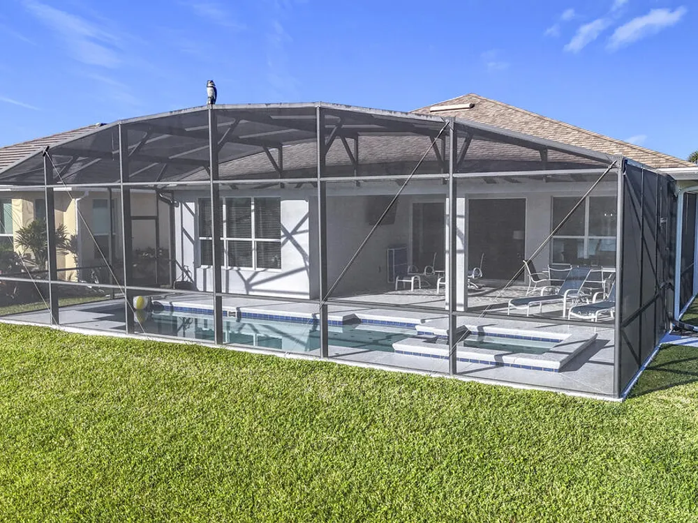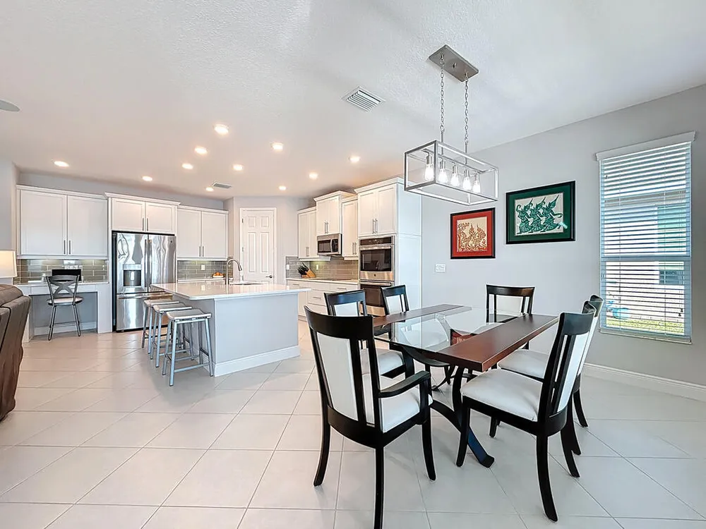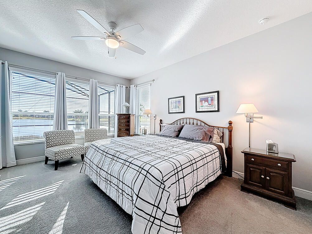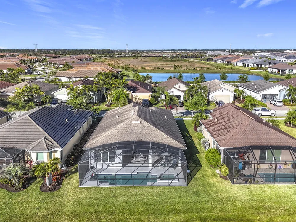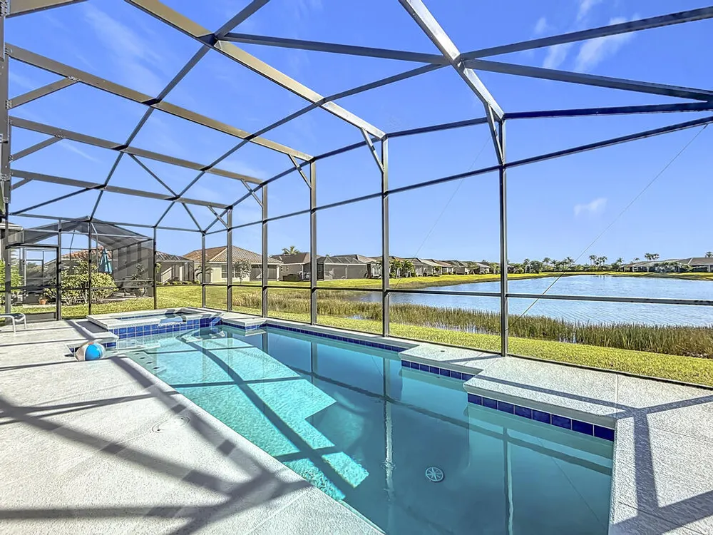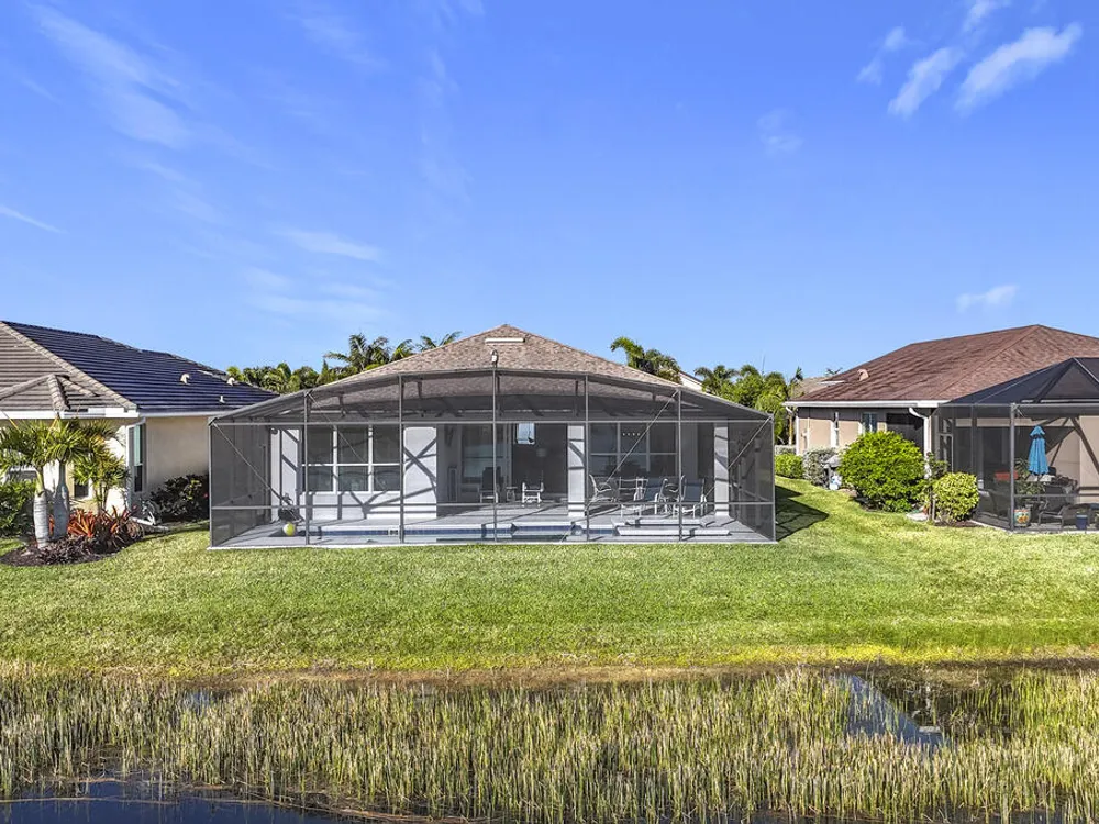 Welcome to your Vitalia dream home! This bright and open home offers breathtaking long-water lake views visible from the entrance foyer and extending into the dining area, great room and primary bedroom. This popular 2-bedroom, 2-bath Jensen model with a versatile den offers over 2000 square feet of luxurious living space. The expansive outdoor living area includes a screened lanai where you can enjoy sunrises, moonrises, rocket launches and tropical breezes whether relaxing in your heated spa, floating in your gorgeous saltwater pool or watching the big screen TV. Nestled in a prime location, this home is the perfect waterfront retreat for relaxation and entertaining family and friends. As you step inside, you'll be captivated by the tile flooring that flows seamlessly throughout the