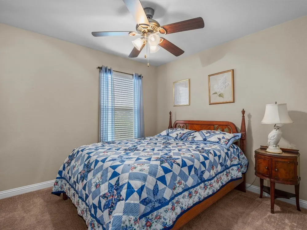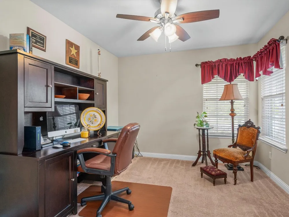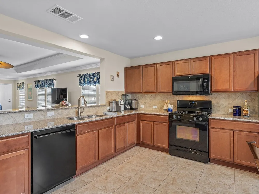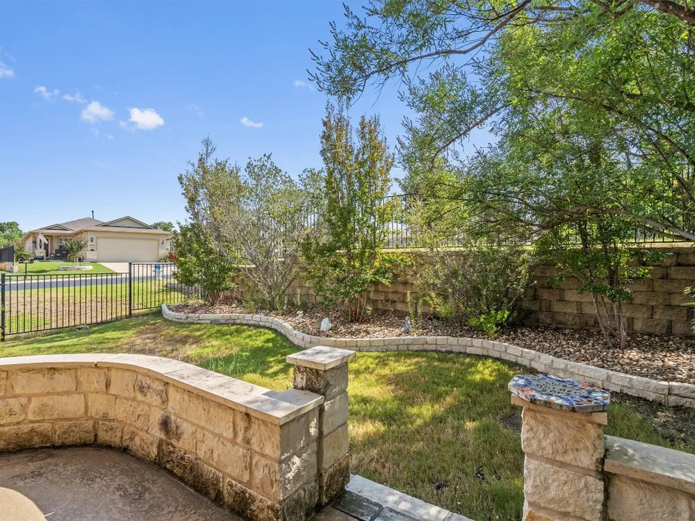 A surprisingly private and fenced back yard creates a cozy outdoor living area at this delightful Sun City Texas Pine Spring plan located on a choice corner lot near Cowan Creek Golf Course and top-notch amenities. Inside, a tiled Foyer rimmed with crown molding welcomes you and introduces the Great Room, where a tray ceiling raises the height to nine feet and tile floors form a perfect backdrop for favorite rugs. A granite bar-top gently separates the Great Room with Dining from the spacious Open Kitchen, where a wall of windows view the before-mentioned back yard retreat and a collection of classic black appliances include gas cooking. A spacious eating area also hosts abundant wall space for a hutch or break-front. A full-view glass door opens onto the private Covered Patio and charming stone Terrace. Meanwhile, at the rear of the home, the Primary Bedroom touts a trio of windows viewing the scenic setting of the back yard, while the en suite Primary Bath includes dual vanities, a seated shower and a roomy Walk-In Closet. At the front of the home, French doors open into the Study/Computer Room, where fun corner windows reveal the front yard and streetscape. Nicely-separated from the Primary Suite, the Guest Bedroom is convenient to the full Guest Bath. A Laundry includes a washer & dryer plus a handy shelf for organizing. A Two-Car Garage is perfectly placed. With its superb location and thoughtful upgrades, this should be a home for your short list!