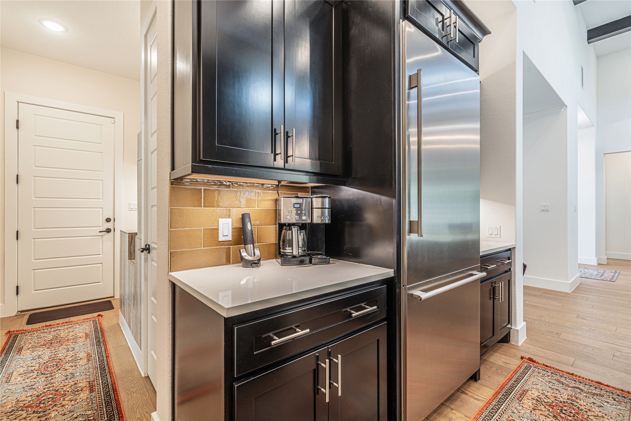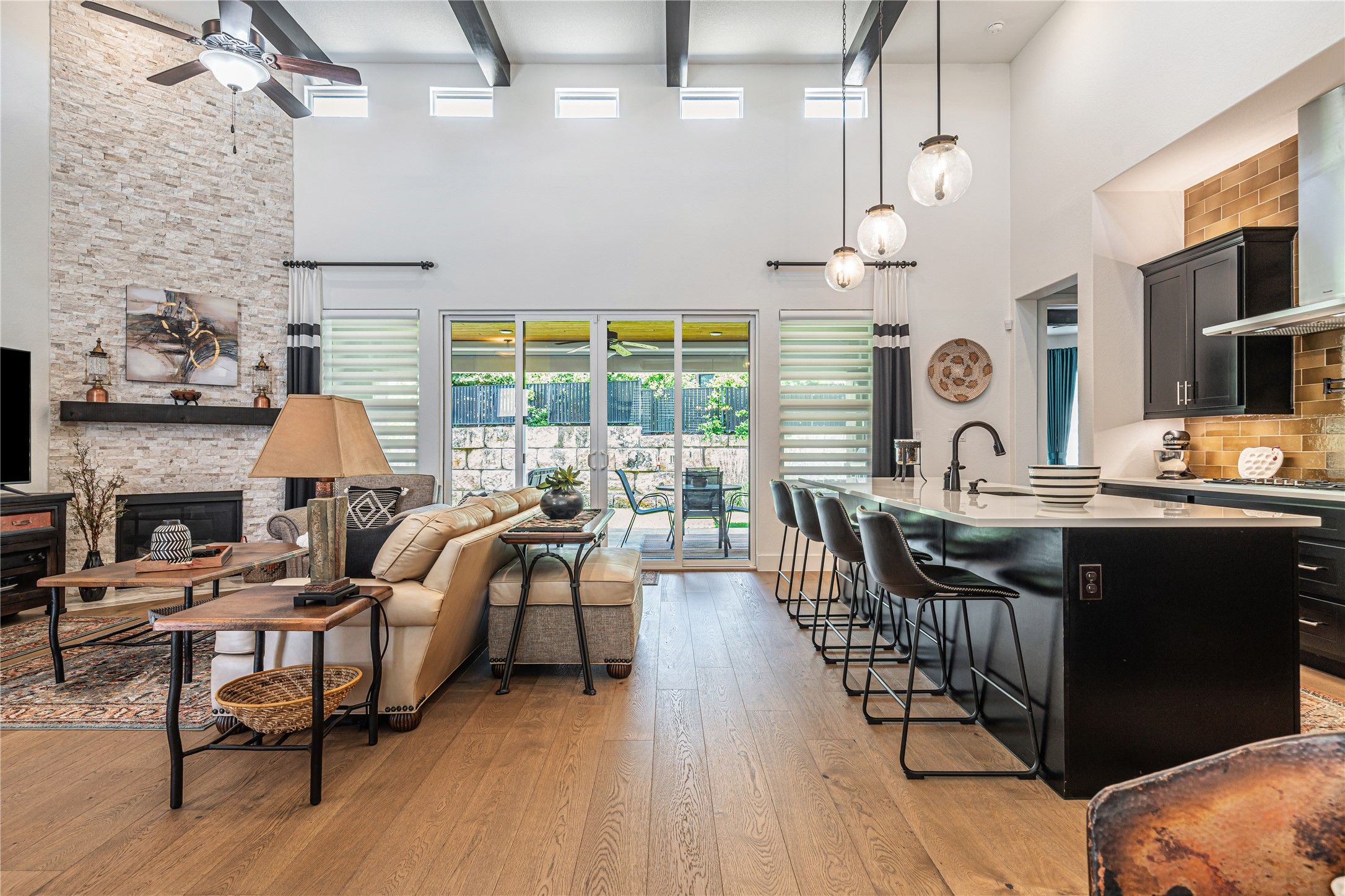 - Beamed Ceilings, Breakfast Bar, Built-in Features, Open Beams/Beamed Ceilings, Ceiling Fan(s), Coffered Ceiling(s), Eat-in Kitchen, High Ceilings, Kitchen Island, Main Level Primary, Multiple Primary Suites, Multiple Primary Bathrooms, NoInteriorSteps, Open Floorplan, Pantry, Quartz Countertops, Recessed Lighting, Sound System, Study, Smart Thermostat, Wired for Data