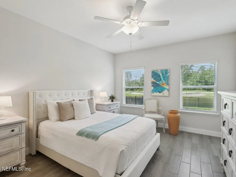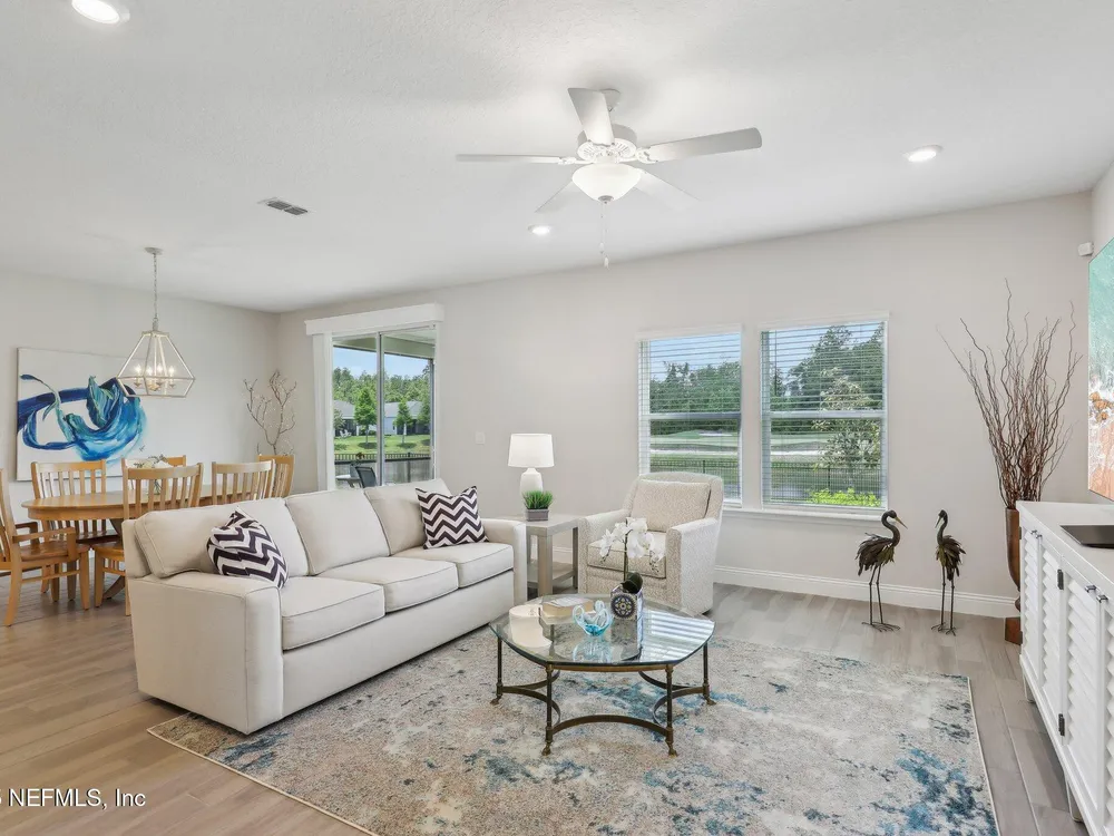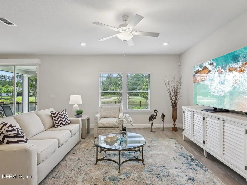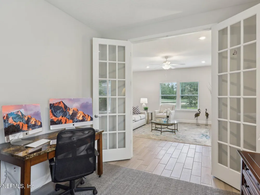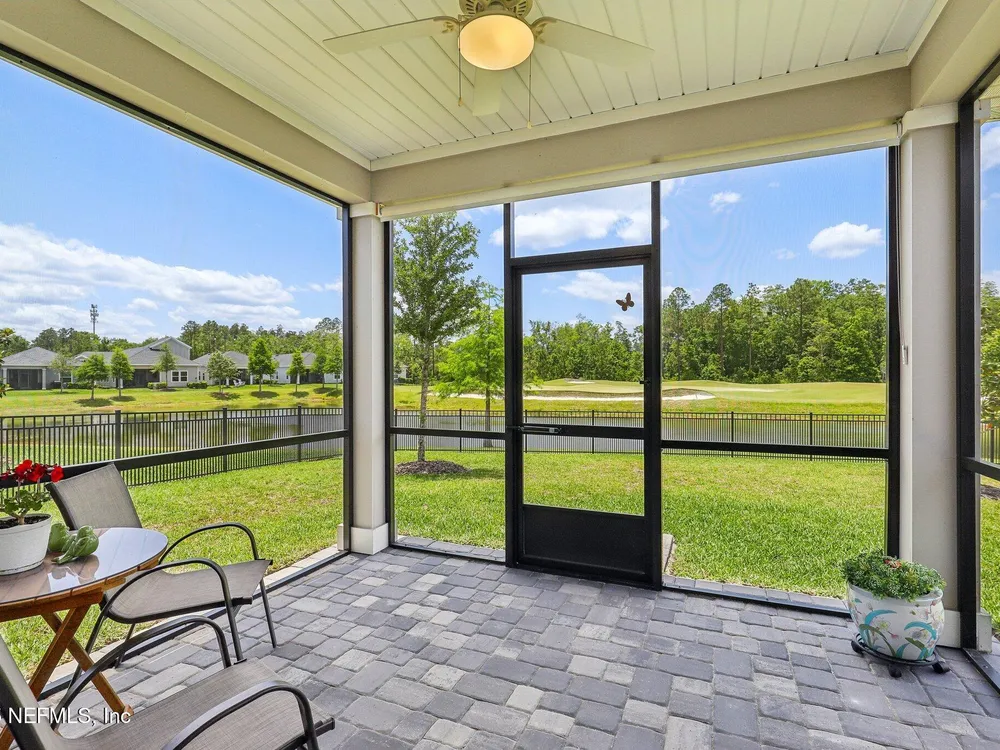 Welcome to St Johns County's premier active adult golf community, Stillwater. Nestled on a premium cul de sac lot, offering water-to-golf views of the 2nd hole. Home features a bright, open floor plan with 2 spacious bedrooms, an office with French doors and wood look tile throughout. The kitchen boasts quartz counter tops, gas cook top and double ovens. Home features tankless hot water heater and water softer. Relax on large, screened lanai overlooking expansive fenced backyard with water and golf views. The HOA covers yard and common ground maintenance, providing time to enjoy the community's amenities including Bobby Weed Golf Course and a state-of-the-art Top Tracer driving range, Amenity Center and clubhouse, featuring a heated pool, tennis and pickleball courts, bocce, and a modern gym. The clubhouse hosts year-round events, with a full restaurant, bar and lounge. Located minutes to shopping, restaurants and entertainment.