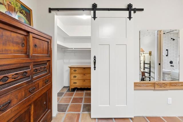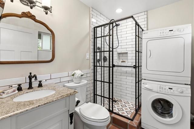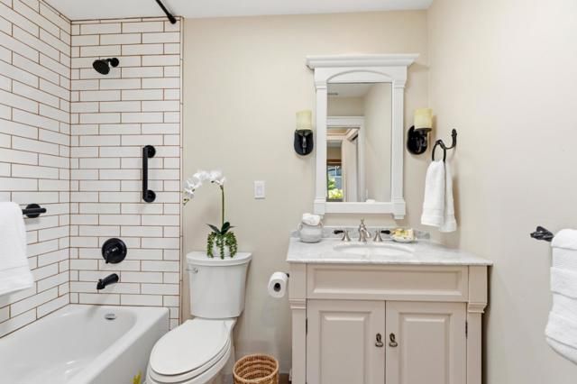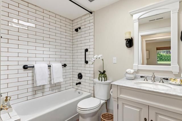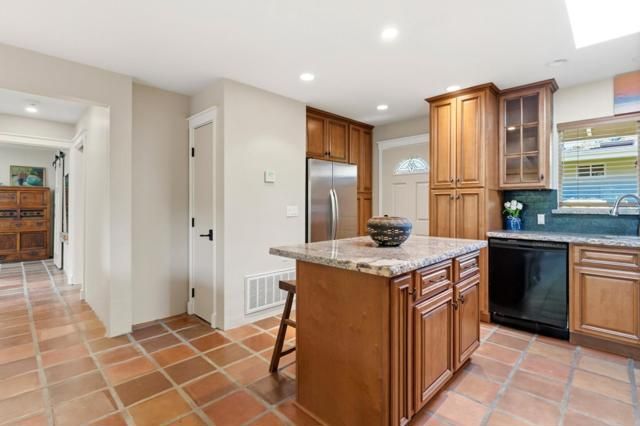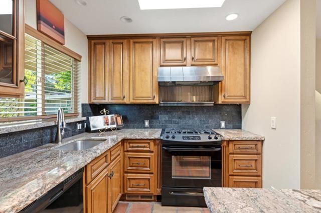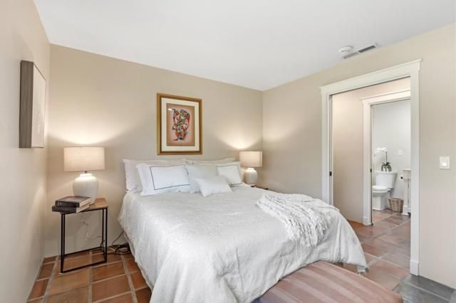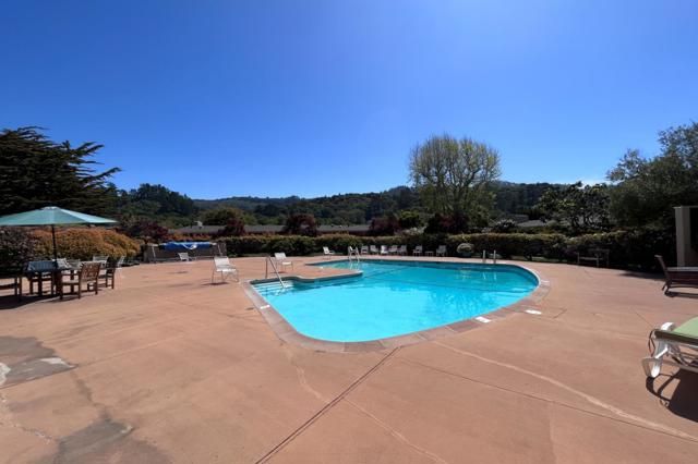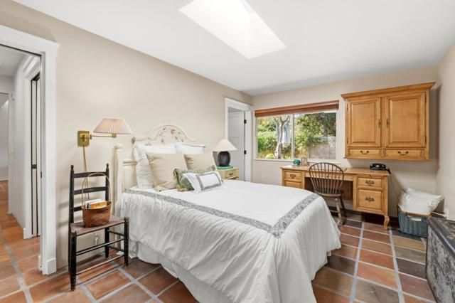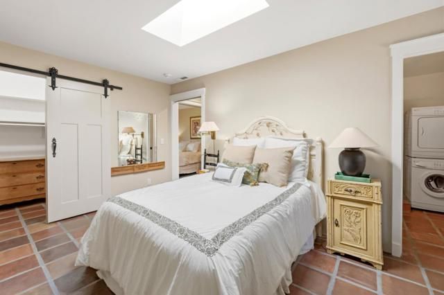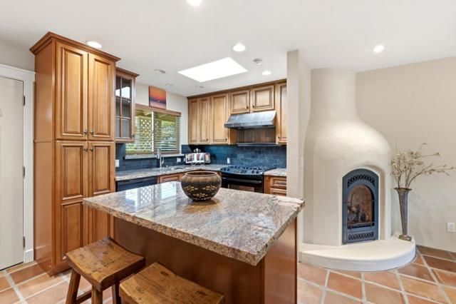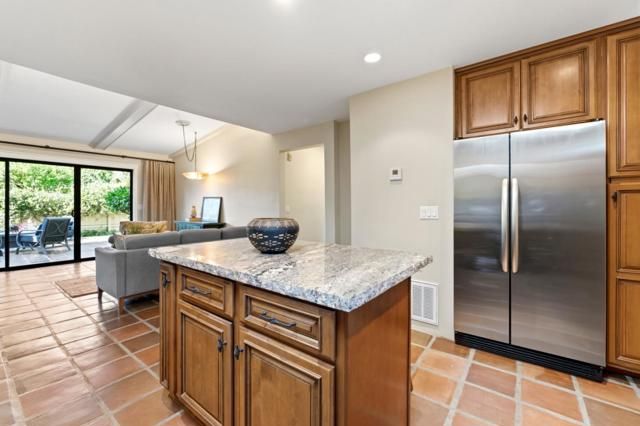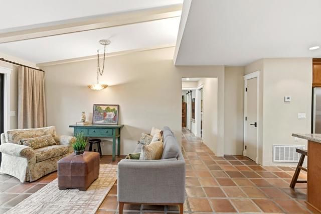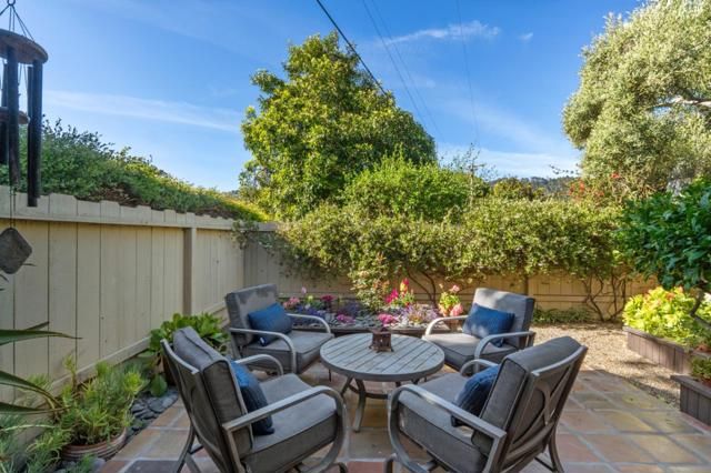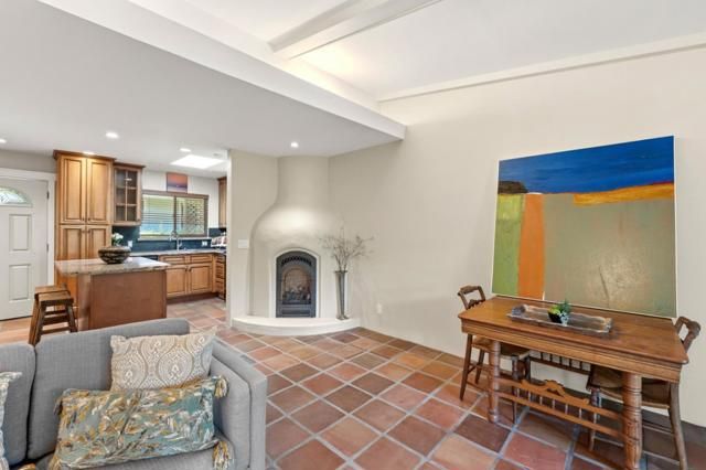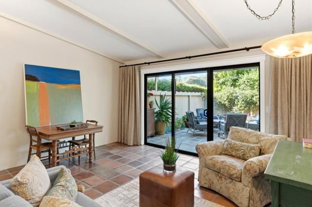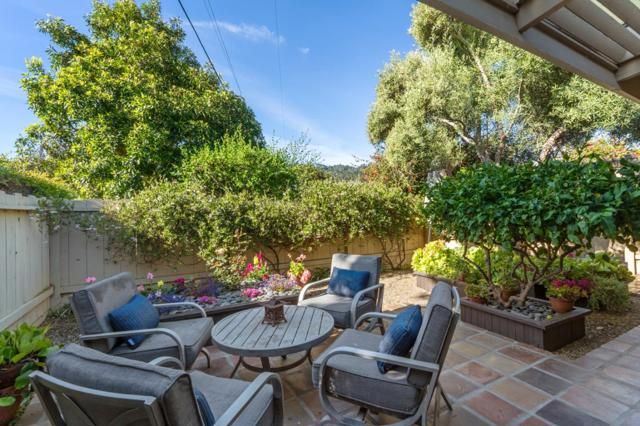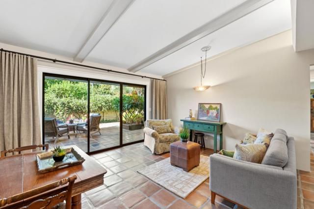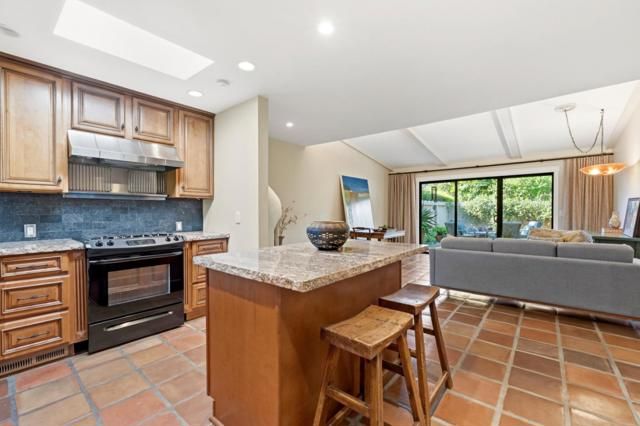 Desirable end unit offering excellent parking, a custom fireplace, & convenient indoor laundry. Fully remodeled in 2021, this thoughtfully designed home embraces seamless indoor-outdoor living, perfectly suited to Carmel Valley's ideal climate. Bask in the sunshine on your private patio, complete with a Meyer lemon tree, olive tree, and vibrant flower beds, or unwind beside the custom natural gas Kiva fireplace on cool evenings. Authentic handmade Saltillo pavers from Mexico flow throughout the interior & extend into the spacious patio, enhancing the home's sense of openness & livable space. The kitchen features chiseled-edge granite counter tops & gas range with a warming hood. Additional highlights include Mission-style wall texture, a large glass slider in the living room, three skylights, plus walk-in closets in both bedrooms. The Hacienda Carmel residents enjoy amenities such as a heated pool, restaurant, dog park, community garden, walking trails, library and wonderful people.