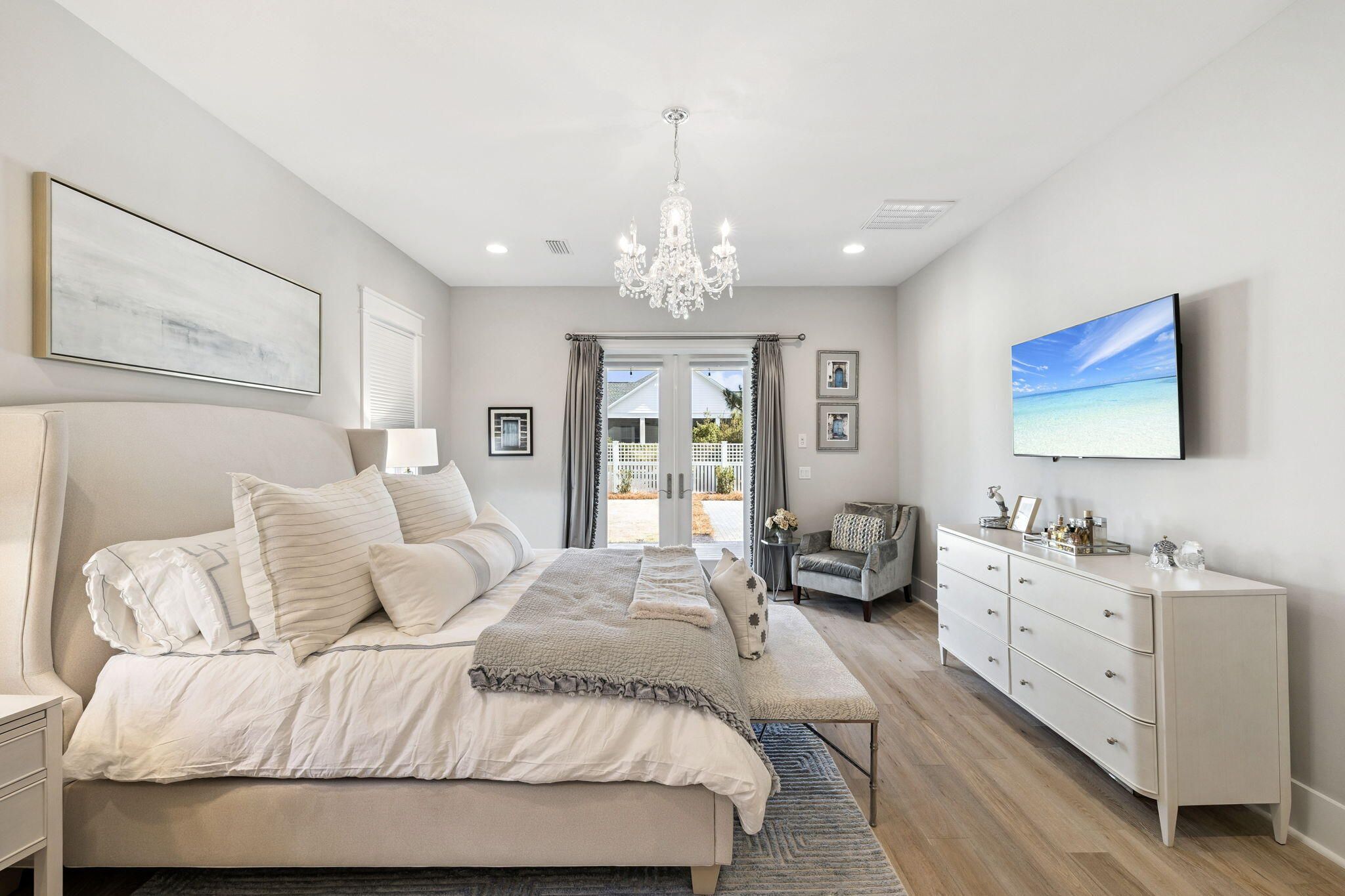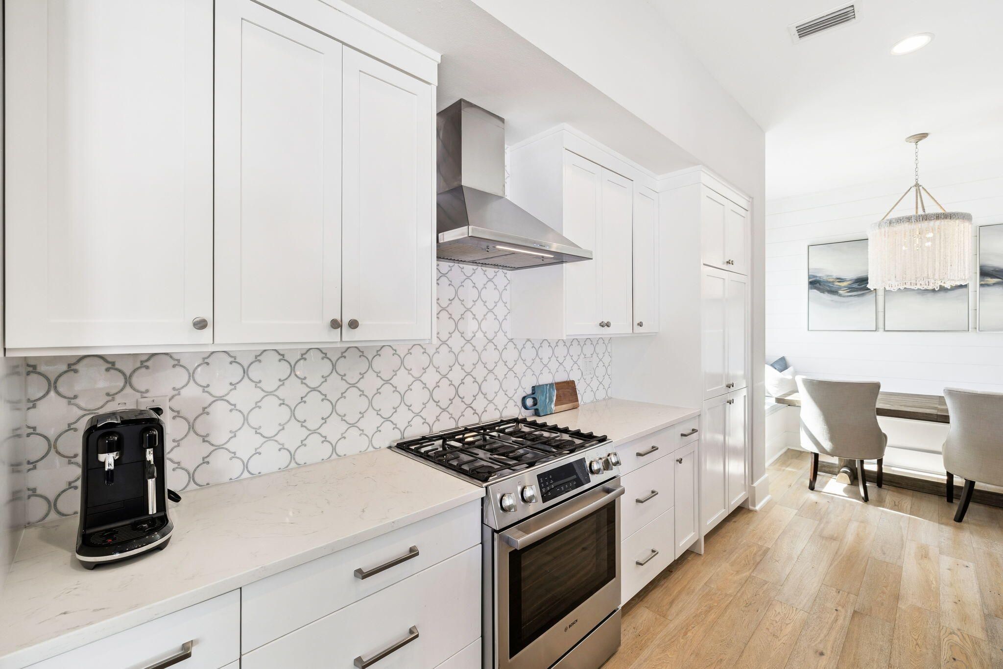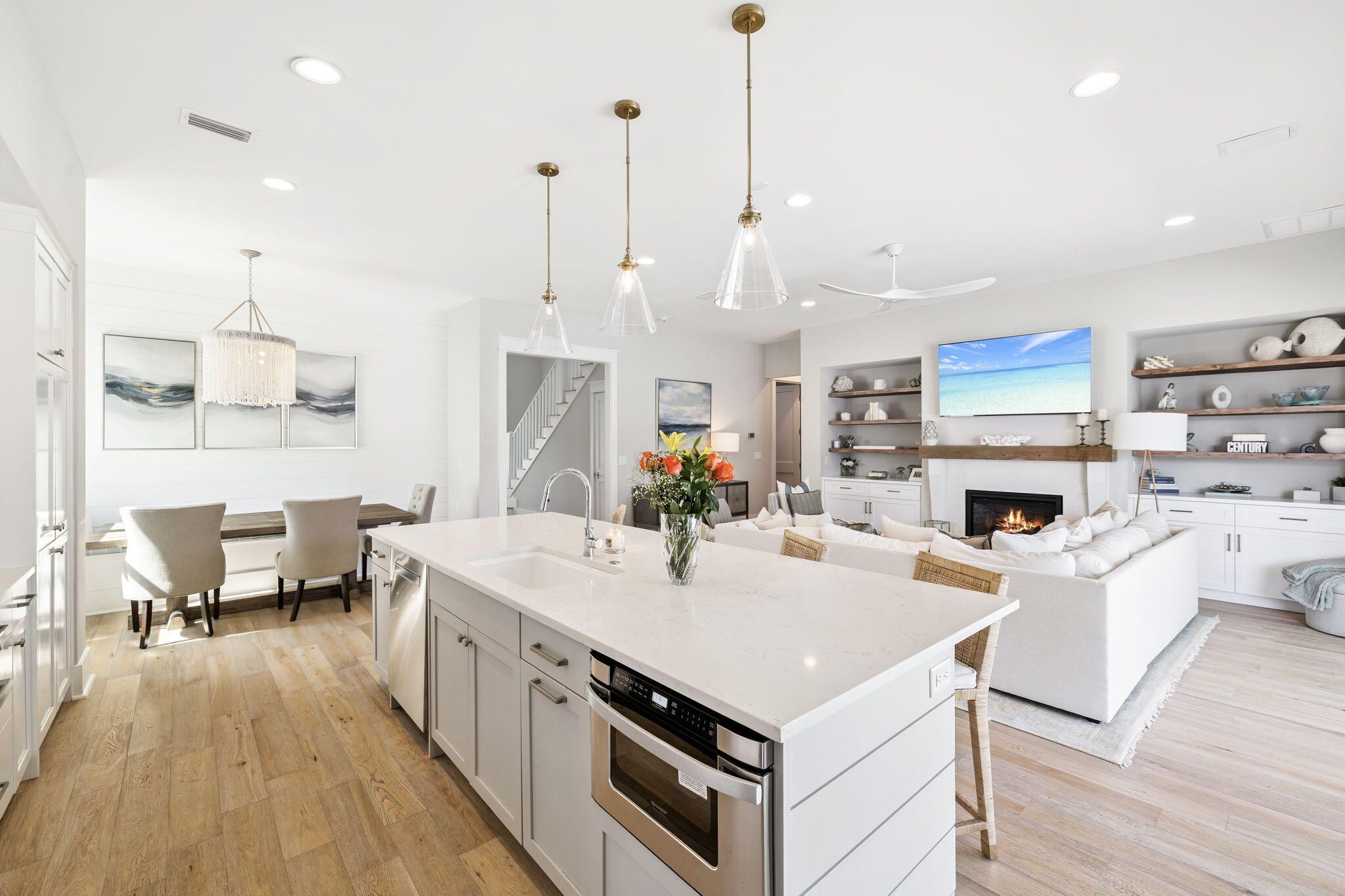 Discover refined coastal living in this Romair Suffolk at Watersound Origins. A dramatic foyer welcomes you into a sun-drenched living space with 20-foot ceilings, creating an immediate sense of scale and light. The open-concept floorplan flows from a chef's kitchen--featuring Bosch stainless-steel appliances, a striking 10-foot island with custom pendant lighting, and thoughtful finishes--to the dining area and great room, perfect for daily life and entertaining. The great room is anchored by a fireplace flanked by custom built-in bookcases and large sliding glass doors that open to a covered porch, seamlessly extending the living space outdoors. The adjacent dining area includes built-in bench seating with under-bench storage for smart, stylish functionality. Retreat to the luxurious master suite with French doors that open directly to the pool. The large master bathroom offers high-end finishes and a spacious shower equipped with a custom rain shower head. Custom California closets throughout the home provide organized, upscale storage. Additional highlights: - Quiet street with front yard facing neighborhood greenspace - 400 sq. ft. unfinished bonus space ready to be customized to buyer preferences (prime opportunity to increase value) - Move-in ready luxury with room to grow A superb combination of elegant design, built-ins, and customization potential -- ideal for buyers seeking a coastal lifestyle with thoughtful, high-end finishes.