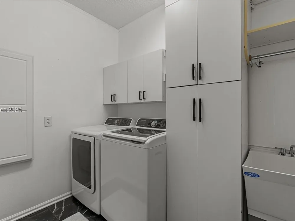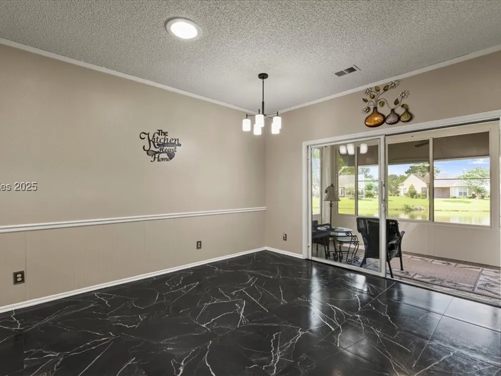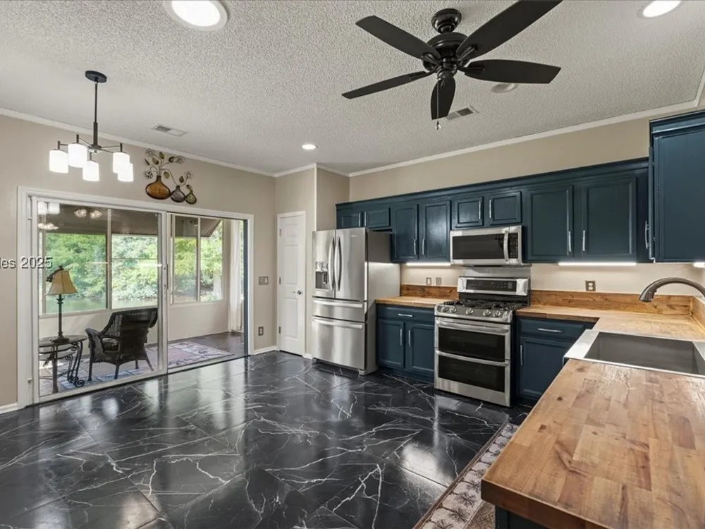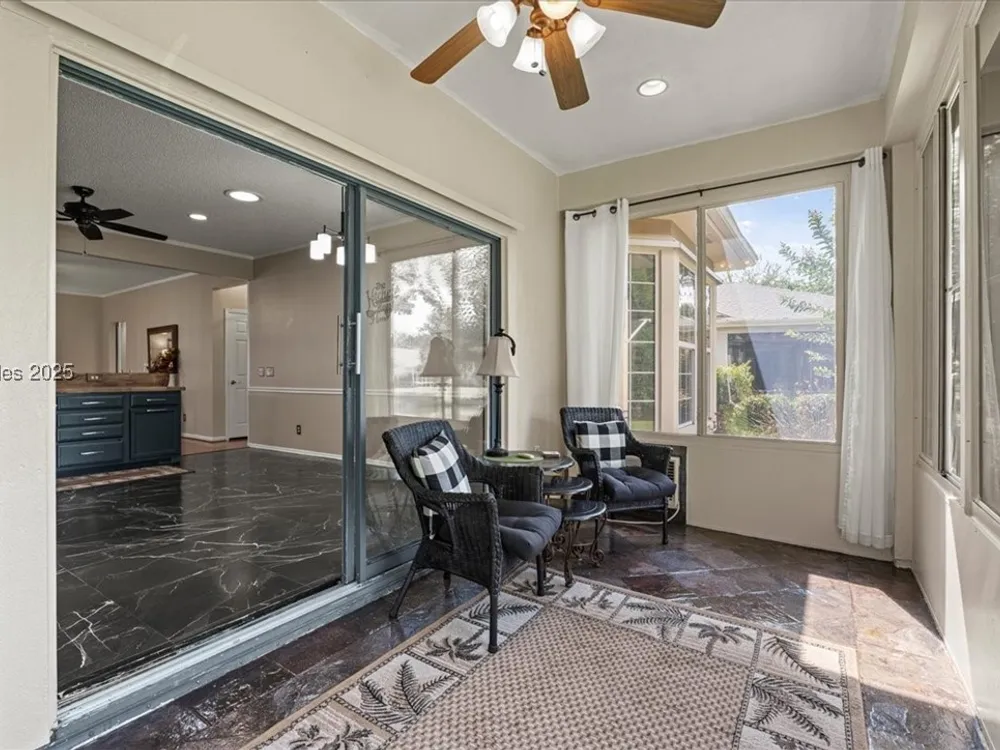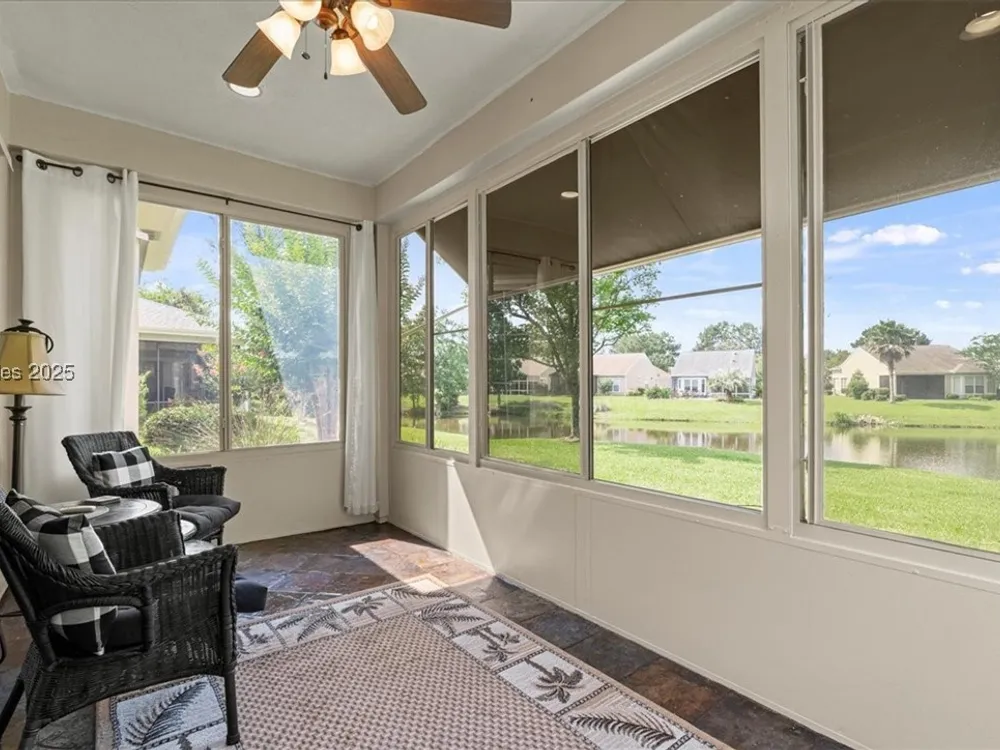 This renovated Primrose Model does not disappoint! This 2 Bedroom/2 Bath home is tucked away on a quiet cul-de-sac and includes a Flex Room that can be converted into a third bedroom. Upgrades include stunning tile detail in the primary suite and guest bathroom as well as the flooring and trendy butcher block countertops in the kitchen. Beautiful lagoon view can be seen from the Carolina/Sun Room off the kitchen. Sun City is a gated 55+ community that includes amenities such as 3 golf courses, fitness centers, pickleball and tennis courts, resort-style pools and over 150 clubs. CLEAN STUCCO REPORT