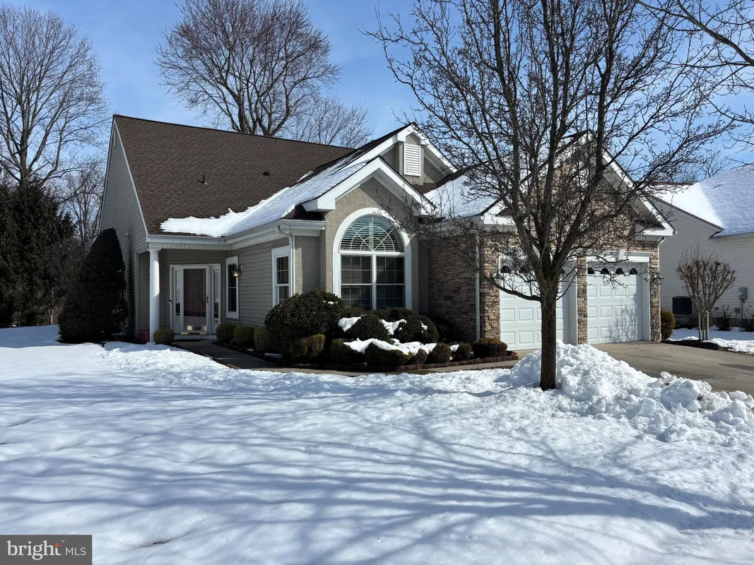 Welcome to 101 Ridgway Drive in the Desirable Greenbriar Horizons Active Adult Community in Florence Township. This beautifully designed and thoughtfully upgraded home offers impressive architectural detail, soaring ceilings, and an abundance of natural light throughout. The exterior features a striking stone façade, arched Palladian window, covered entry, and professional landscaping that create immediate curb appeal. Inside, rich hardwood flooring, crown molding, tray ceilings, and decorative columns define the open yet elegant layout. The dramatic great room showcases soaring ceilings and a full wall of oversized windows and transoms that overlook the private backyard. A gas fireplace anchors the space, creating a warm and inviting setting that flows seamlessly into the Kitchen & Breakfast Area. The Kitchen offers extensive cabinetry, granite countertops, stainless steel appliances, double wall ovens, gas cooktop, breakfast bar seating, and a bright dining area surrounded by windows. The layout is ideal for both everyday living and entertaining. The Formal Dining Room features detailed millwork and tray ceiling design, while French doors lead to a private Office/Den with custom built-ins, perfect for a home office or additional sitting room. The Primary Suite offers hardwood flooring, large windows, a custom walk-in closet, and a well-appointed en suite bath with dual vanities, granite countertops, soaking tub, glass-enclosed shower, and tile flooring. The 2nd Bedroom & Full Bath provide comfortable space for guests. Additional features include a Laundry room with cabinetry and utility sink, generous attic storage, and a two-car garage. The rear elevation showcases an impressive wall of windows and sliding doors leading to a paver patio and landscaped yard, offering privacy and a peaceful outdoor setting. Includes a one year home warranty for added peace of mind at closing. Residents of Greenbriar Horizons at Florence enjoy clubhouse amenities, walking paths, and a vibrant active adult lifestyle while remaining conveniently located near major roadways, shopping, and dining. Worth a Look!