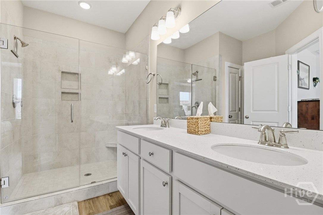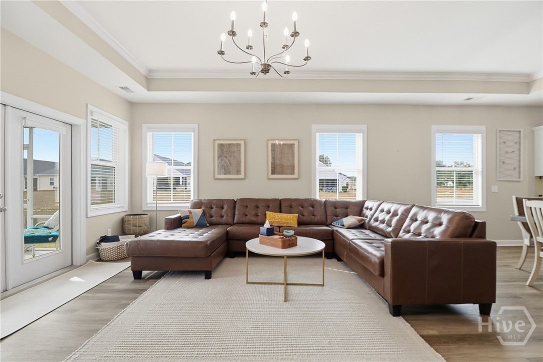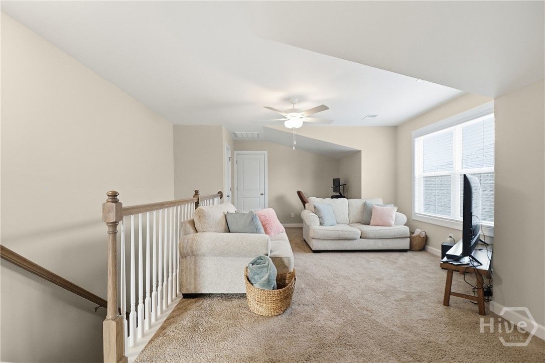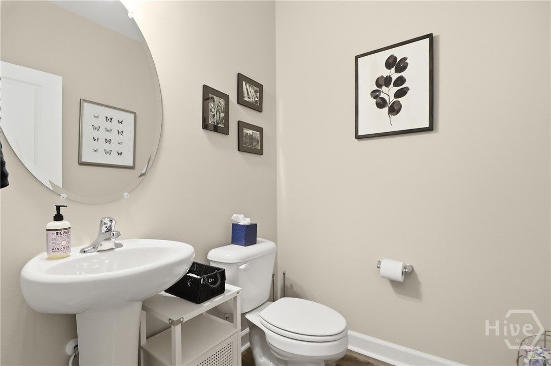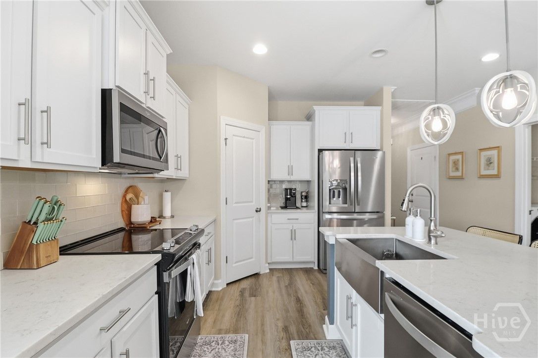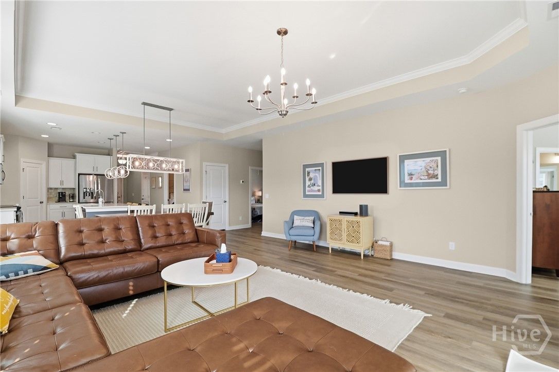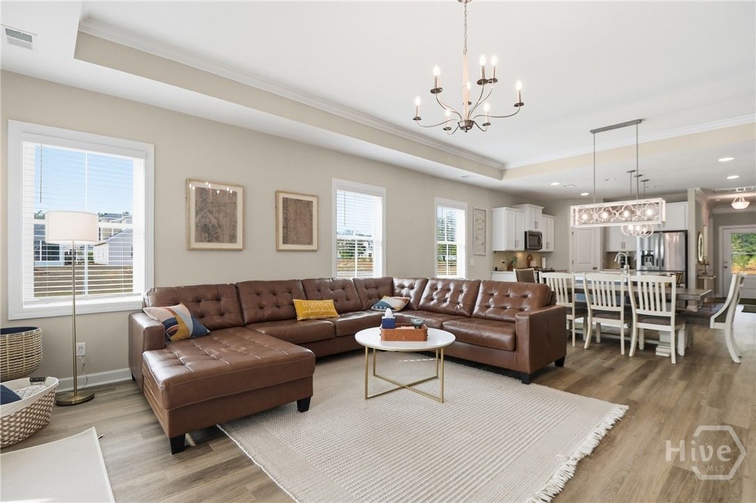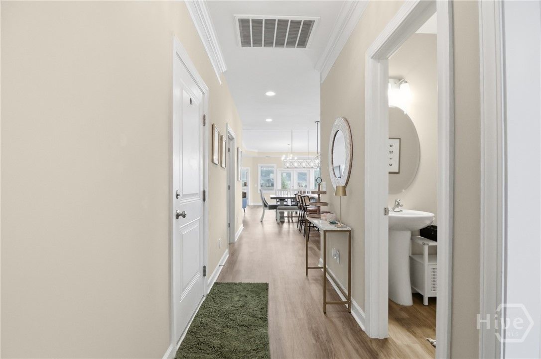Your Home Search Ends Here! This stunning 4-bed, 3.5-bath home offers over 2,300 sqft of thoughtfully designed living space. Upon entering, wood-grained floors guide you through the foyer entrance past a private home office and into an open-concept living area. The kitchen features 42" cabinets, an island with seating, quartz countertops, stainless steel appliances and a large walk-in pantry. Just beyond are the dining area and spacious living room filled with natural light. Two additional bedrooms share a full bath, while the rear master suite offers dual vanities, an oversized glass-tiled shower and a large walk-in closet. Just off the living room, open your french doors to a screened lanai to enjoy the panoramic water views. Upstairs includes an additional bedroom, full bath, and a large loft/flex space. Enjoy resort-style amenities including golf, clubhouse, fitness center, tennis courts, and pools. Conveniently located near shopping, the airport, and Savannah’s historic downtown.
