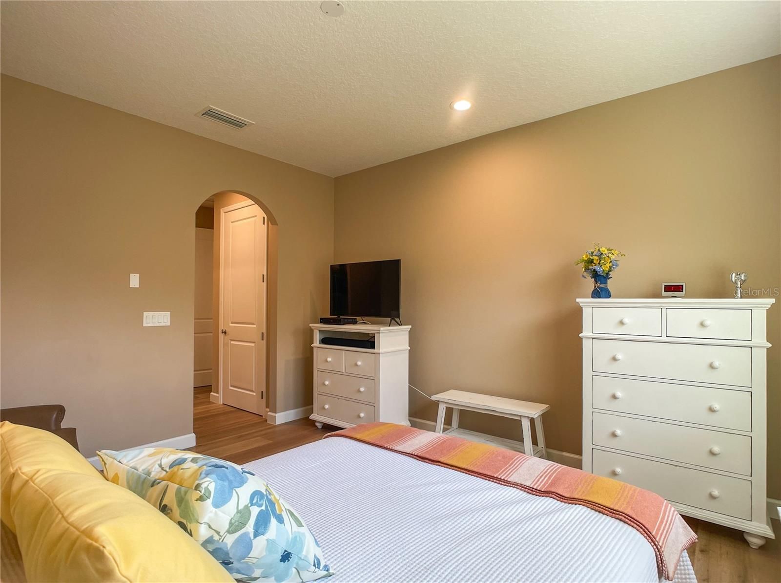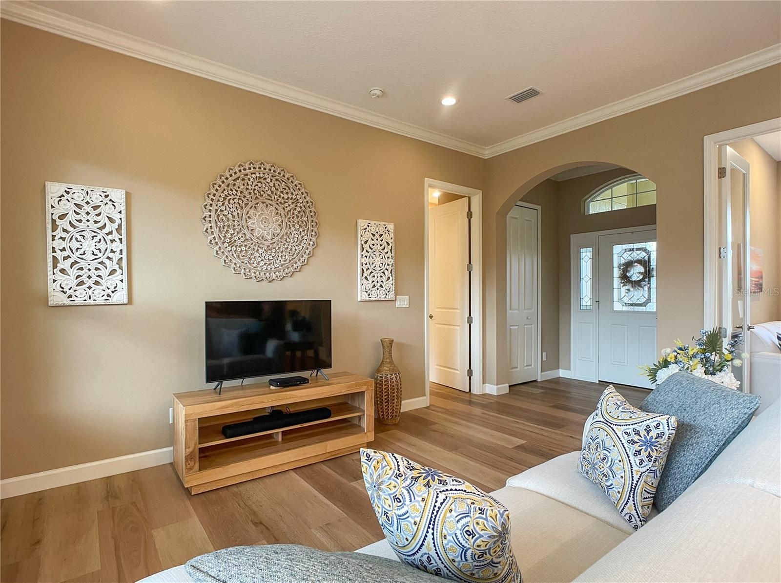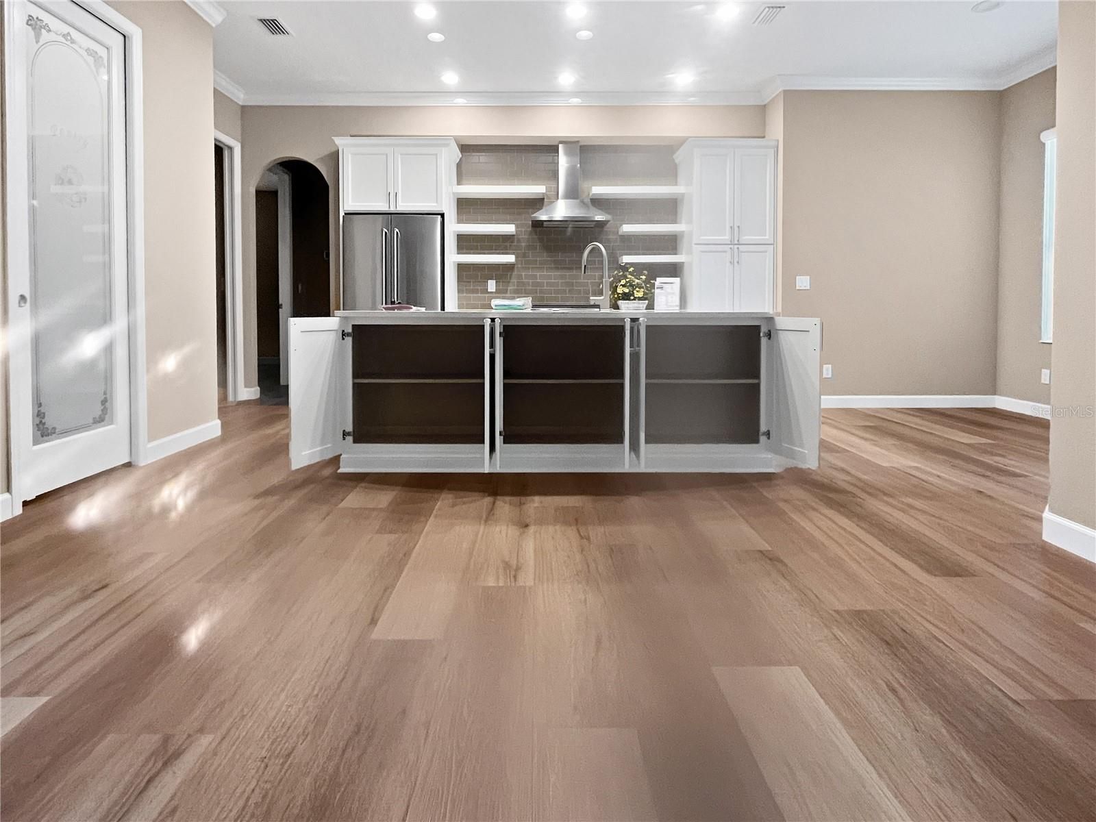 - Crown Molding, High Ceilings, Open Floorplan, Solid-Wood Cabinets, Thermostat, Walk-In Closet(s), Window Treatments