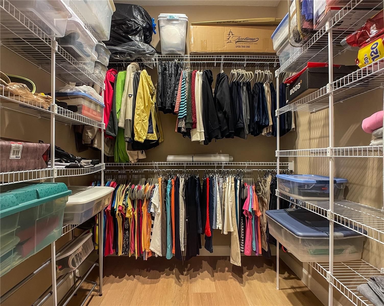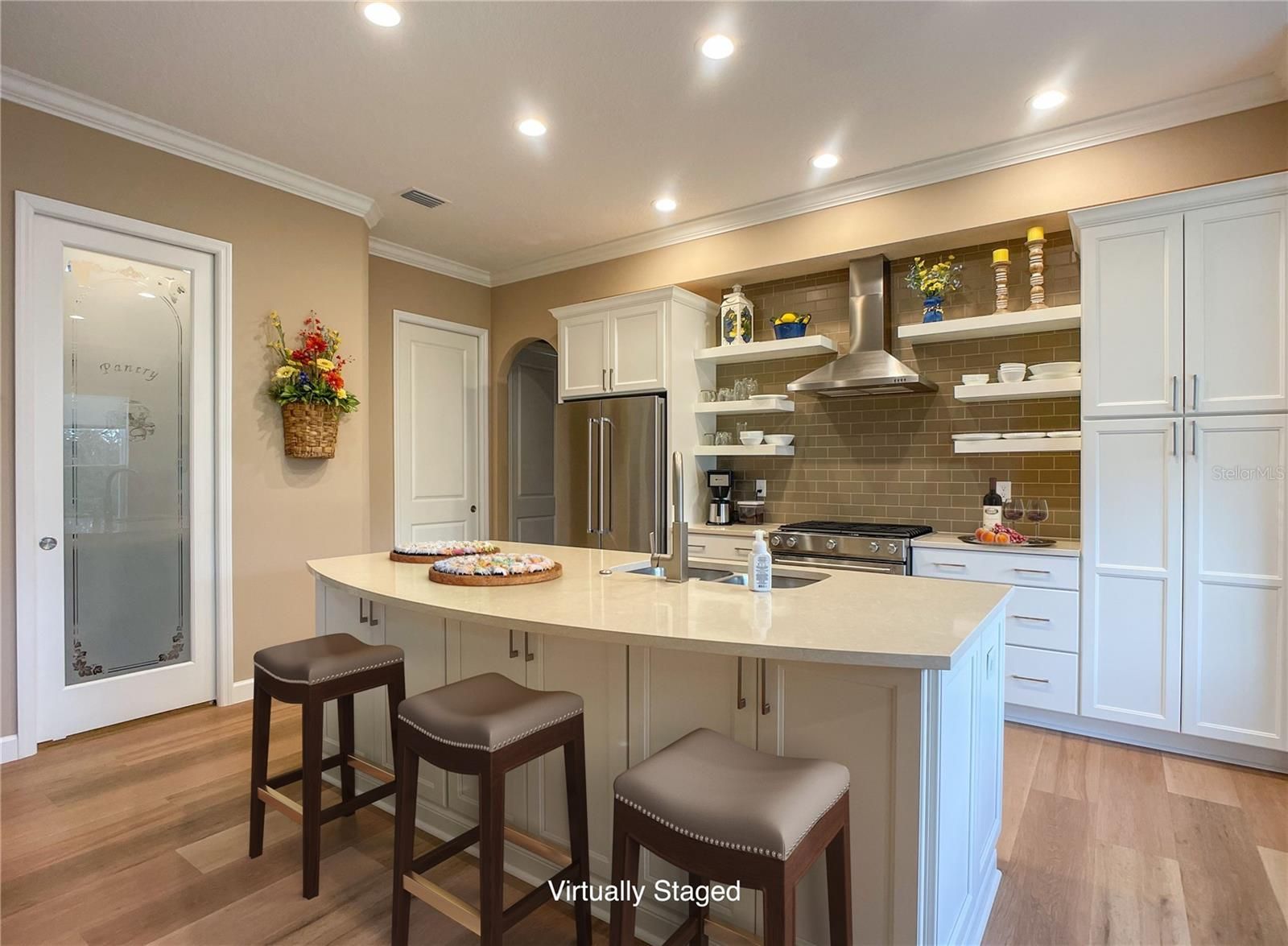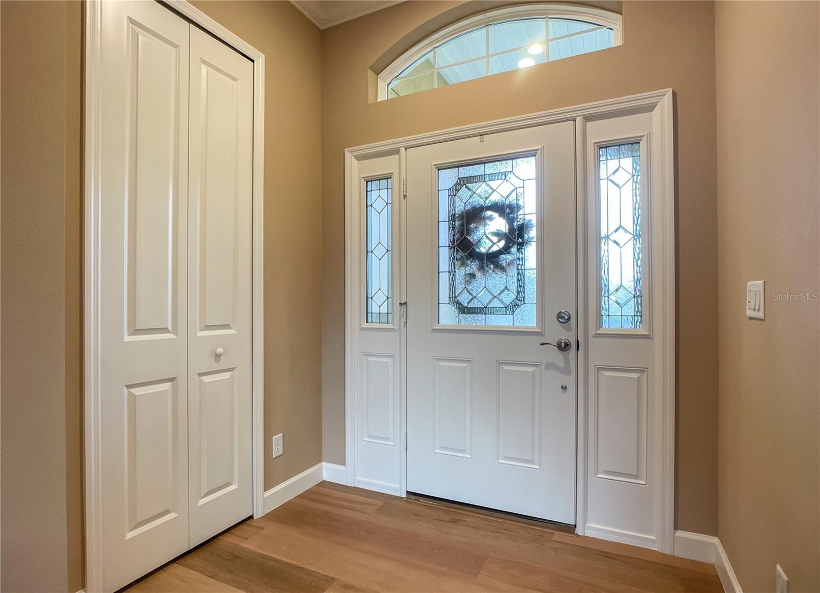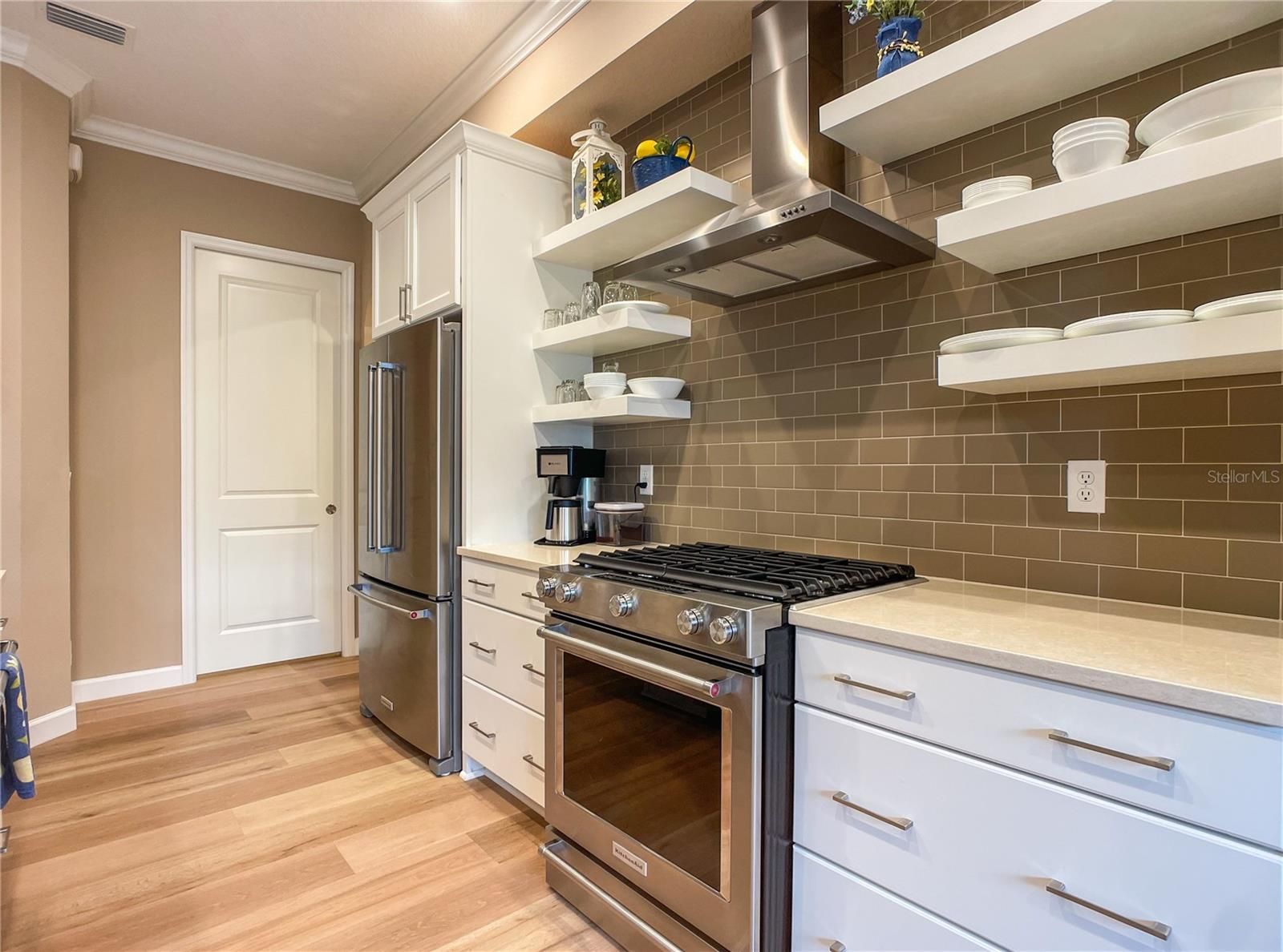 - Crown Molding, High Ceilings, Open Floorplan, Solid-Wood Cabinets, Thermostat, Walk-In Closet(s), Window Treatments