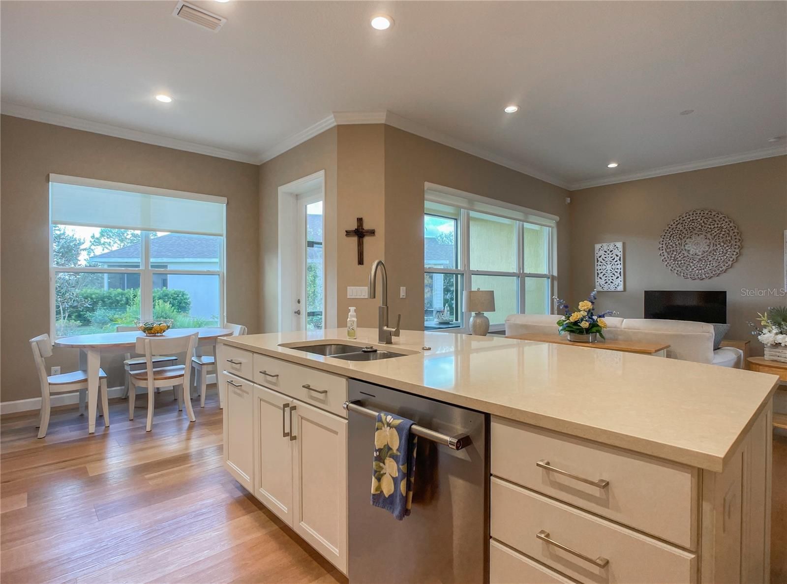 One or more photo(s) has been virtually staged. Backyard waterview is the waiting for you to live the Good Life in Lakes of Mount Dora! Just minutes from charming downtown Mount Dora, this beautifully appointed home is nestled on a meticulously manicured lot that’s sure to impress with a backyard waterview. This vibrant 55+ active community home offers resort-style living with amenities including pickleball, tennis, shuffleboard, swimming, corn hole, a fitness center, and even RV/boat parking. Inside, you'll find custom finishes and high-end appliances in a kitchen designed for both everyday living and entertaining. Choose from bar seating, a cozy dinette, or a formal dining room, and enjoy the convenience of two pantries to store all your culinary essentials. The luxurious owner's suite features three spacious closets, a spa-like ensuite with a soaking tub and walk-in shower—your personal retreat at the end of each day. Two additional guest bedrooms and a full bath are located on the opposite side of the home, offering privacy and comfort for visitors. Additional premium features include: GENERAC WHOLE HOME GENERATOR, tankless water heater, gas range, dryer, and heating, blown-in wall insulation, Termite bond, water filtration system, and security system. Don't miss your chance to own this exceptional home in one of Central Florida's most desirable 55+ communities. Schedule your private showing today and experience the lifestyle you deserve!
