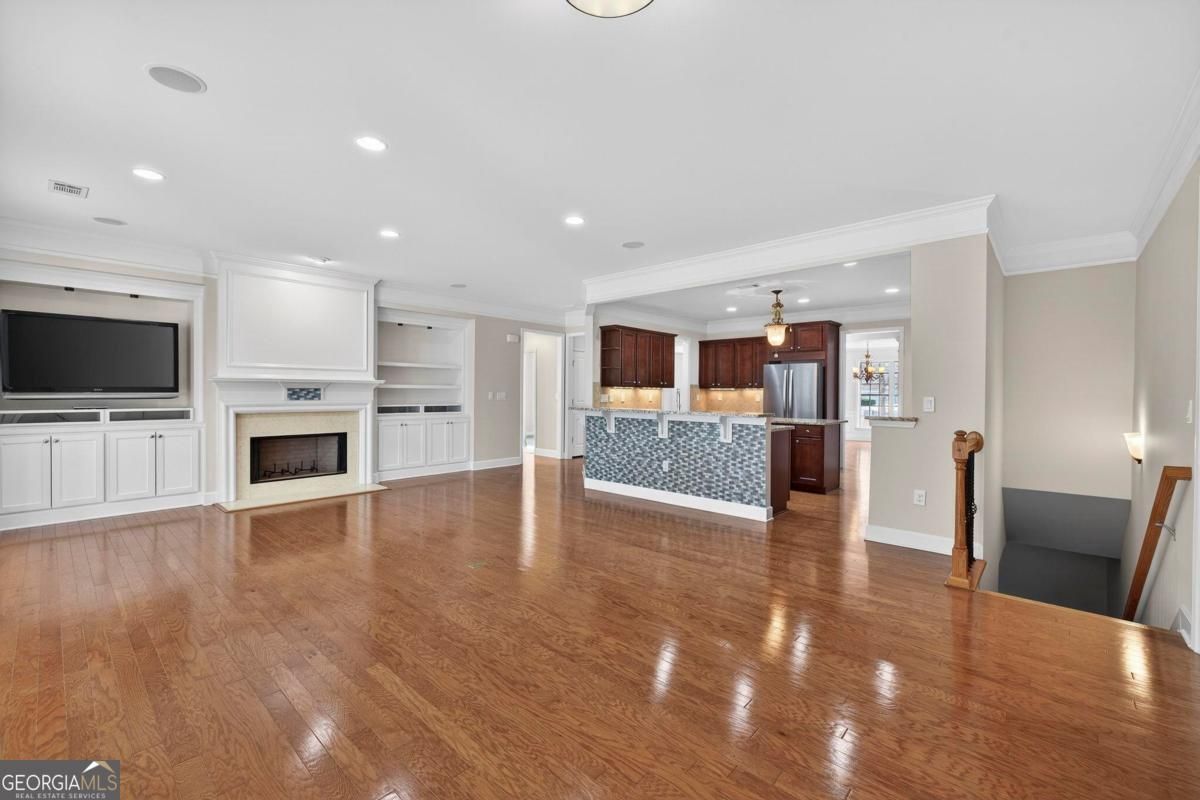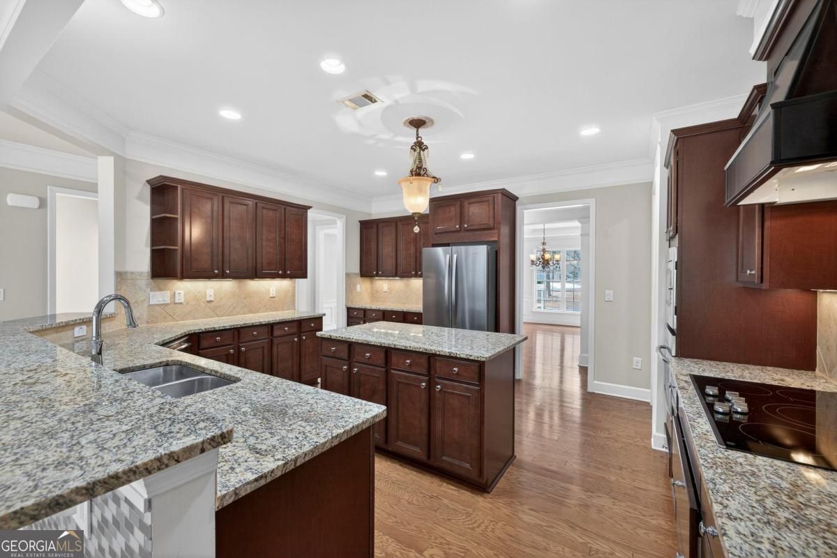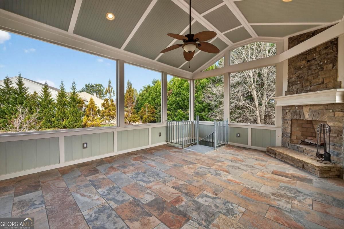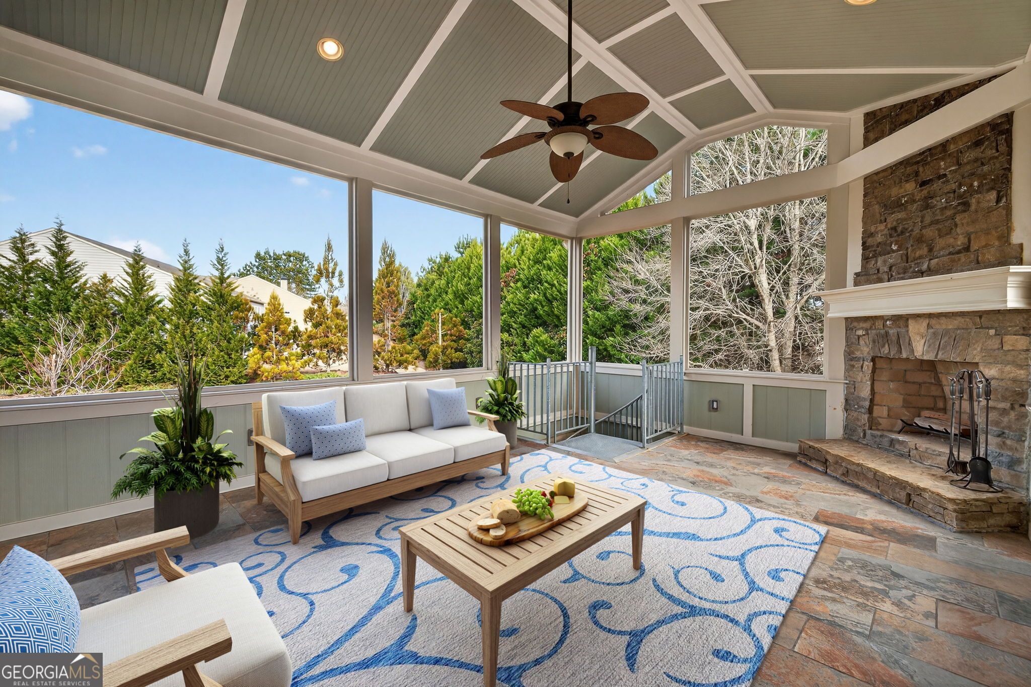 Rare and highly desirable Del Webb Morningside plan with a fully finished terrace level offering 4 bedrooms and 4.5 baths, ideally situated on a quiet cul-de-sac with green space in front and mature trees behind for privacy and peaceful views. Designed with both connection and independence in mind, this home offers a rare opportunity for two separate living quarters under one roof. The main level features a spacious living room with custom built-ins and fireplace, a light-filled sunroom, and a gourmet kitchen with center island, walk-in pantry, stainless appliances, and custom glass tile breakfast bar-perfect for everyday living and gathering. A private office or flex room adds additional versatility. Two screened porches with stone fireplaces-connected by a spiral staircase-create welcoming spaces for family time while still allowing everyone room to unwind. The fully finished terrace level functions as a true second living space, complete with a massive great room, additional sunroom, and a full kitchen with standard-size refrigerator, cooktop, and ample cabinetry. An en suite bedroom with walk-in closet, along with additional flex and hobby rooms featuring custom built-ins, allows the lower level to live comfortably and independently-ideal for extended family, adult children, in-laws, or long-term guests. Additional highlights include an extended two-car garage with epoxy flooring and attic storage, two HVAC systems, whole-house water filtration, and meticulous maintenance throughout. With Del Webb's resort-style amenities, clubhouse, fitness center, pools, pickleball, tennis, walking trails, and lawn care all included in one HOA fee, this home provides the flexibility to live together-with space for everyone to feel at home.