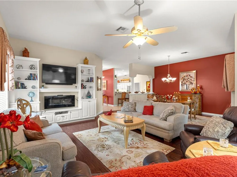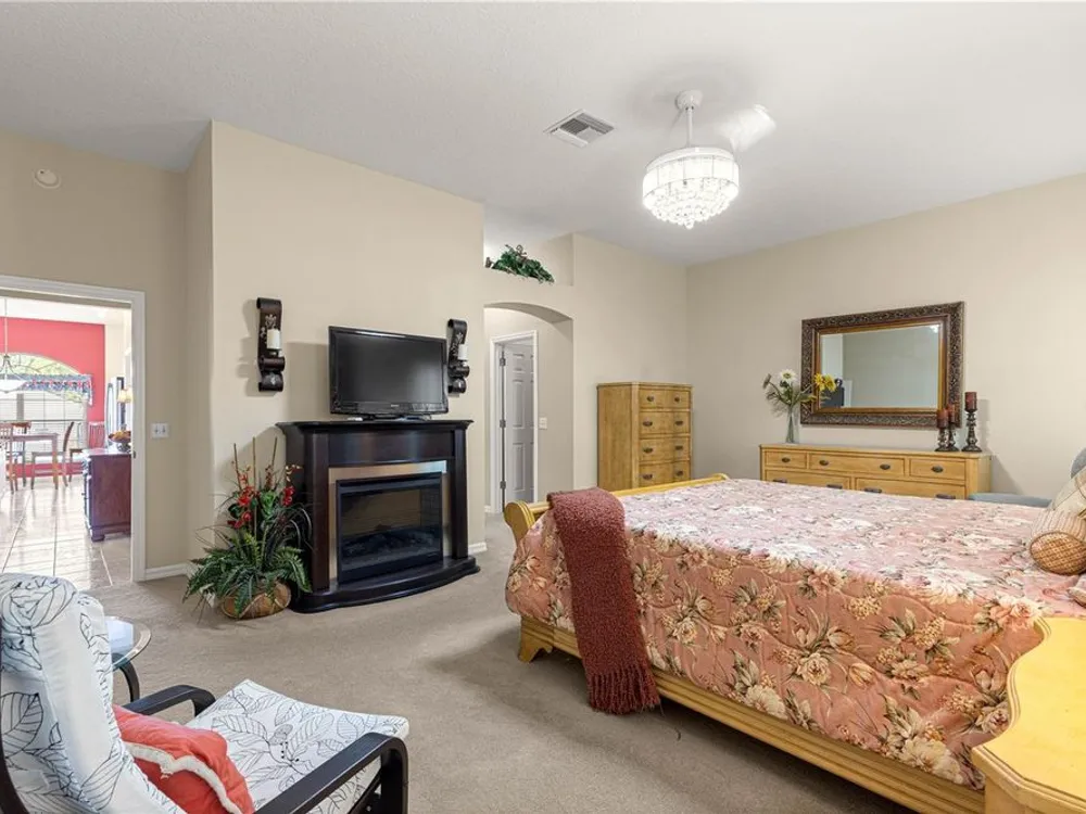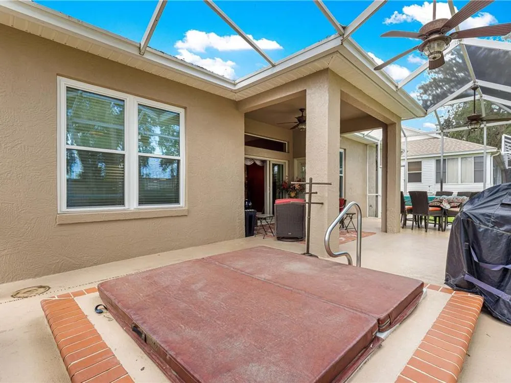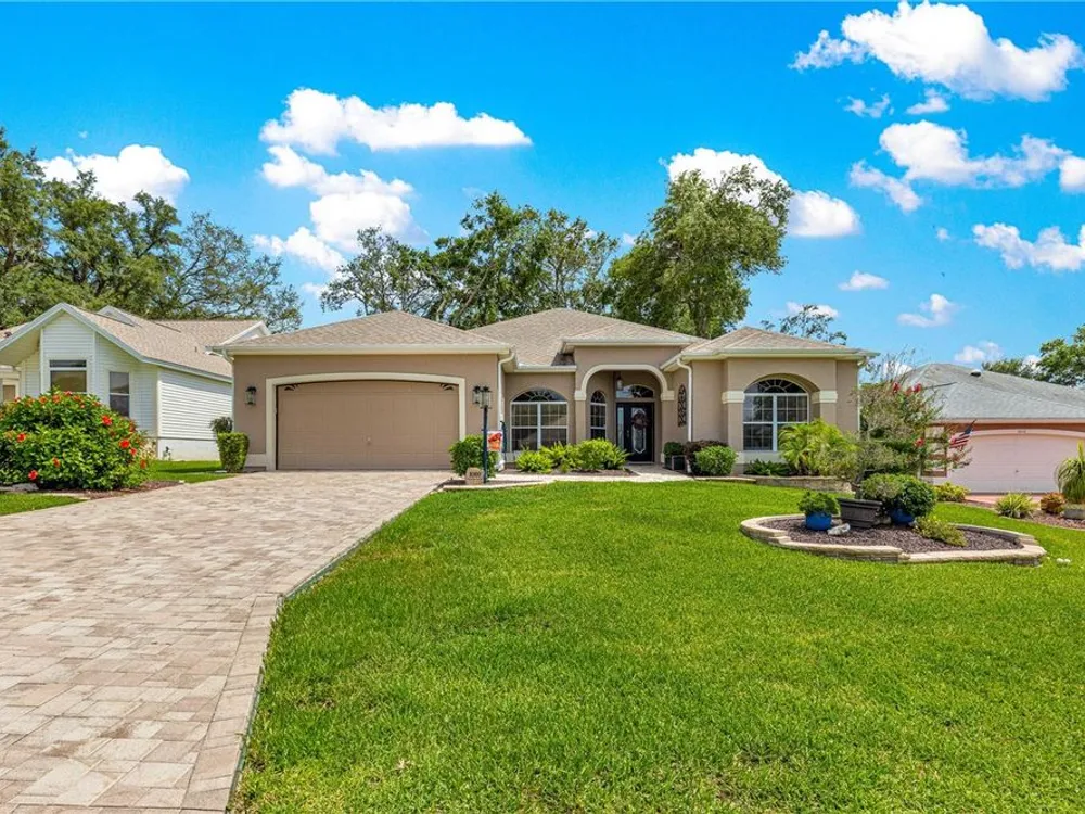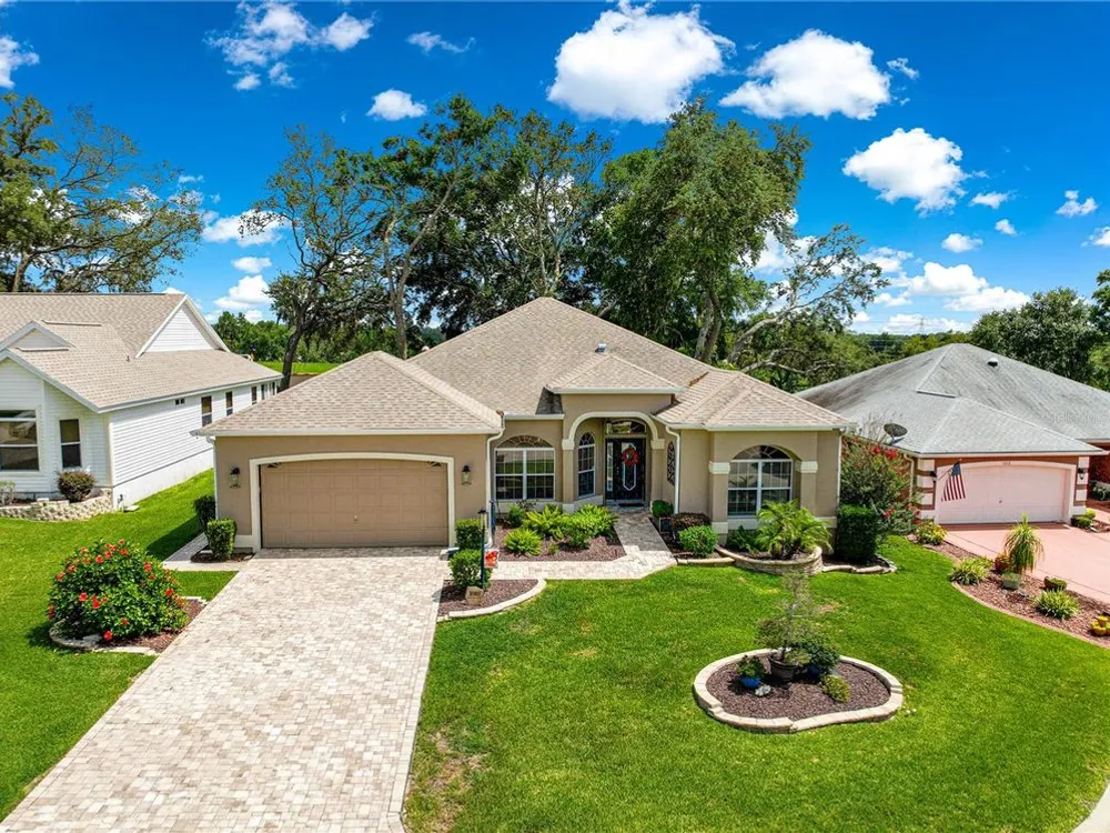 1 YEAR BROWARD FACTORY WARRANTY INCLUDED***BOND PAID!!! ROOF & HVAC 2017!! Welcome to the charming village of La Zamora, where this beautiful Premier Rancho Mirage model awaits you! Ideally situated between Spanish Springs and Lake Sumter Landings, this home offers the perfect blend of convenience and tranquility. With its inviting curb appeal, highlighted by a brick-pavered driveway, lush landscaping, and a peaceful cul-de-sac location, the exterior is just the beginning. As you step inside, you'll be greeted by soaring 12-foot ceilings and a chef's dream kitchen, complete with stunning granite countertops, stainless steel appliances, and a movable island that adds both functionality and style. The spacious living room features a built-in entertainment center and an electric fireplace, creating the perfect ambiance for relaxation and unwinding. The primary bedroom is a true retreat, featuring a fandelier (a chandelier with a fan), dual closets, and a luxurious ensuite bath with dual sinks, a makeup vanity, a soaker tub, and a gorgeous walk-in shower with glass doors. The front guest bedroom offers a built-in desk, making it a versatile space for overnight guests or a home office. Step outside to the screened-in back porch, where you'll find new sliding glass doors, a built-in hot tub, and a covered area, perfect for enjoying year-round outdoor living. With updates including a 2017 roof, 2017 HVAC, and updated hot water heater, this home is move-in ready and a must-see! *** FURNITURE IS AVAILABLE SEPARATELY***