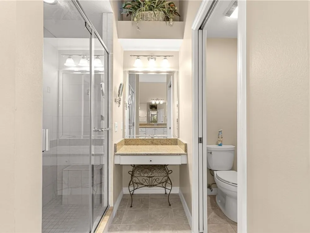 - Built-in Features, Ceiling Fan(s), Eat-in Kitchen, High Ceilings, Living/Dining Room, Open Floorplan, Main Level Primary, Split Bedrooms, Stone Counters, Walk-In Closet(s), Window Treatments