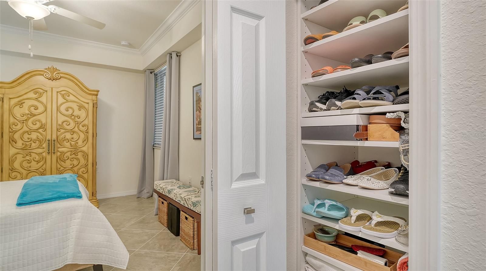 - Ceiling Fan(s), Crown Molding, Eat-in Kitchen, In-Wall Pest Control, Open Floorplan, Main Level Primary, Solid-Wood Cabinets, Stone Counters, Thermostat, Walk-In Closet(s)
