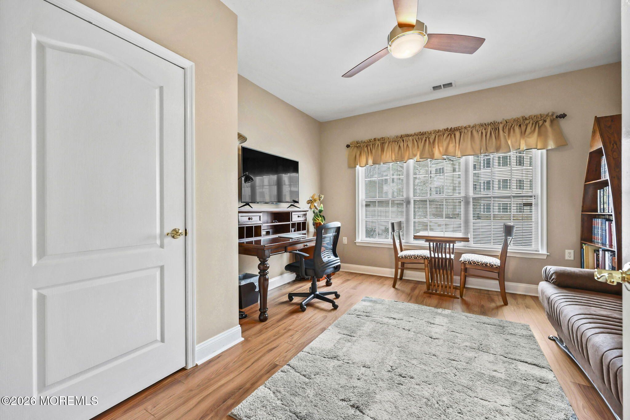 Rare opportunity to own this beautifully maintained first level Del Campo model in the highly sought after Plaza Grande premier 55+ community. This spacious residence offers an open and inviting layout highlighted by a dramatic octagon shaped living room that creates a unique and elegant focal point for entertaining. Gleaming hardwood flooring enhances the Entry, Living Room, and Dining Room adding warmth and sophistication throughout the main living areas. The gourmet Kitchen features custom 42 inch cabinetry, granite countertops, and stainless steel appliances providing both style and functionality for everyday living. Conveniently located near shopping, NYC transportation, and the Jersey Shore. Don't miss this exceptional opportunity.