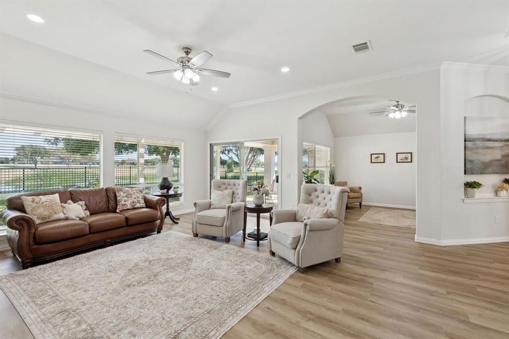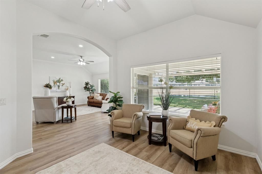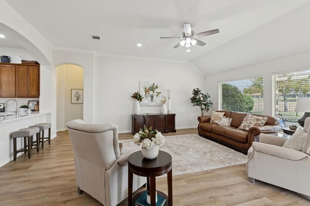 BEAUTIFULLY UPDATED HOME ON THE GOLF COURSE!This rare find in the prestigious 55+ community of Robson Ranch offers the perfect combination of comfort and resort-style living. Residents enjoy an active-adult lifestyle with world-class amenities, including clubhouse, restaurant and bar, pools, fitness center, golf (fee), and so much more.This popular 2 BR, 2 bath Oakmont floorplan is move-in ready and has been completely refreshed with new flooring, paint, and lighting, kitchen & bath updates and new exterior paint. The bright open-concept design offers spacious living and effortless entertaining.The foyer opens to a spacious living room with a wall of windows showcasing sweeping views of the golf course and pond. A sliding glass door leads to the covered patio and pergola, creating a perfect space for relaxing outdoor living. A flexible room just off the living area is ideal for a second living room, study, or hobby space.The updated kitchen is a showstopper with quartz countertops, a breakfast bar, stainless steel appliances, a new sink and faucet, abundant 42-inch cabinets, and a light-filled breakfast room. The primary suite offers a peaceful retreat with double-sink quartz vanity, a newly tiled shower, and a generous walk-in closet. The home also features a large laundry room with built-in cabinets and counters, plus an oversized two-car garage with room for a golf cart.Move-in ready and beautifully maintained (recent roof and HVAC), this home is the perfect place to enjoy the Robson Ranch lifestyle with amenities that include the arts & craft center, woodworking shop, walking trails, softball, pickleball, tennis, bocce, gardening center, dog park & library; plus an active calendar of social events and interest clubs. Enjoy the community and low-maintenance lifestyle Robson Ranch has to offer from the comfort of your move-in ready home.